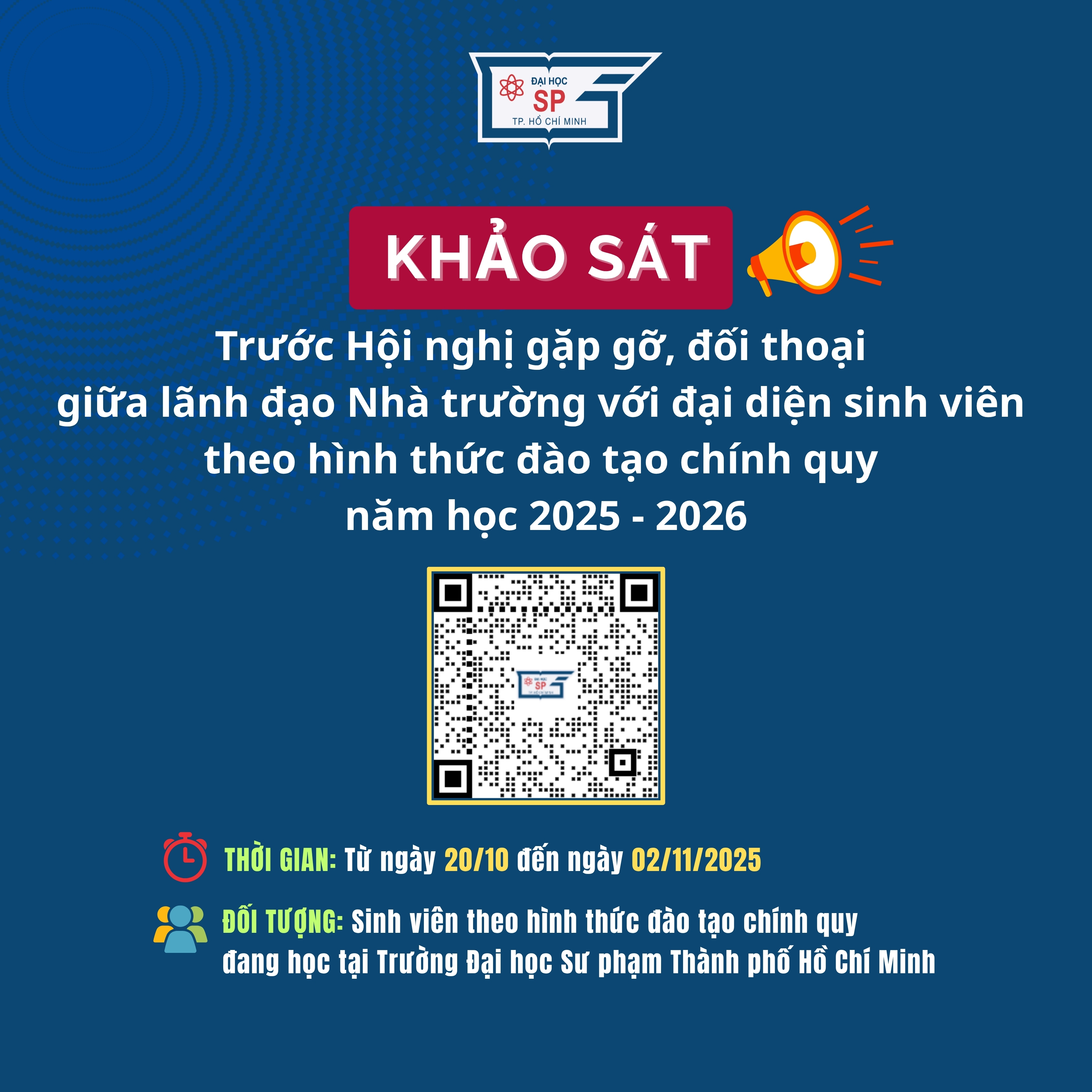Nhằm chuẩn bị tốt cho Hội nghị gặp gỡ, đối thoại giữa lãnh đạo Trường Đại học Sư phạm Thành phố Hồ Chí Minh với đại diện sinh viên theo hình thức đào tạo chính quy năm học 2025 - 2026, Nhà trường triển khai khảo sát ý kiến sinh viên về các nội dung liên quan đến công tác học tập, rèn luyện và các hoạt động hỗ trợ người học.