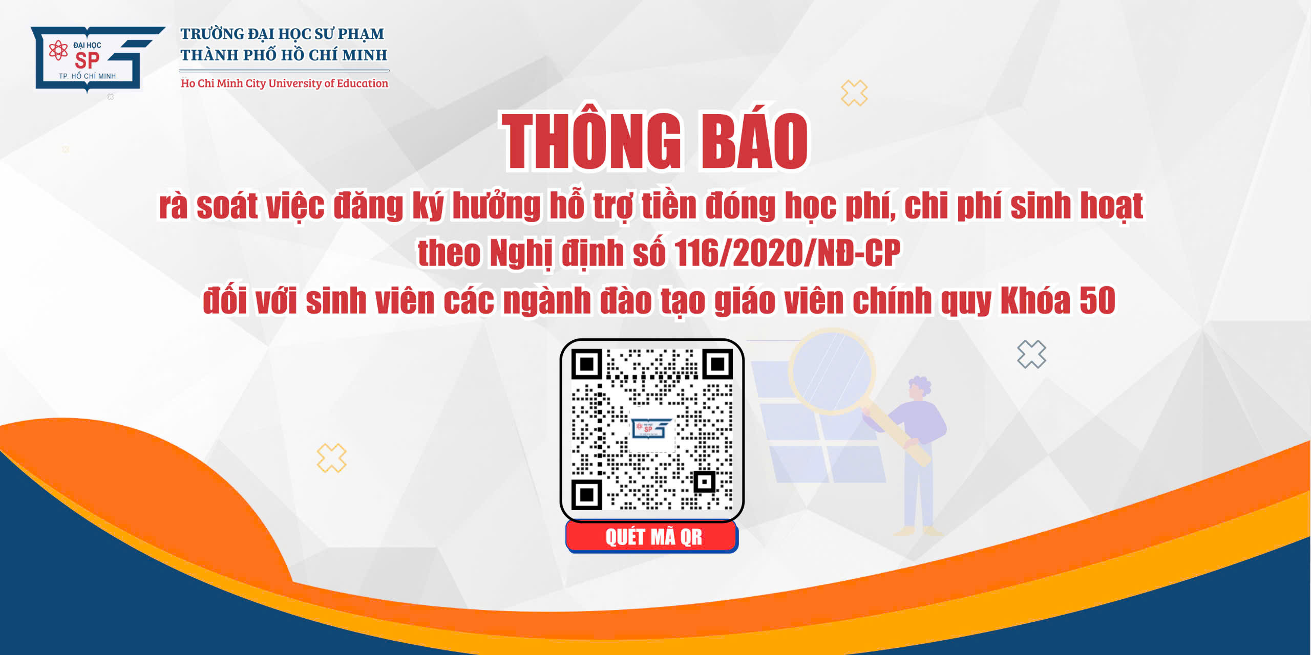 Thực hiện Nghị định số 116/2020/NĐ-CP, sinh viên chỉ được đăng ký 01 lần vào đầu khóa học. Để đảm bảo quyền lợi của sinh viên, đối khớp các thông tin đăng ký hưởng hỗ trợ tiền đóng học phí, chi phí sinh hoạt đối với sinh viên sư phạm theo Nghị định số 116/2020/NĐ-CP đối với sinh viên các ngành đào tạo giáo viên chính quy Khóa 50, Phòng CTCT&HSSV đề nghị sinh viên thực hiện rà soát và phản hồi TRỰC TIẾP bộ phận phụ trách từ ngày ra thông báo đến 17g00 ngày 27/9/2024. Cụ thể như sau: