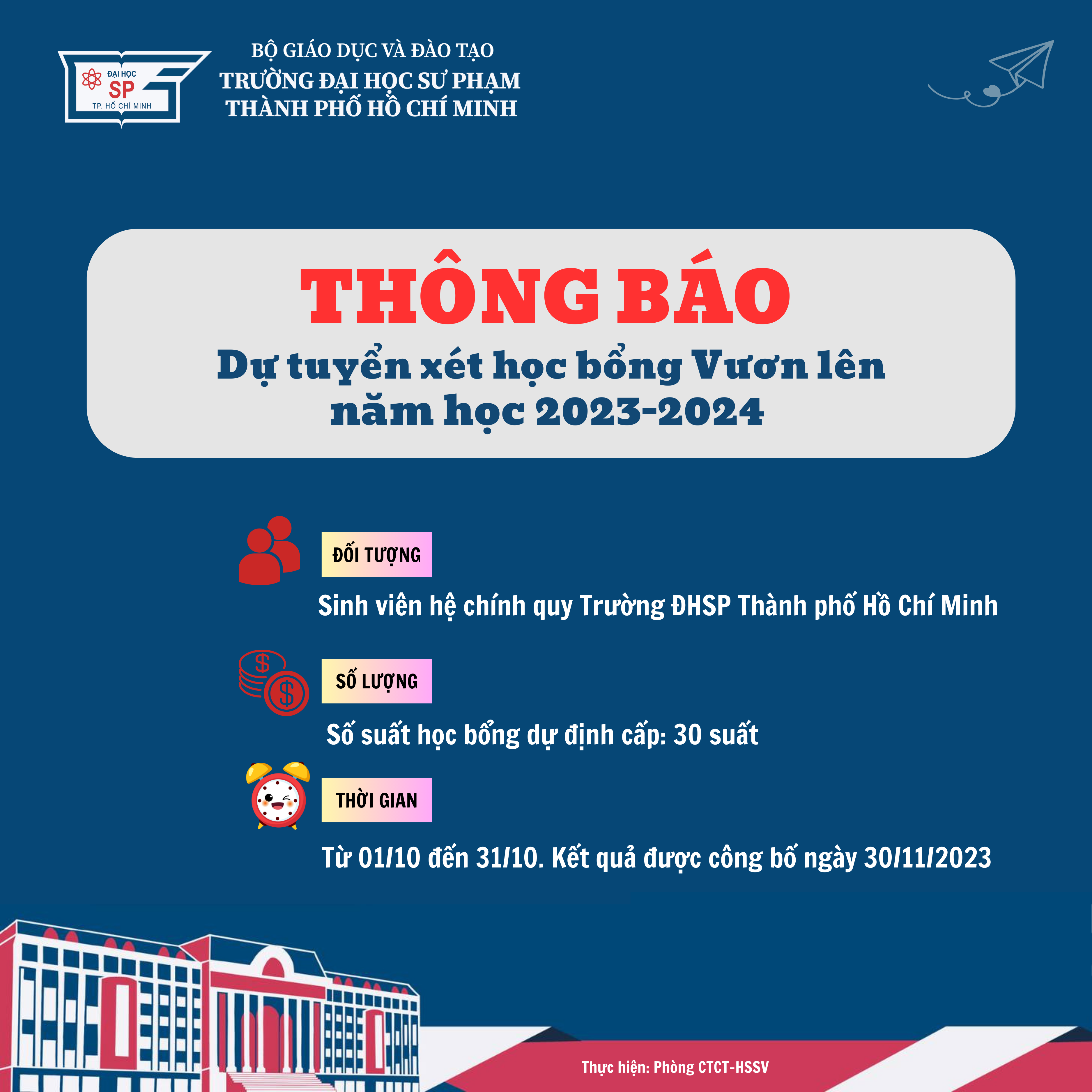 Phòng CTCT-HSSV, Trường Đại học Sư phạm Thành phố Hồ Chí Minh thông tin đến các bạn sinh viên của Trường về việc nộp hồ sơ xét Học bổng Vươn lên của Quỹ Khuyến học Đông Du.