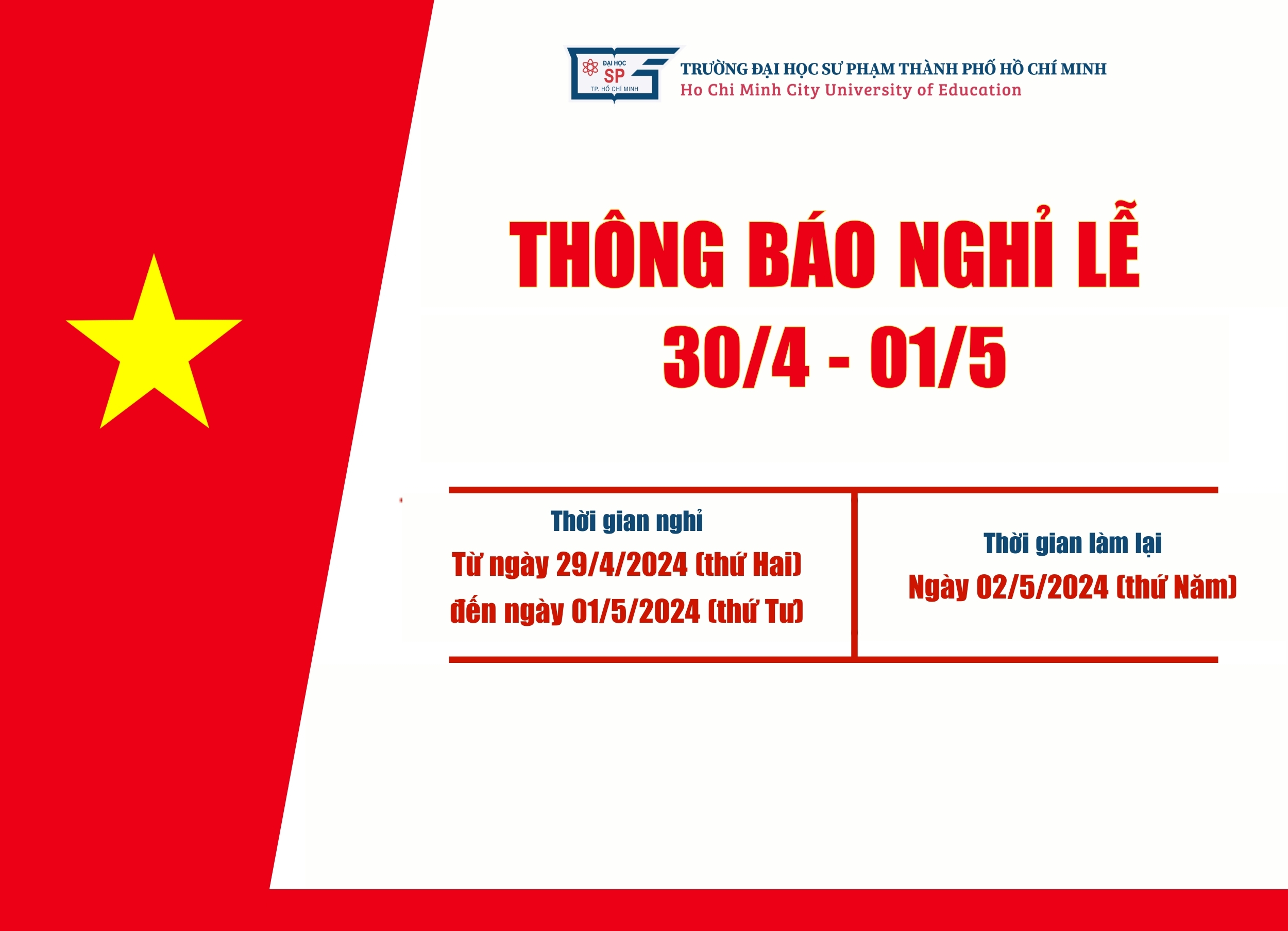 Thực hiện Thông báo số 200/TB-ĐHSP ngày 12/4/2024 của Trường Đại học Sư phạm Thành phố Hồ Chí Minh về việc nghỉ Lễ ngày Chiến thắng 30 tháng 4 và Quốc tế lao động 01 tháng 5 năm 2024,