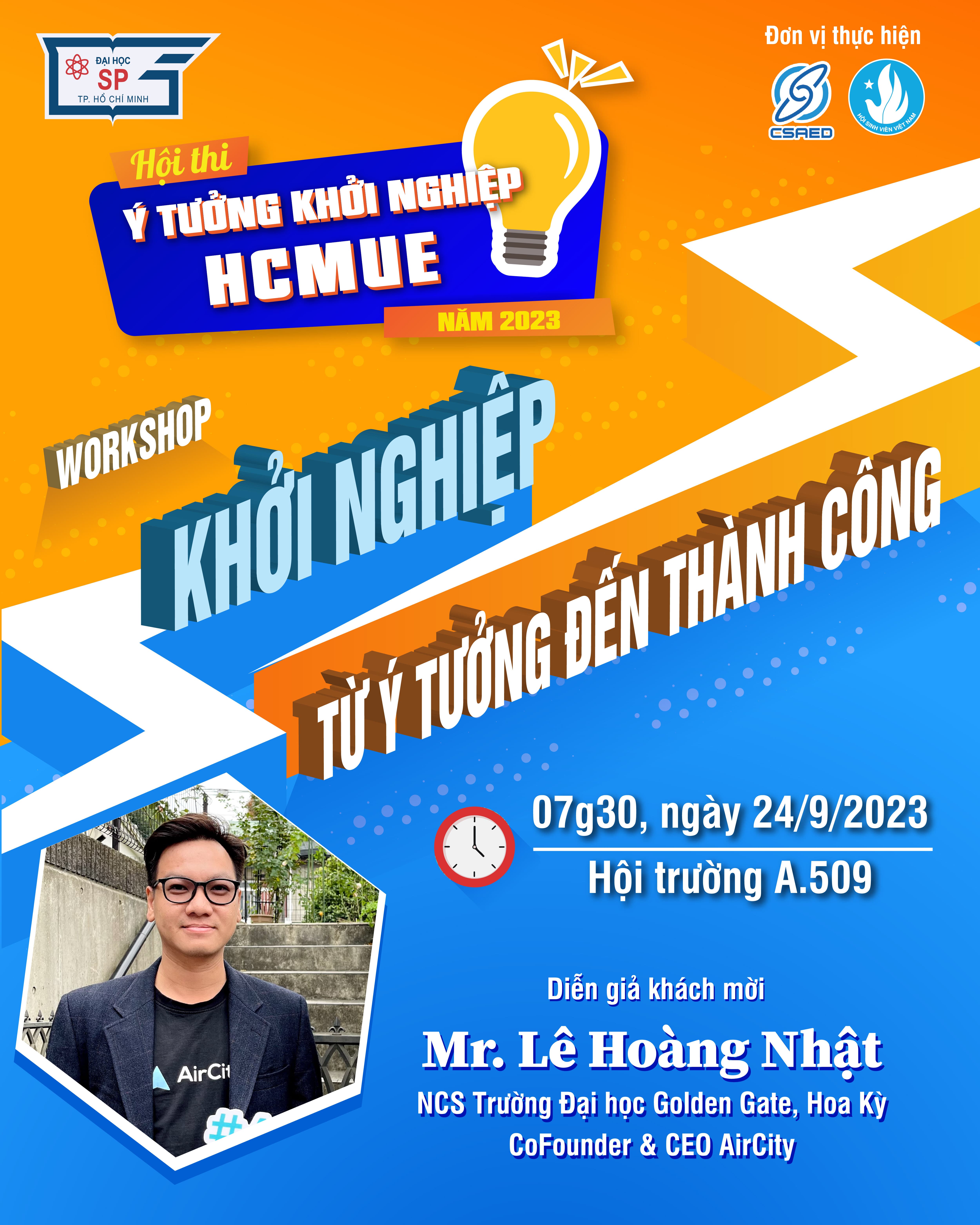 Đừng lo lắng, hãy đến ngay với workshop “KHỞI NGHIỆP - TỪ Ý TƯỞNG ĐẾN THÀNH CÔNG” và gặp gỡ anh Lê Hoàng Nhật, nghiên cứu sinh Trường Đại học Golden Gate, Hoa Kỳ, CoFounder & CEO AirCity