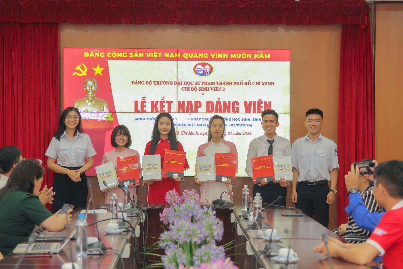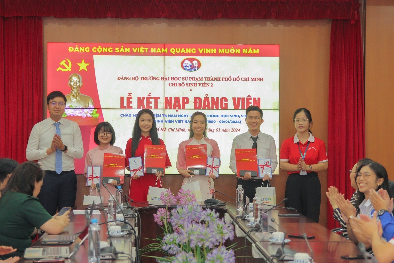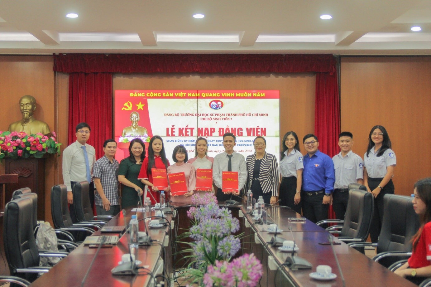 Trong không khí hân hoan của tuổi trẻ cả nước chào mừng kỷ niệm 74 năm Ngày truyền thống học sinh, sinh viên và Hội Sinh viên Việt Nam (09/01/1950 - 09/01/2024), được sự đồng ý của Đảng ủy Trường, vào lúc 07g00 ngày 09/01/2024, tại cơ sở 280 An Dương Vương, Chi bộ Sinh viên 2 đã tổ chức thành công Lễ kết nạp Đảng viên mới cho 04 quần chúng là Đoàn viên ưu tú, Hội viên tiêu biểu, chiến sĩ Xuân tình nguyện.