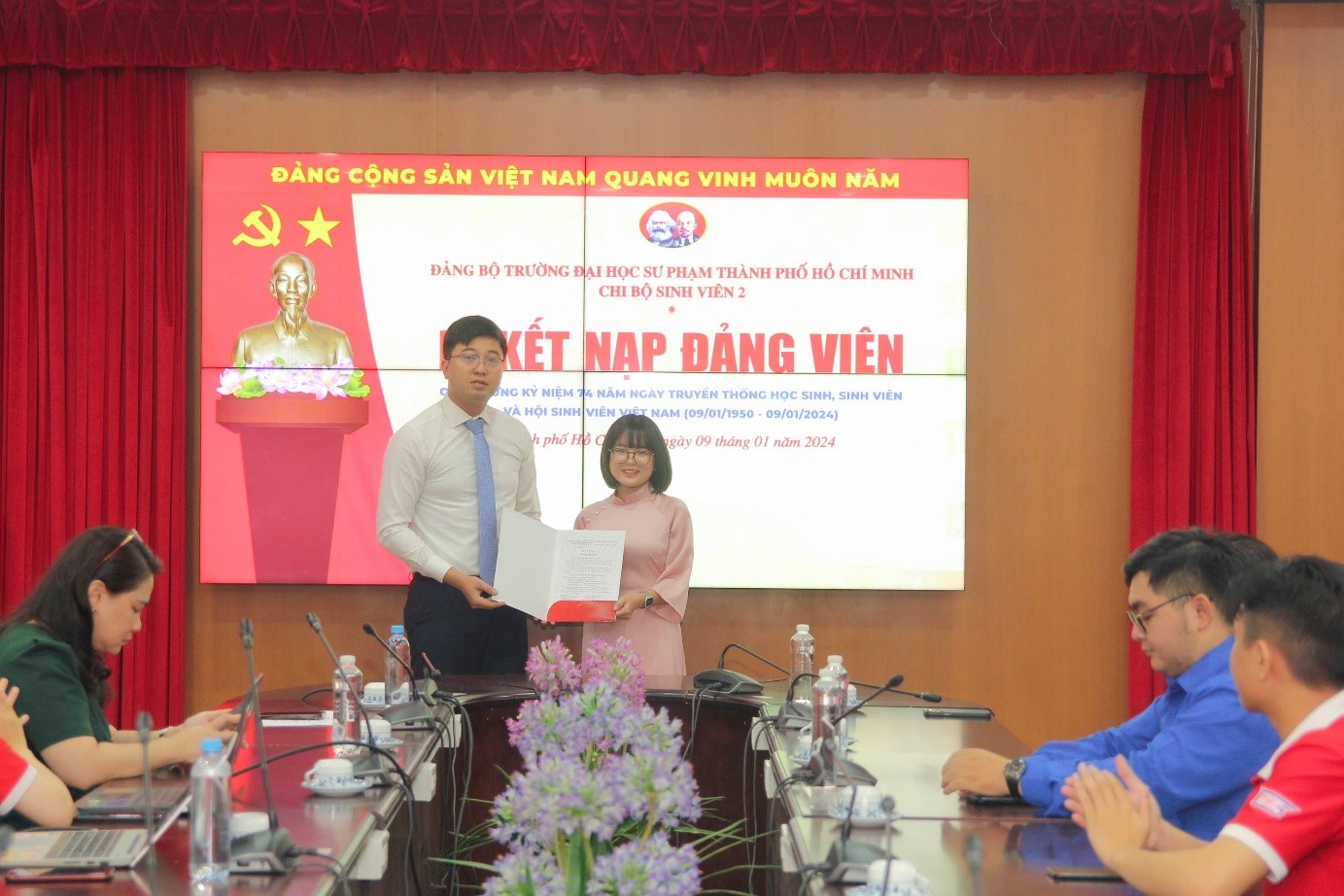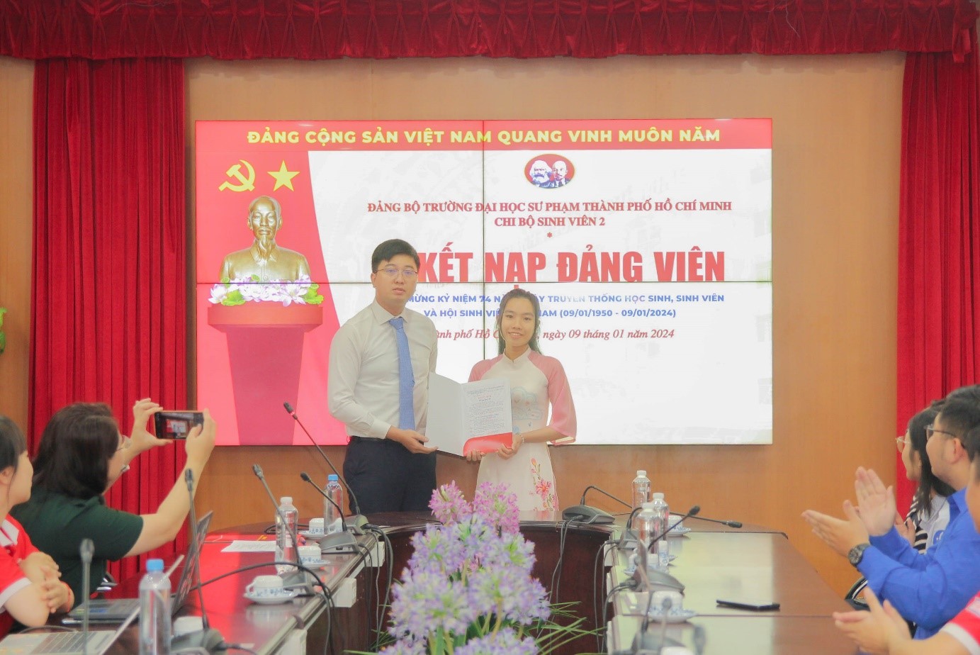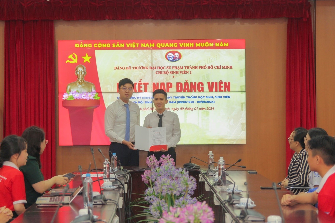 Trong không khí hân hoan của tuổi trẻ cả nước chào mừng kỷ niệm 74 năm Ngày truyền thống học sinh, sinh viên và Hội Sinh viên Việt Nam (09/01/1950 - 09/01/2024), được sự đồng ý của Đảng ủy Trường, vào lúc 07g00 ngày 09/01/2024, tại cơ sở 280 An Dương Vương, Chi bộ Sinh viên 2 đã tổ chức thành công Lễ kết nạp Đảng viên mới cho 04 quần chúng là Đoàn viên ưu tú, Hội viên tiêu biểu, chiến sĩ Xuân tình nguyện.