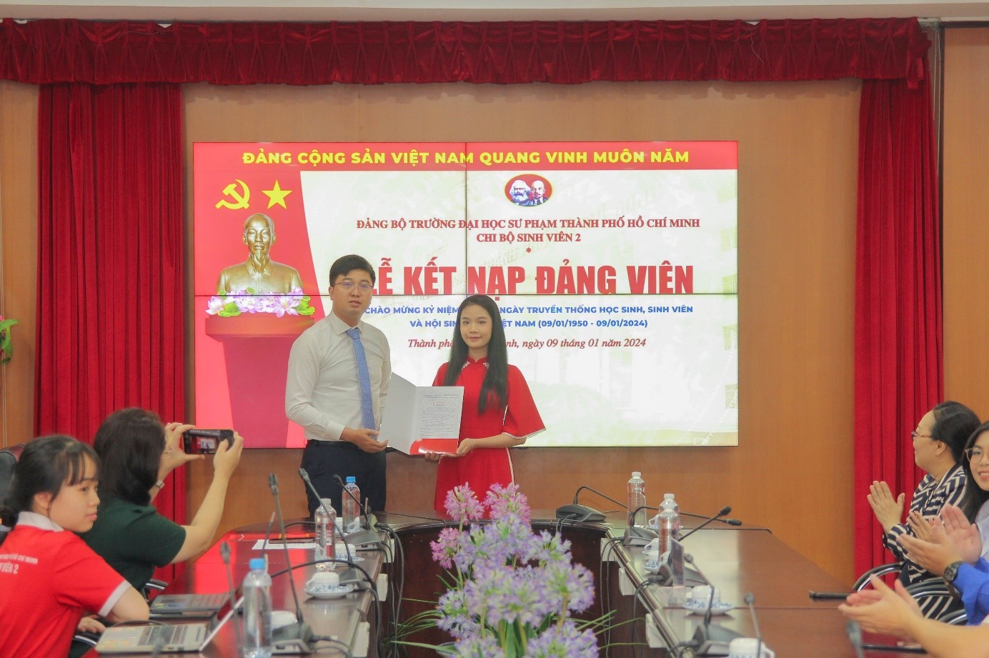Đến tham dự Lễ kết nạp Đảng viên mới có sự hiện diện của các đồng chí lãnh đạo, quý vị đại biểu: TS. Nguyễn Thị Minh Hồng - Bí thư Đảng ủy, Chủ tịch Hội đồng Trường;️ Đ/c Nguyễn Vũ Hoài Ân - Bí thư Đoàn Trường, Bí thư Chi bộ Sinh viên 2; Đ/c Nguyễn Khánh Tùng - Phó Bí thư Thường trực Đoàn Trường, Bí thư Chi bộ Sinh viên 4; Đ/c Nguyễn Minh Uyên - Phó Chủ tịch Hội Sinh viên Việt Nam Thành phố, Ủy viên Ban Thường vụ Đoàn Trường, Chủ tịch Hội Sinh viên Việt Nam Trường; Đ/c Nguyễn Đặng Hoàng Trọng - Ủy viên Ban Chấp hành Đoàn Trường, Phó Chủ tịch Hội Sinh viên Việt Nam Trường.