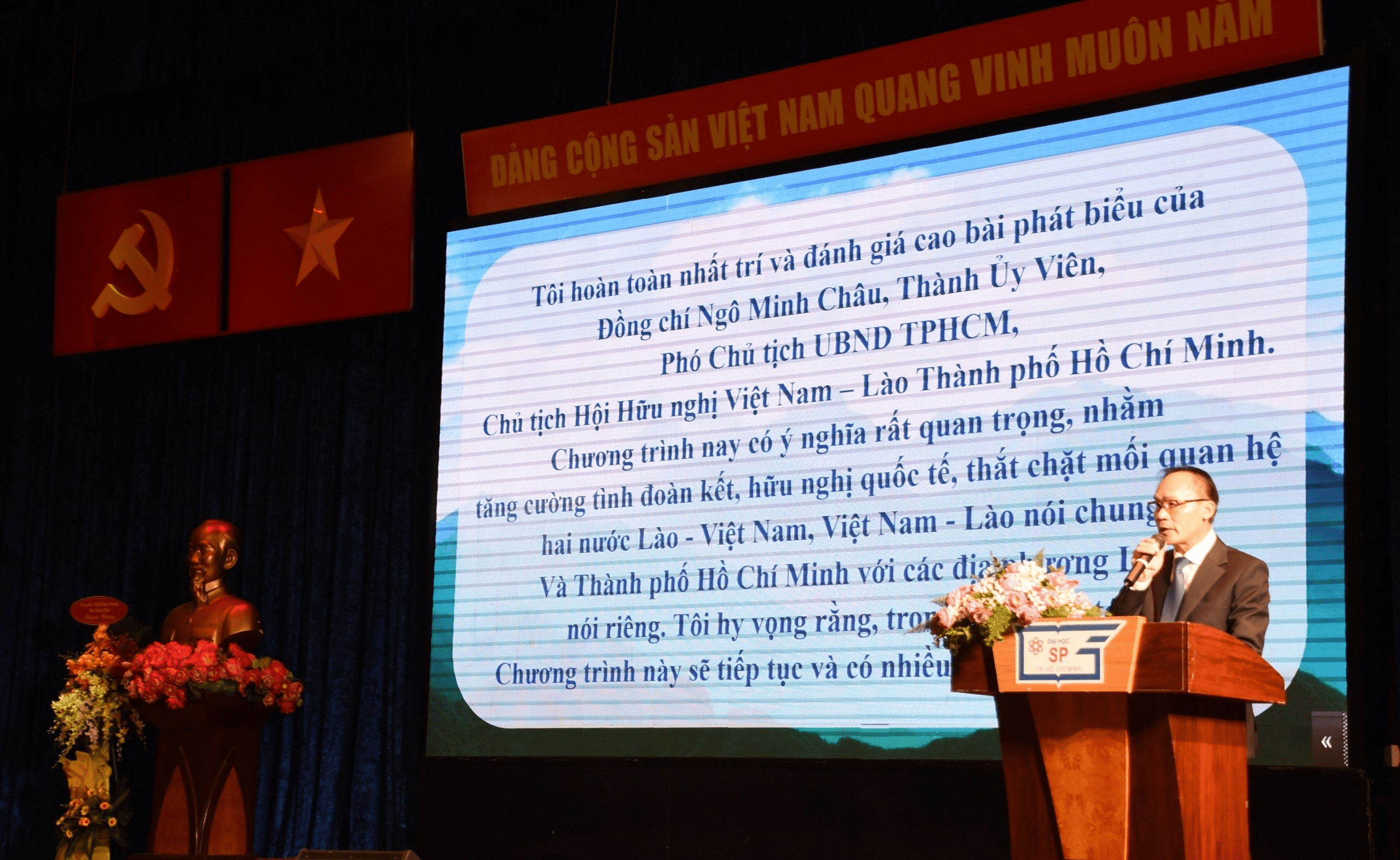 Phát biểu tại chương trình, Ông Ngô Minh Châu - Thành ủy viên, Phó Chủ tịch UBND Thành phố, Chủ tịch Hội Hữu nghị Việt Nam - Lào Thành phố Hồ Chí Minh cho biết, thời gian qua, tại Thành phố Hồ Chí Minh, mối quan hệ truyền thống hữu nghị giữa Thành phố Hồ Chí Minh với các địa phương của Lào không ngừng phát triển sâu rộng trên nhiều lĩnh vực, ngày càng đạt nhiều hiệu quả thiết thực. Đặc biệt đối với lĩnh vực giáo dục - đào tạo, hiện nay Thành phố Hồ Chí Minh có gần 800 sinh viên Lào đang học tập tại các học viện, các trường đại học trên địa bàn Thành phố.
