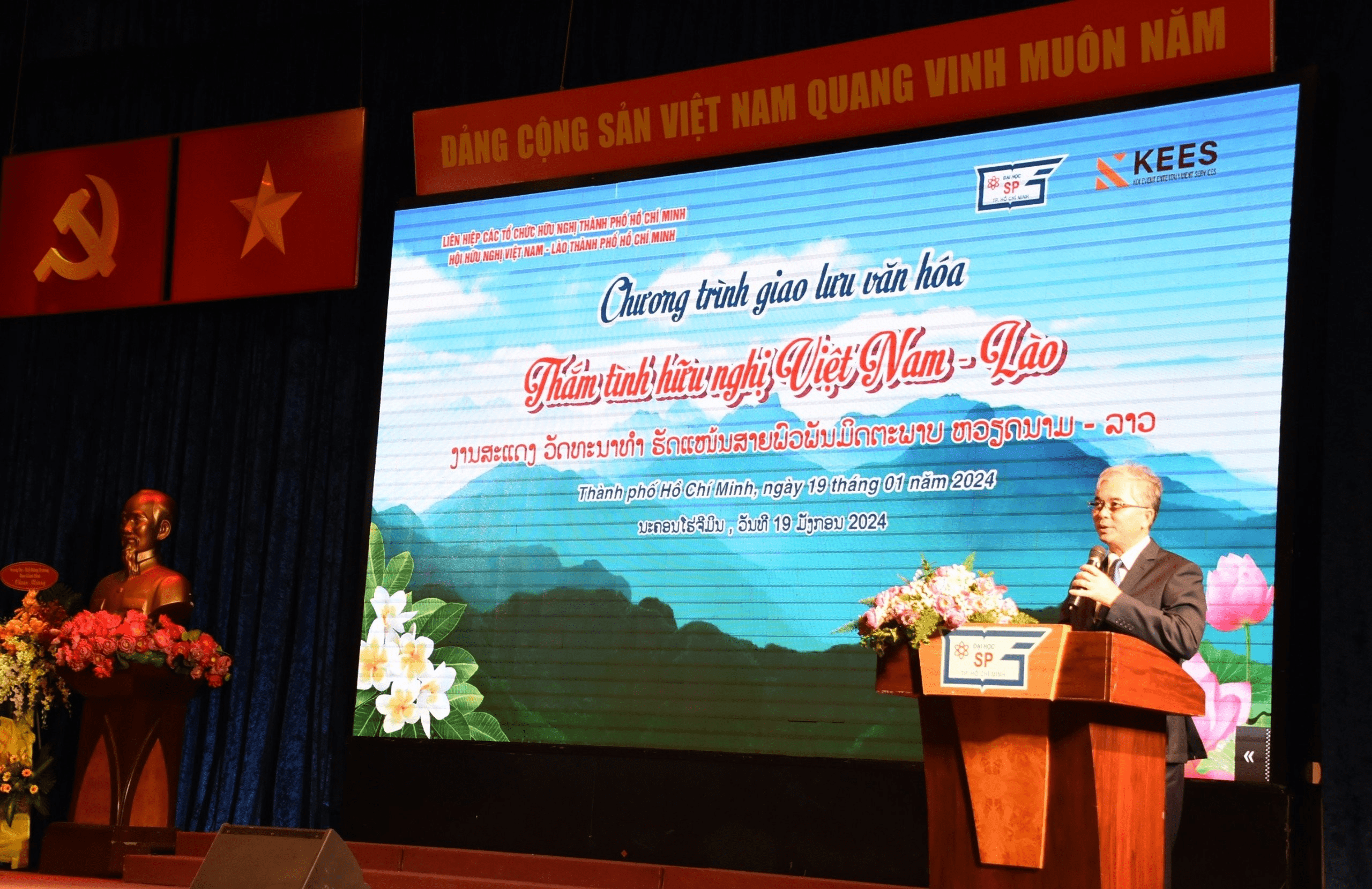 Ông Ngô Minh Châu - Thành ủy viên, Phó Chủ tịch UBND Thành phố, Chủ tịch Hội Hữu nghị Việt Nam - Lào Thành phố Hồ Chí Minh phát biểu
