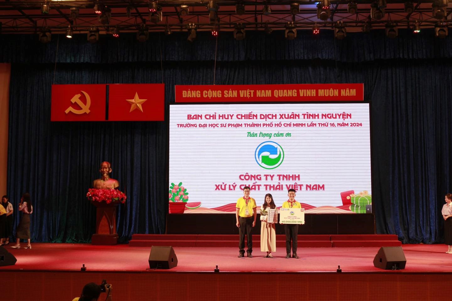 Thầy Nguyễn Ngọc Trung trao thư cảm ơn cho nhà tài trợ và đồng chí Nguyễn Đặng Hoàng Trọng nhận bảng tượng trưng từ nhà tài trợ Công ty xử lý chất thải Việt Nam