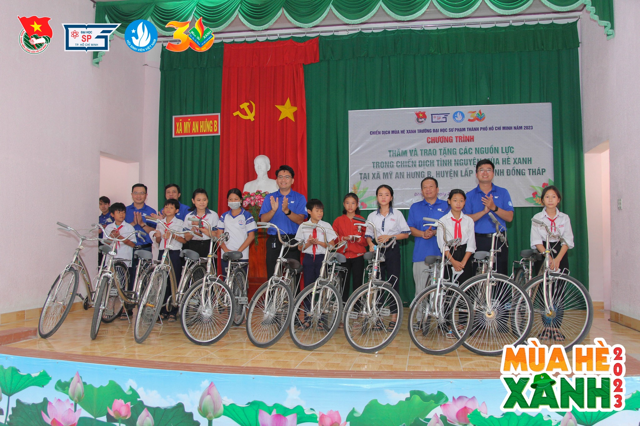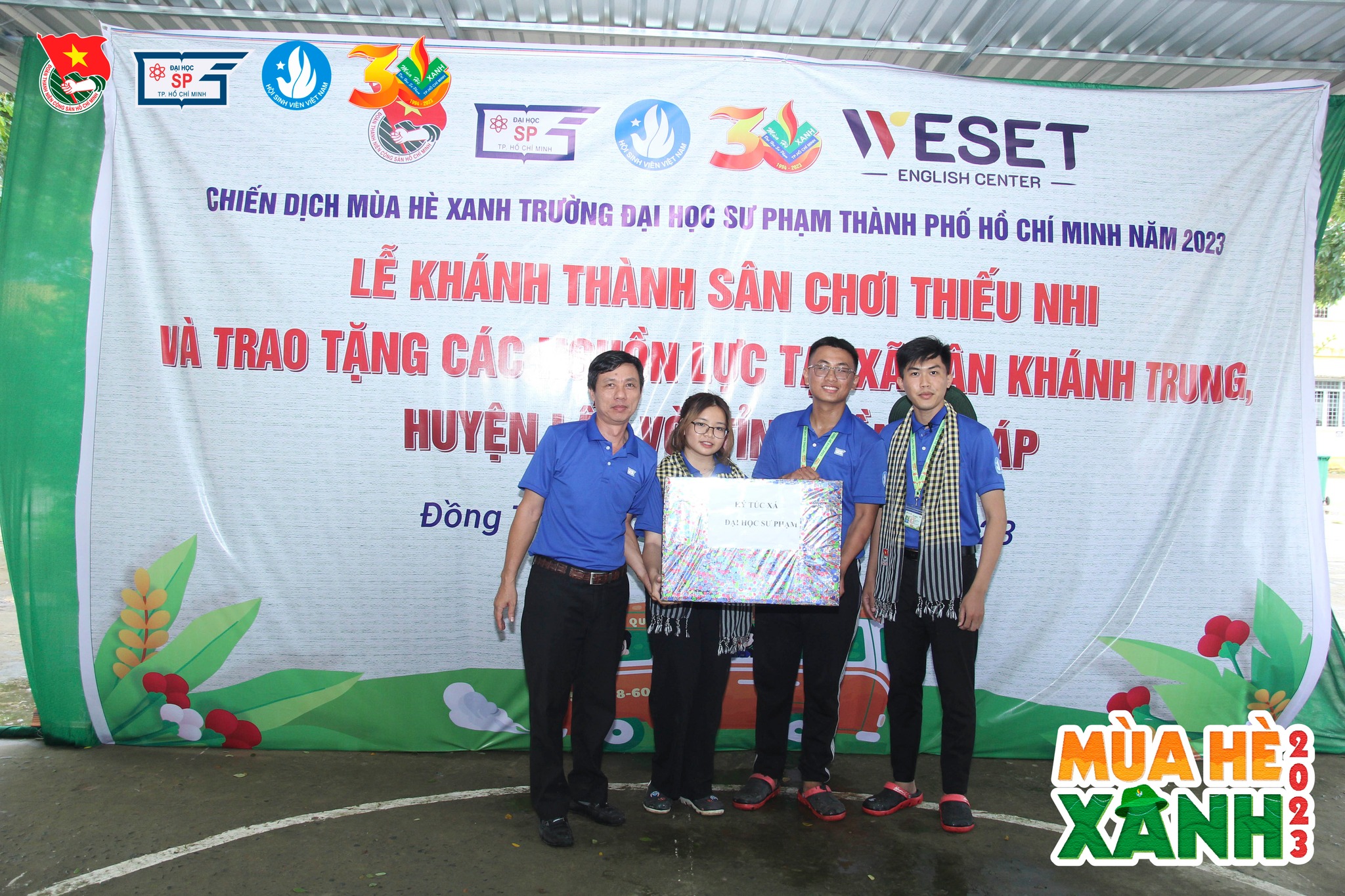 Cũng trong đợt này, lãnh đạo Trường đã tham dự Lễ khởi công công trình 02 đường giao thông nông thôn tại xã Tân Khánh Trung, khánh thành công trình sân chơi thiếu nhi tại Trường Tiểu học Tân Khánh Trung, cắt băng khánh thành công trình “Thắp sáng đường quê” tại xã Mỹ An Hưng B. Đồng thời, lãnh đạo Trường cũng đã trao tặng 20 phần quà (bao gồm xe đạp và sách giáo khoa) cho học sinh khó khăn, trao tặng 25 chiếc ghế đá, 1000 quyển tập cho địa phương.