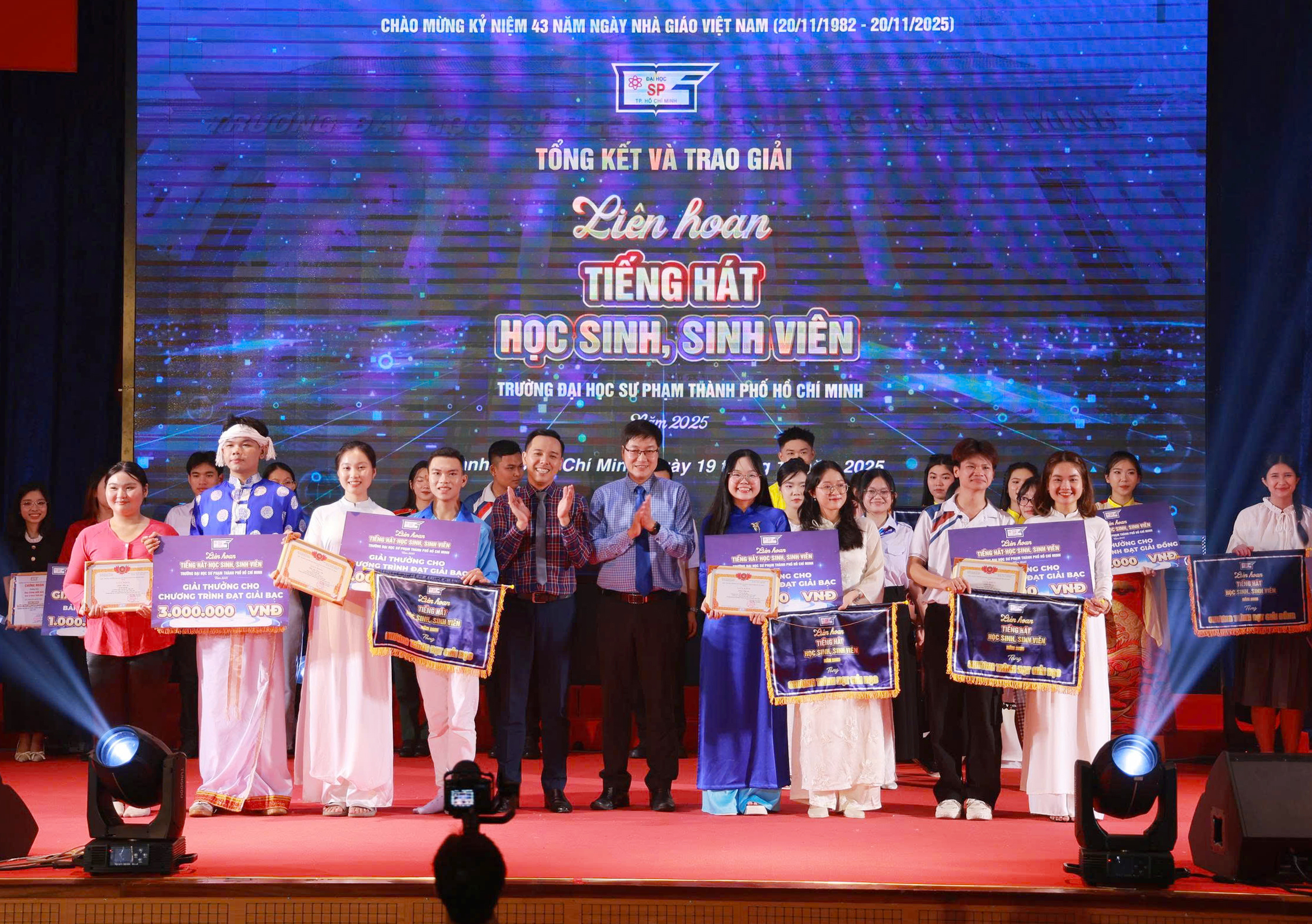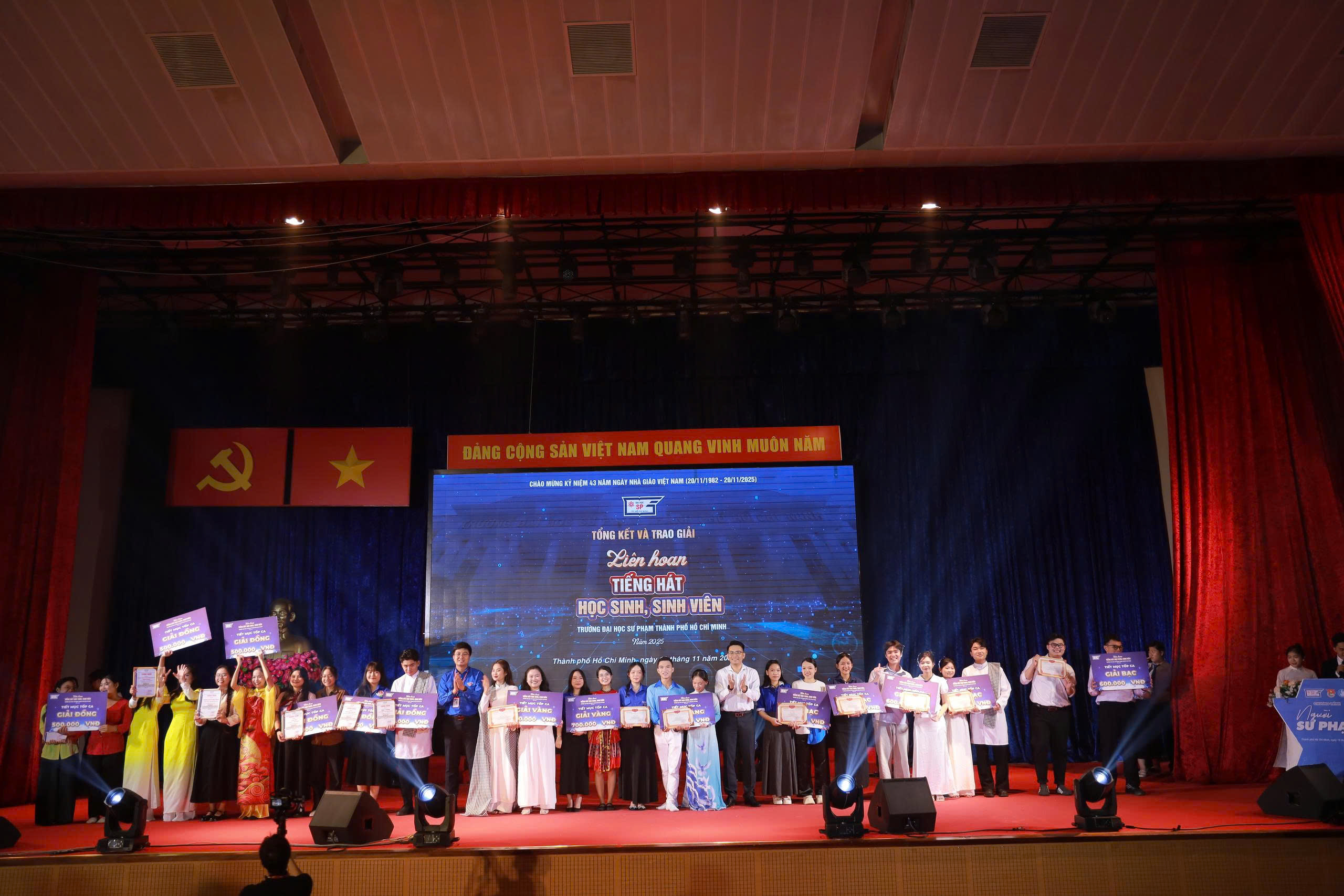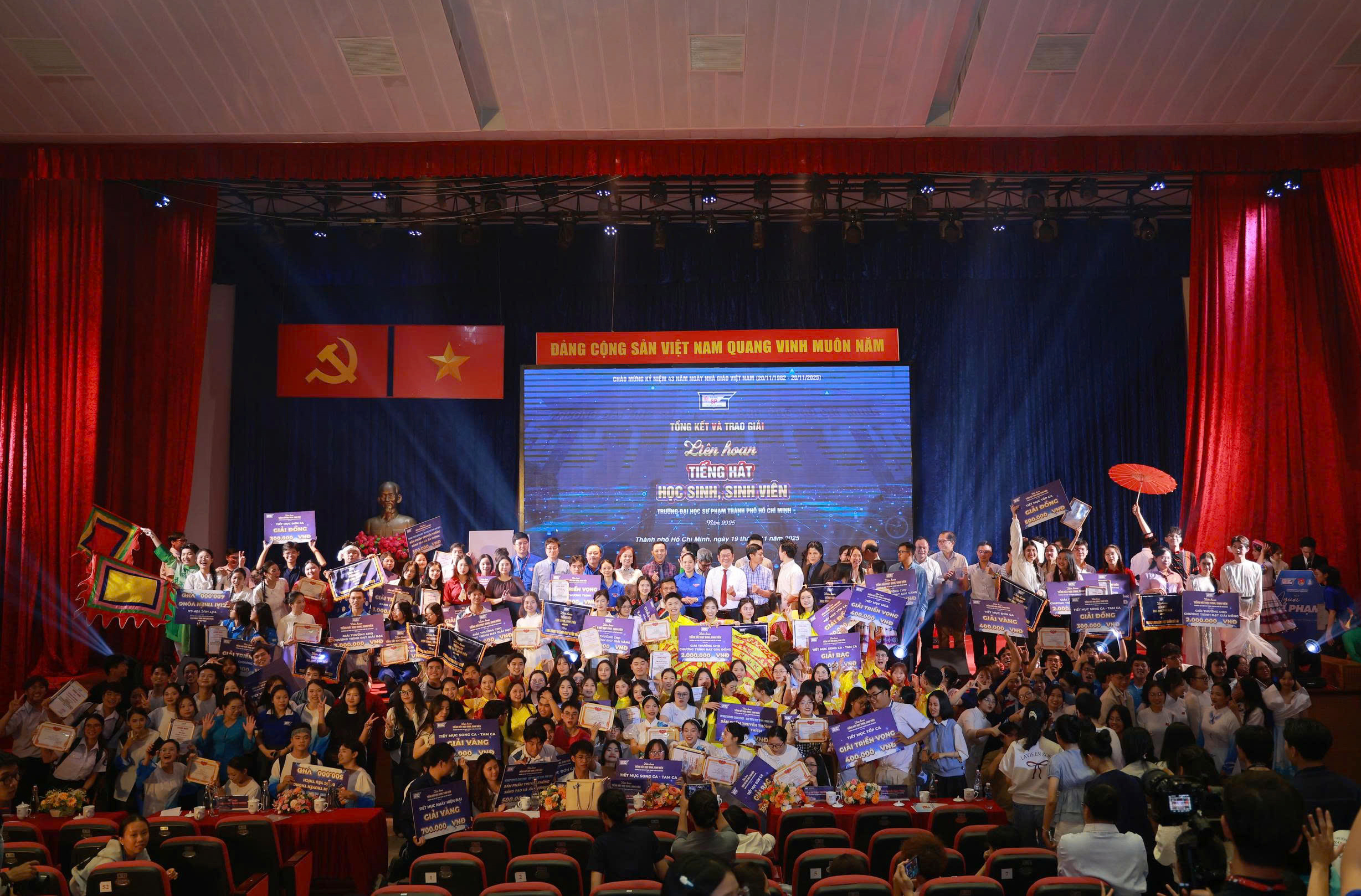 Tối ngày 19/11/2025, tại Hội trường B, Trường Đại học Sư phạm Thành phố Hồ Chí Minh đã tổ chức Đêm Công diễn và Trao giải Liên hoan Tiếng hát Học sinh – Sinh viên năm 2025, nằm trong khuôn khổ chương trình truyền thống “Người Sư phạm”. Sự kiện đã khép lại một hành trình dài đầy cảm xúc, nơi những giọng ca và tiết mục xuất sắc nhất cùng tỏa sáng trong không khí trẻ trung, sôi nổi và đậm tinh thần sư phạm.
