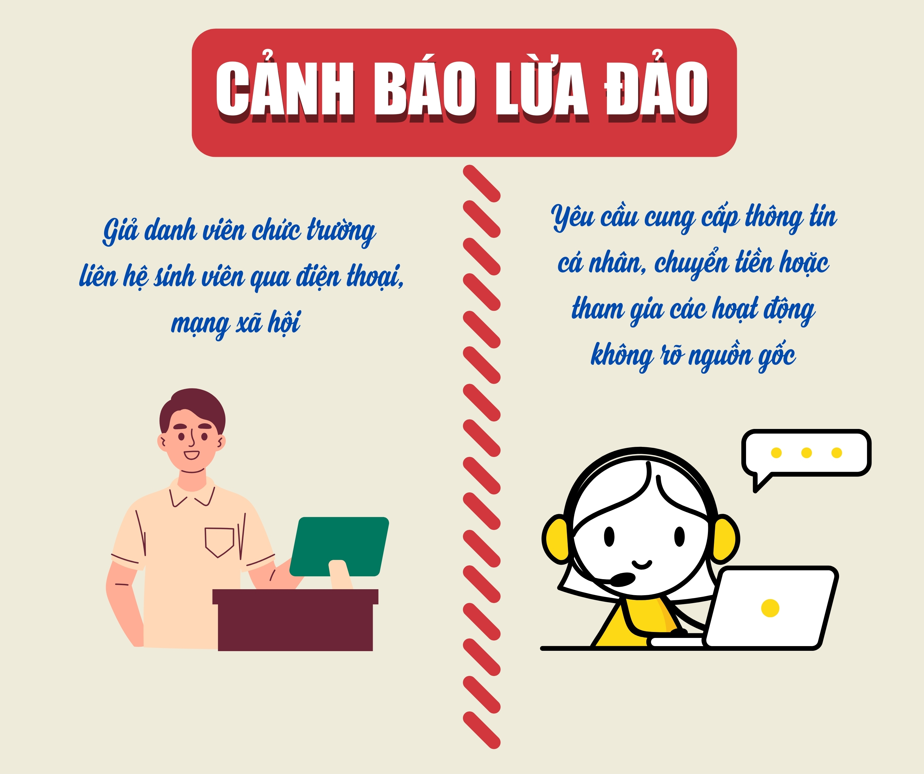 Hiện nay xuất hiện nhiều trường hợp cá nhân giả danh chuyên viên Phòng Công tác chính trị và Học sinh, sinh viên Trường liên hệ với sinh viên qua điện thoại, mạng xã hội để yêu cầu cung cấp thông tin cá nhân, chuyển tiền hoặc tham gia các hoạt động không rõ nguồn gốc.