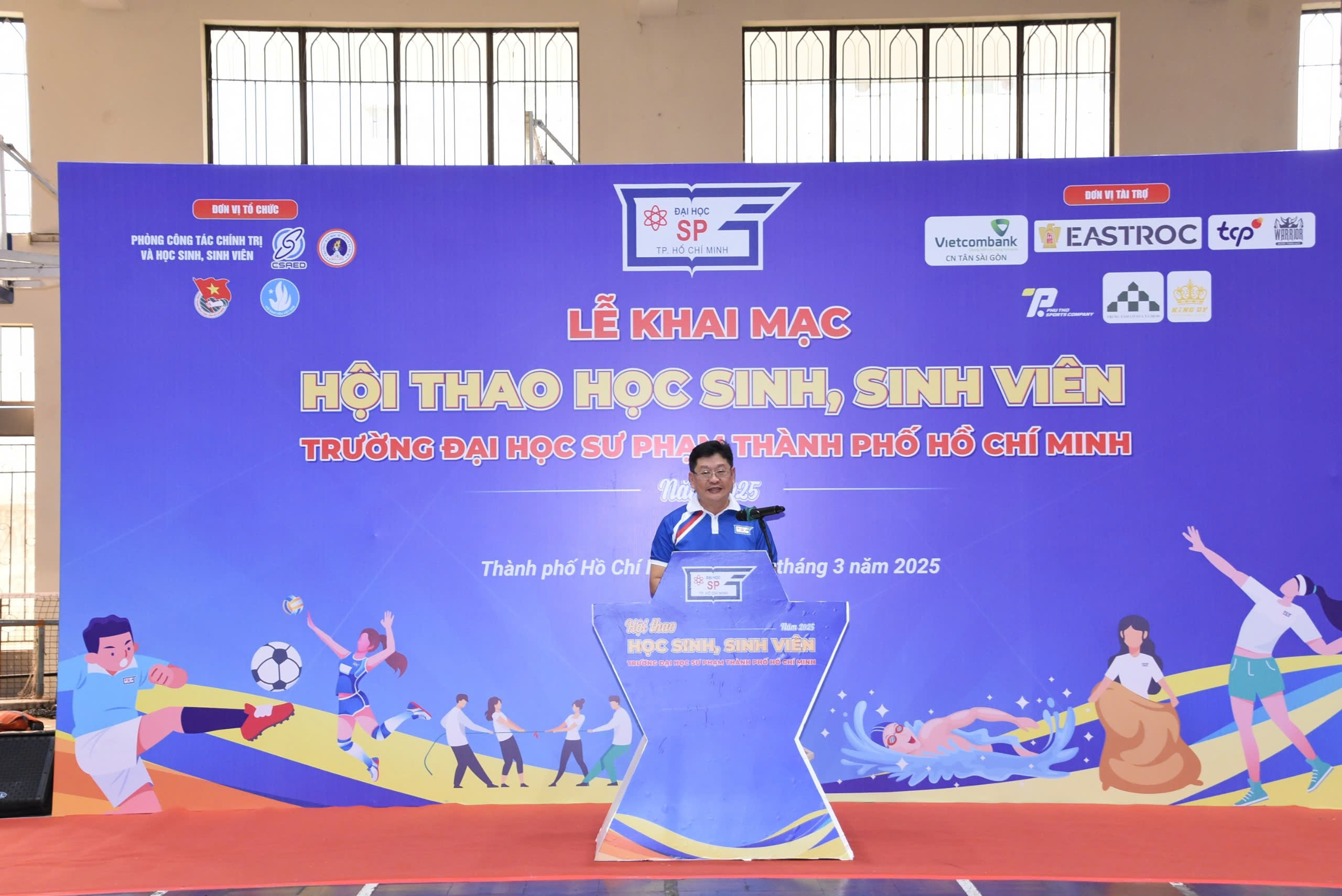 Sáng ngày 16/3/2025, tại Nhà thi đấu Trường Đại học Sư phạm Thành phố Hồ Chí Minh, Lễ khai mạc Hội thao Học sinh, sinh viên năm 2025 đã diễn ra trong không khí tưng bừng, hào hứng. TS. Cao Anh Tuấn - Phó Hiệu trưởng Nhà trường đến dự và phát biểu tại Lễ khai mạc.