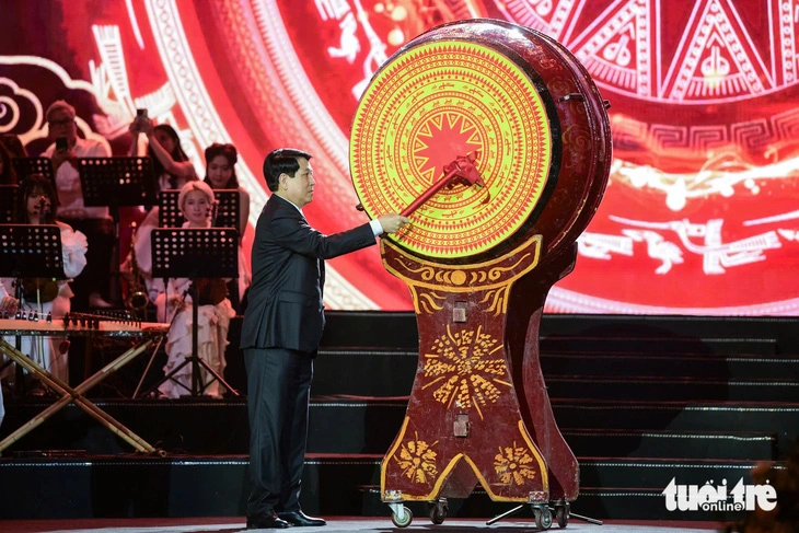 Chủ tịch nước Lương Cường đánh trống khai hội - Ảnh: NAM TRẦN