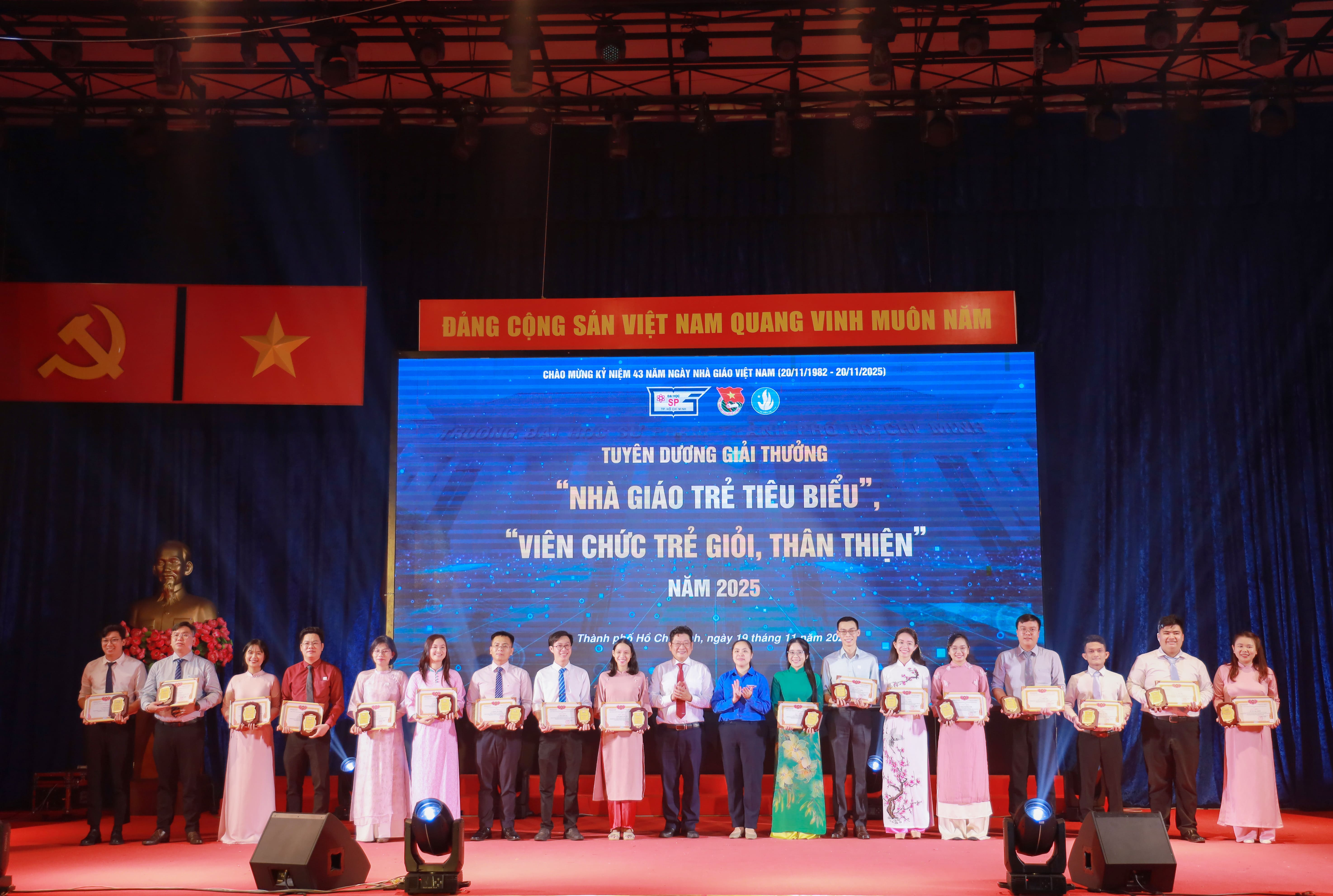 Tại buổi lễ, Ban Thường vụ Đoàn Trường đã trân trọng tuyên dương và vinh danh 27 “Nhà giáo trẻ tiêu biểu” và 05 “Viên chức trẻ giỏi, thân thiện” năm 2025. Các thầy cô và các anh chị chính là minh chứng sống động nhất cho giá trị cốt lõi “Chất lượng - Sáng tạo - Nhân văn”.