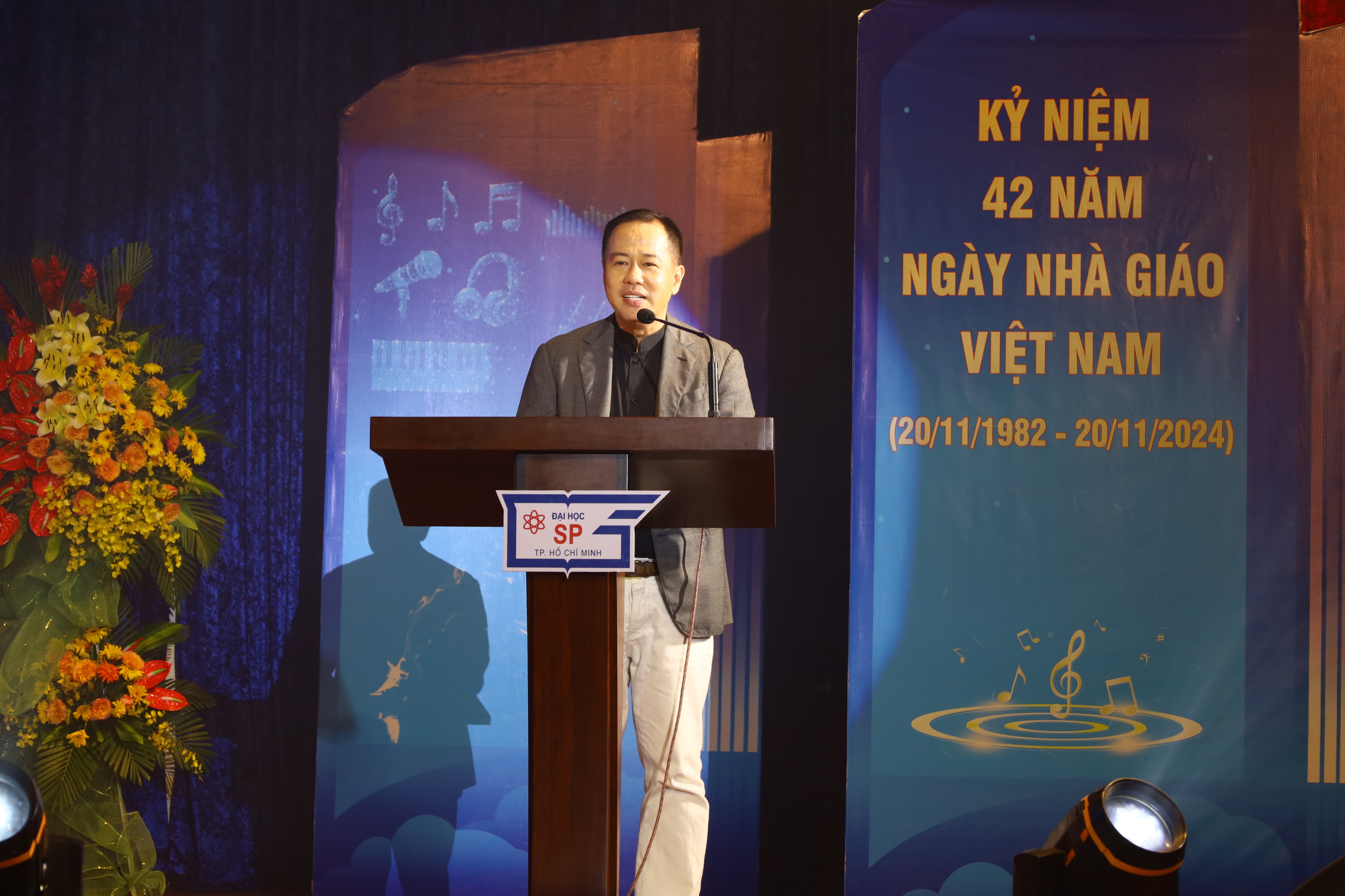 Phát biểu tại chương trình, GS.TS. Huỳnh Văn Sơn - Hiệu trưởng Trường đã có những chia sẻ chúc mừng và gửi gắm kỳ vọng đến các Thầy Cô là viên chức Trường -“Tôi mong mỗi Thầy Cô giáo hãy hết lòng, hết sức với công việc đã chọn để đúng tầm của nhà giáo - Người sư phạm”, “Tận đáy lòng mình, tôi kỳ vọng mỗi thầy giáo, cô giáo HCMUE hôm nay sẽ tiếp tục lan tỏa hình ảnh nhà giáo trẻ, viên chức trẻ tiêu biểu trong hoạt động chuyên môn và hoạt động xã hội như câu chuyện đẹp…”. Thay mặt lãnh đạo Trường, thầy Hiệu trưởng cũng đã gửi những lời chúc mừng, những tình cảm tốt đẹp nhất đến quý Thầy Cô nhân kỷ niệm 42 năm ngày Nhà giáo Việt Nam: “Xin chúc quý thầy cô luôn giữ vững niềm tin, sự nhiệt huyết, tình yêu nghề để tiếp tục chặng đường dẫn dắt các thế hệ tương lai bởi đó là sứ mạng cao cả của người làm thầy; bởi đó là truyền thống tốt đẹp của Người sư phạm với gần 50 năm hun đúc và hơn thế nữa từ tiền thân của Trường ta…”