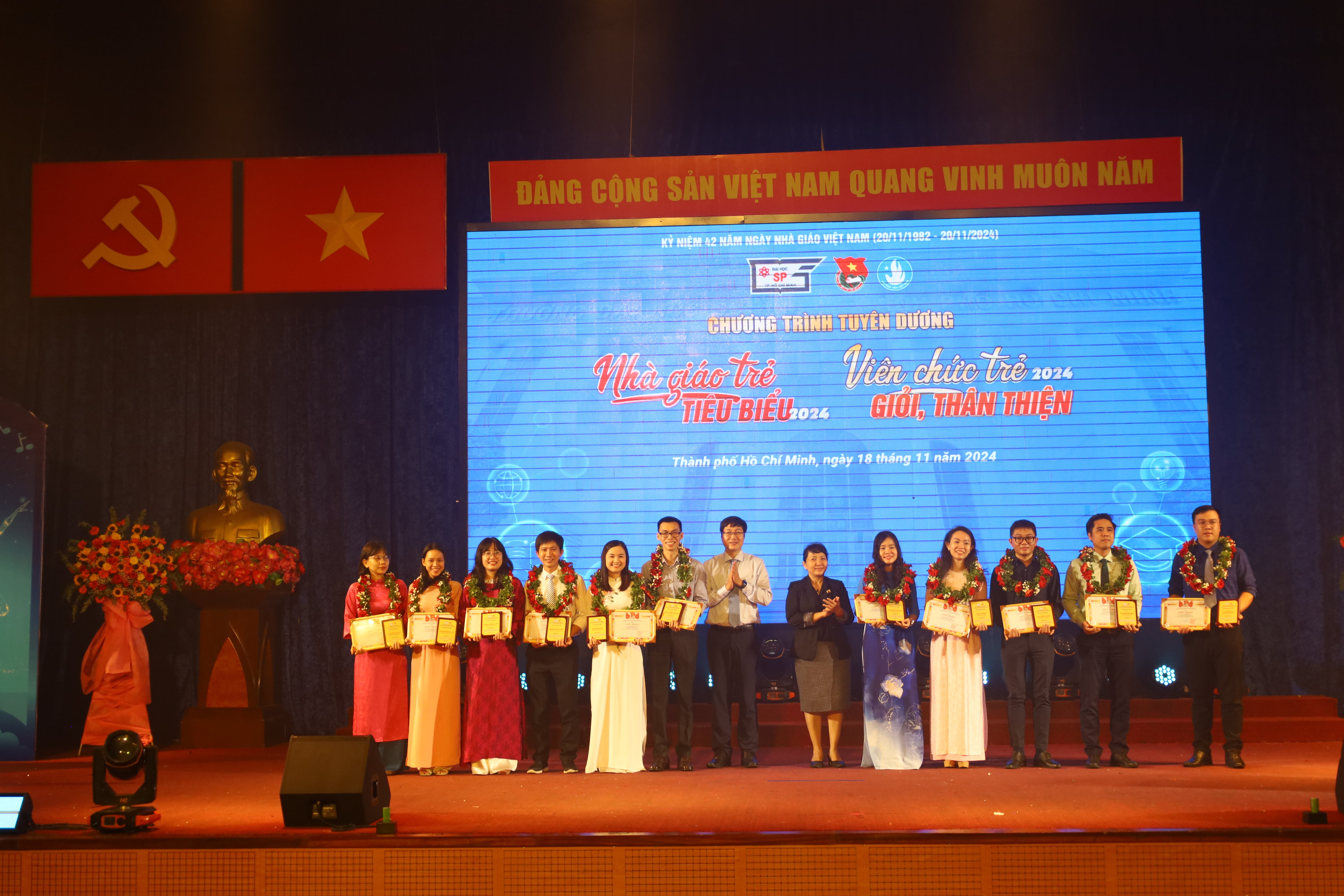Tối ngày 18/11/2024, hòa trong không khí hân hoan cả nước kỷ niệm 42 năm ngày Nhà giáo Việt Nam (20/11/1982 – 20/11/2024), Trường Đại học Sư phạm Thành phố Hồ Chí Minh đã long trọng tổ chức Chương trình Người sư phạm - Tuyên dương Nhà giáo trẻ tiêu biểu, Viên chức trẻ giỏi, thân thiện và Trao giải Liên hoan Tiếng hát sinh viên năm 2024.