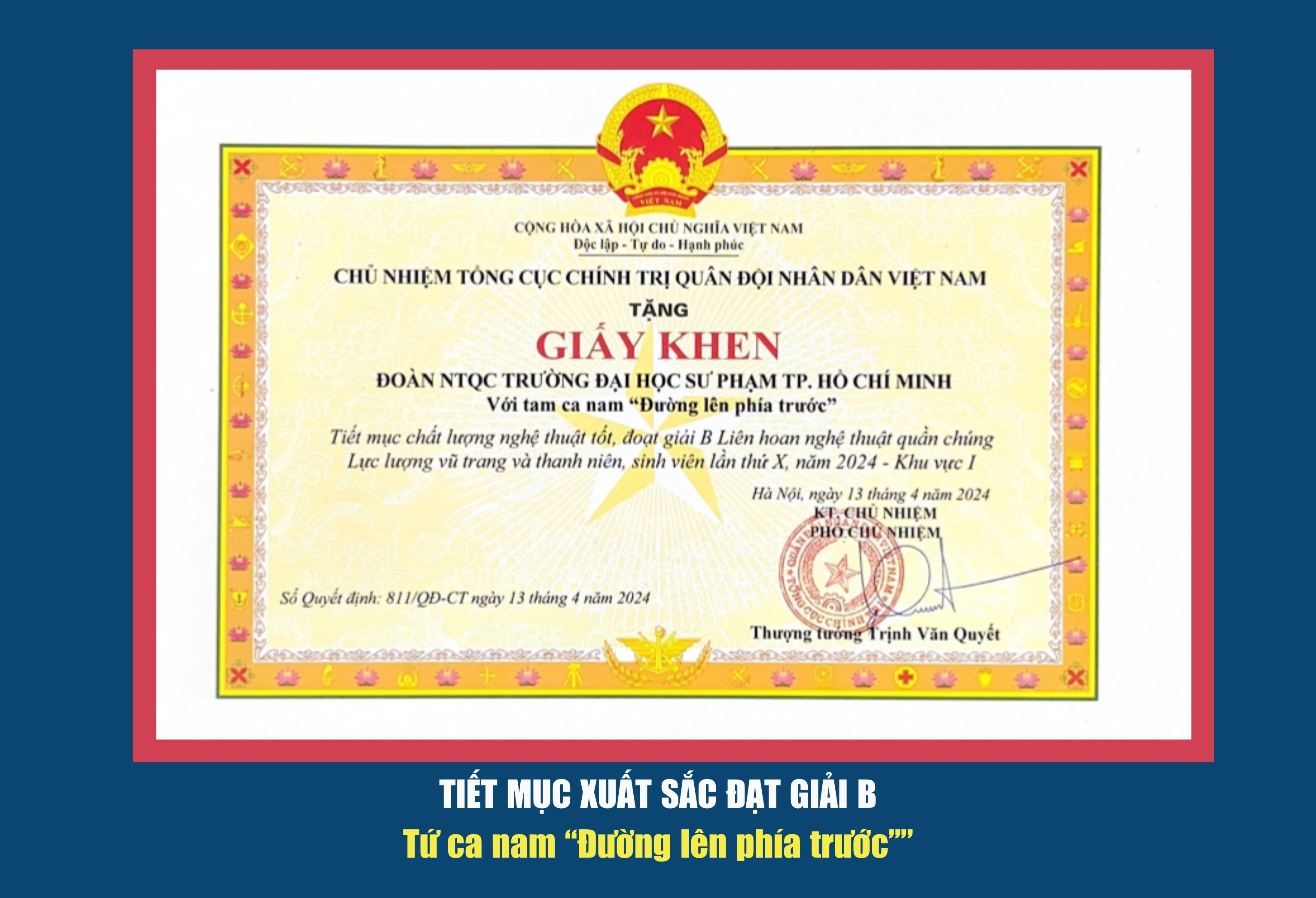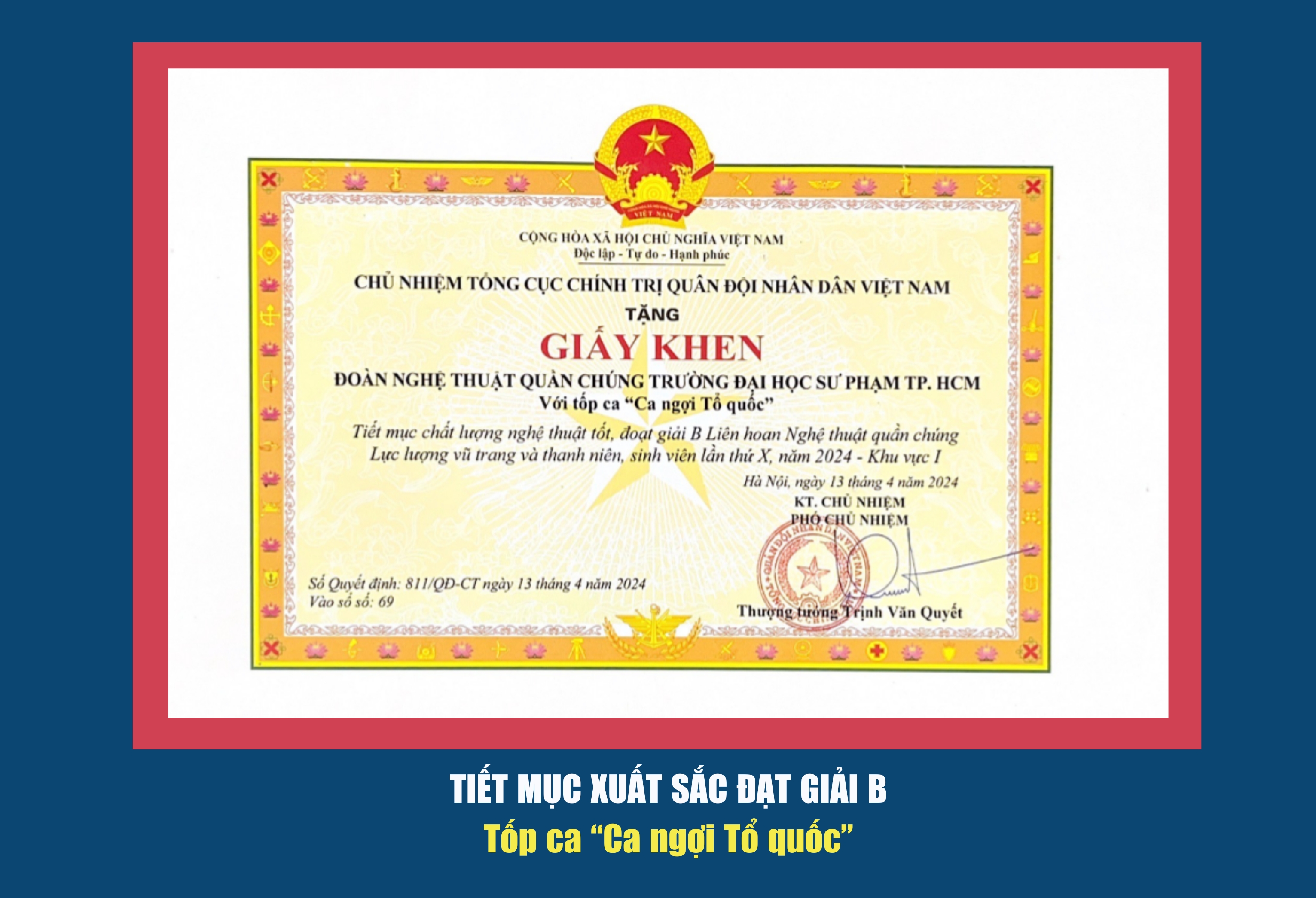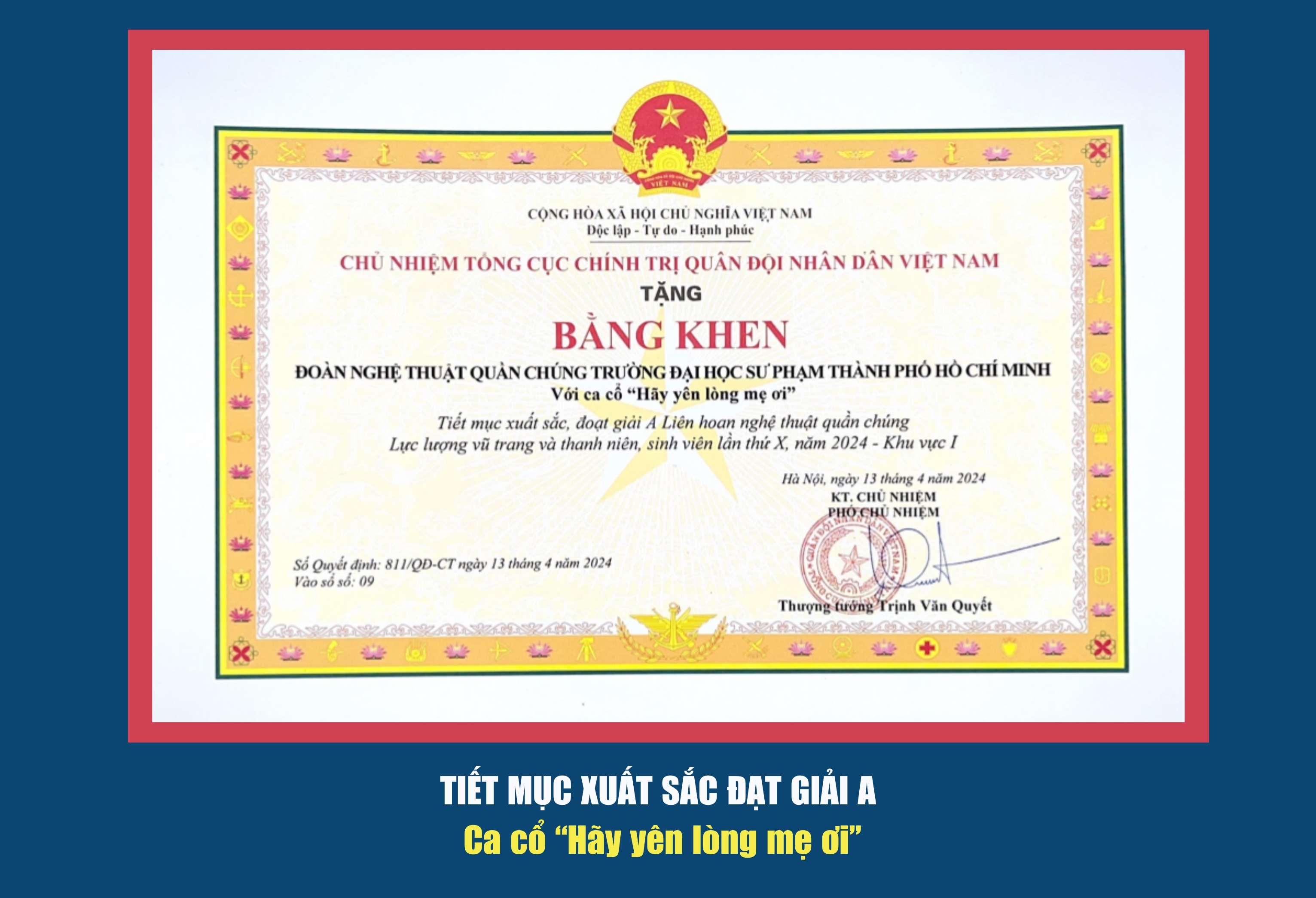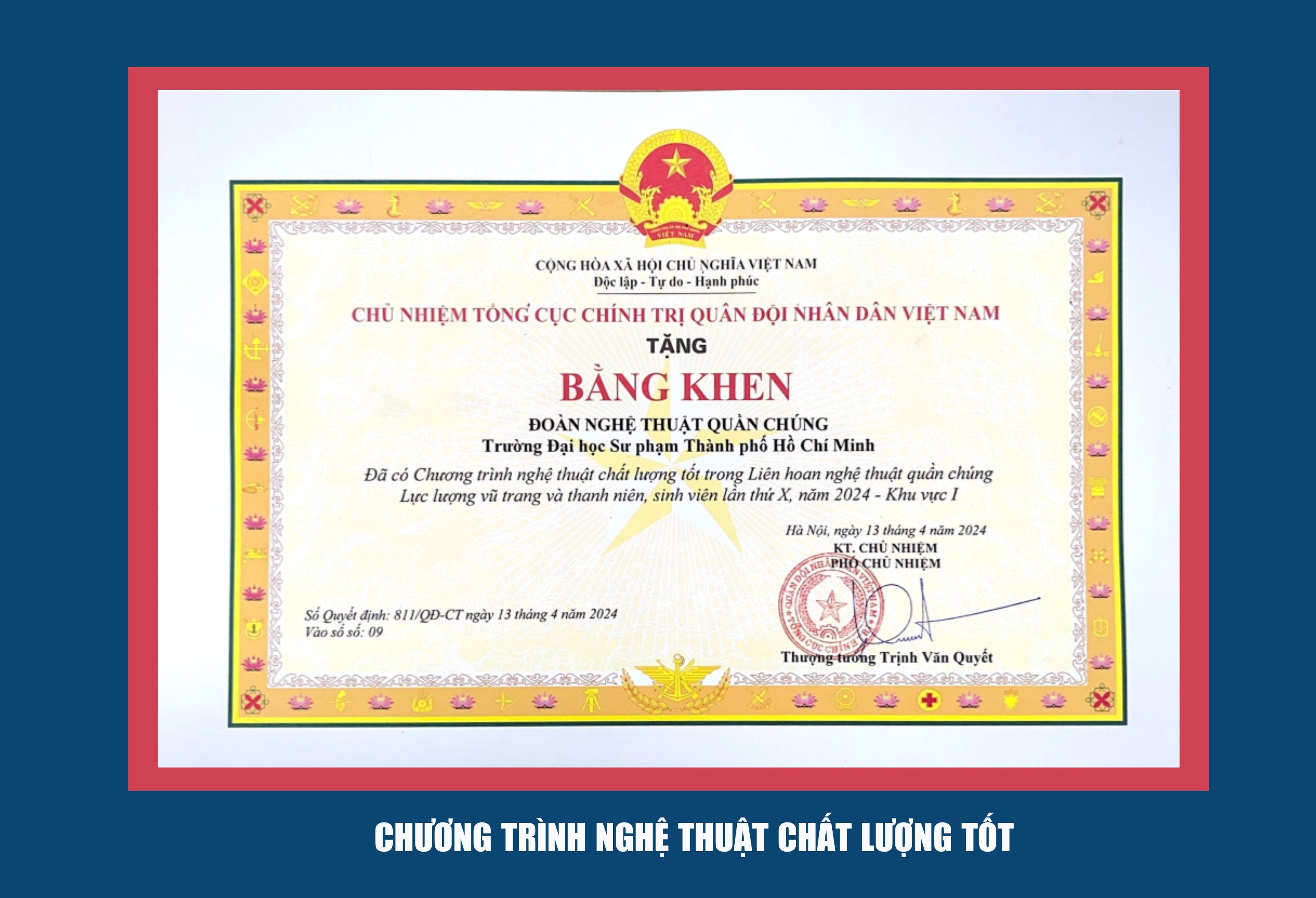 Đại diện Đoàn Nghệ thuật quần chúng Trường Đại học Sư phạm Thành phố Hồ Chí Minh nhận được Bằng khen của Tổng cục Chính trị Quân đội nhân dân Việt Nam (đầu tiên từ phải qua)