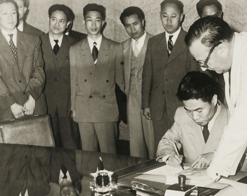 Đại diện Bộ Tư lệnh Quân đội nhân dân Việt Nam Dân chủ Cộng hòa Tạ Quang Bửu ký Hiệp định về việc đình chỉ chiến sự ở Đông Dương tại Cung quốc gia, tháng 7/1954 (Nguồn ảnh: Viện Lưu trữ Phim ảnh Nhà nước Nga).