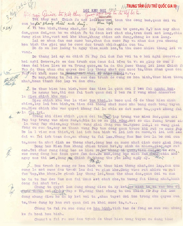 Bản Hiệp định Genève ngày 21/7/1954 và Lời kêu gọi của Chủ tịch Hồ Chí Minh 22/7/1954 (Nguồn ảnh: Trung tâm Lưu trữ quốc gia III).