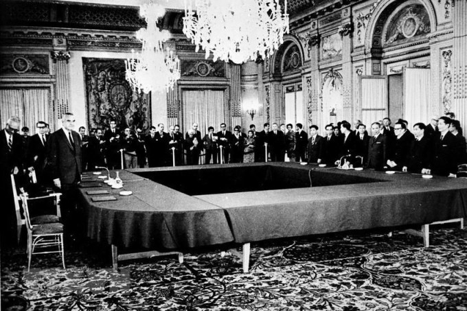Lễ khai mạc cuộc nói chuyện chính thức giữa đại diện Chính phủ Việt Nam Dân chủ Cộng hòa và đại diện Chính phủ Mỹ tại Paris, ngày 13/5/1968. Ảnh: TTXVN