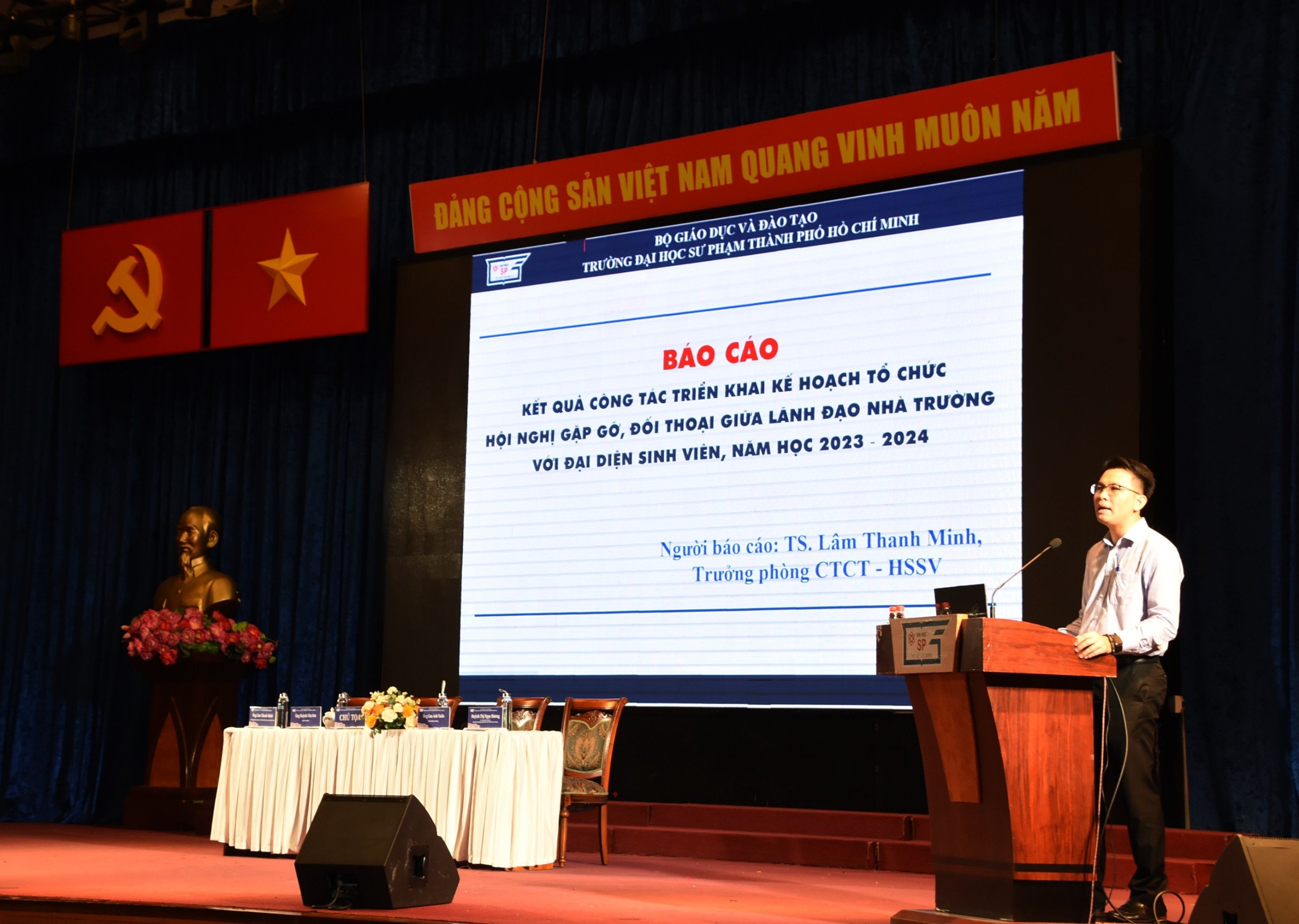 TS. Lâm Thanh Minh, Trưởng Phòng CTCT&HSSV trình bày Báo cáo kết quả triển khai kế hoạch tổ chức Hội nghị gặp gỡ, đối thoại giữa Lãnh đạo Trường với đại diện sinh viên năm học 2023 - 2024