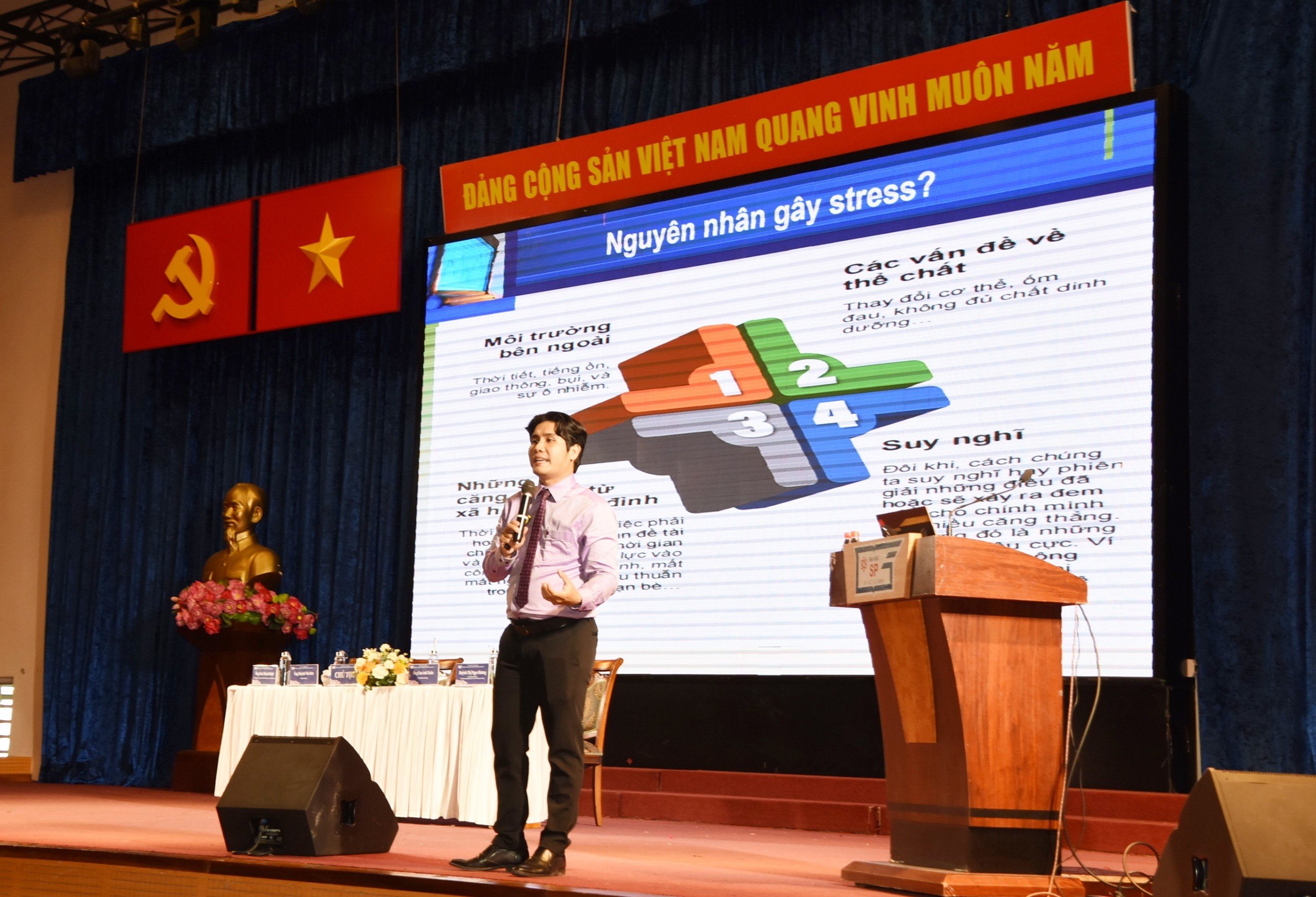 ThS. Võ Minh Thành, Phó Bí thư Chi bộ khoa Tâm Lý học trình bày chuyên đề “Ứng phó với stress và xây dựng kế hoạch học tập trong bối cảnh chuyển đổi số”