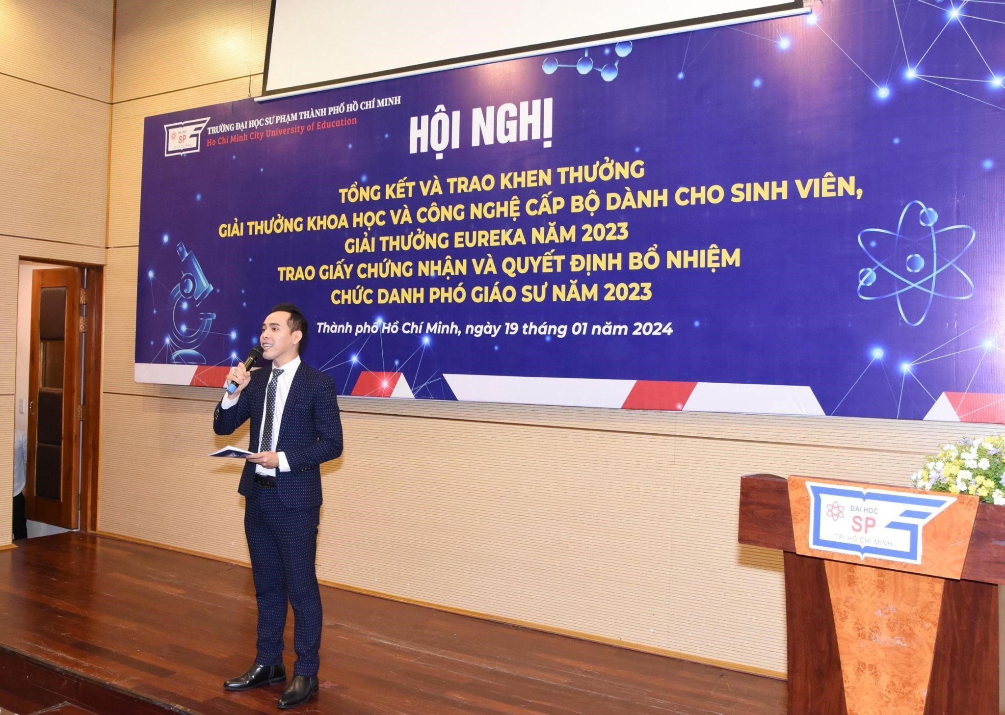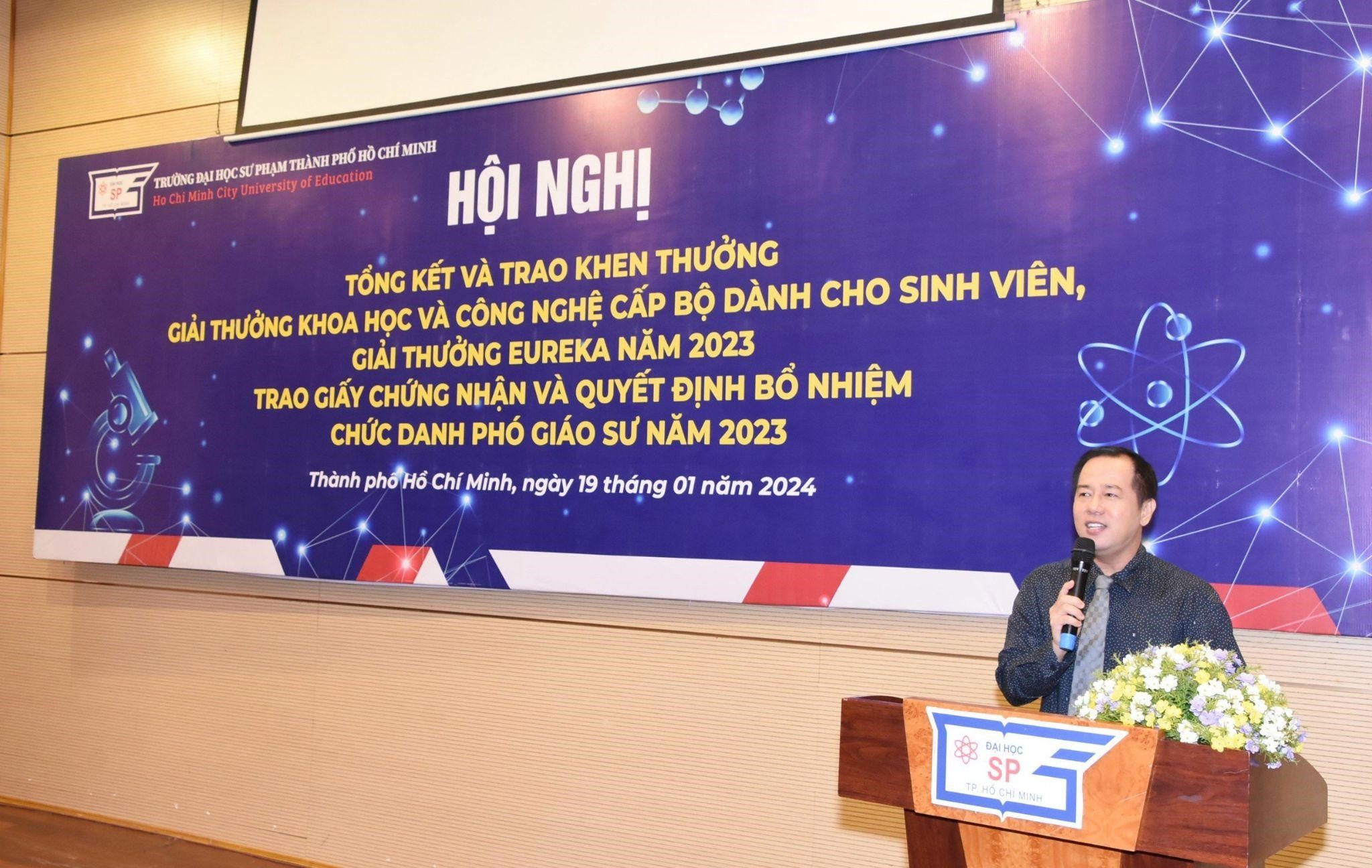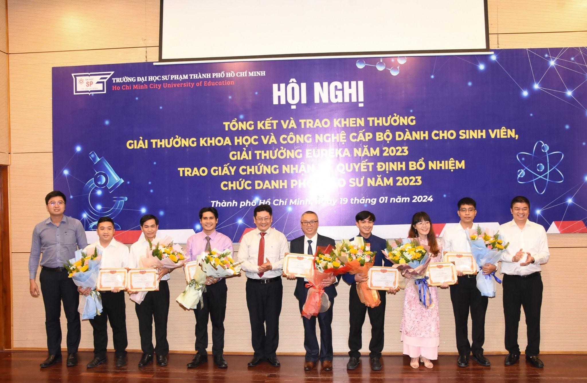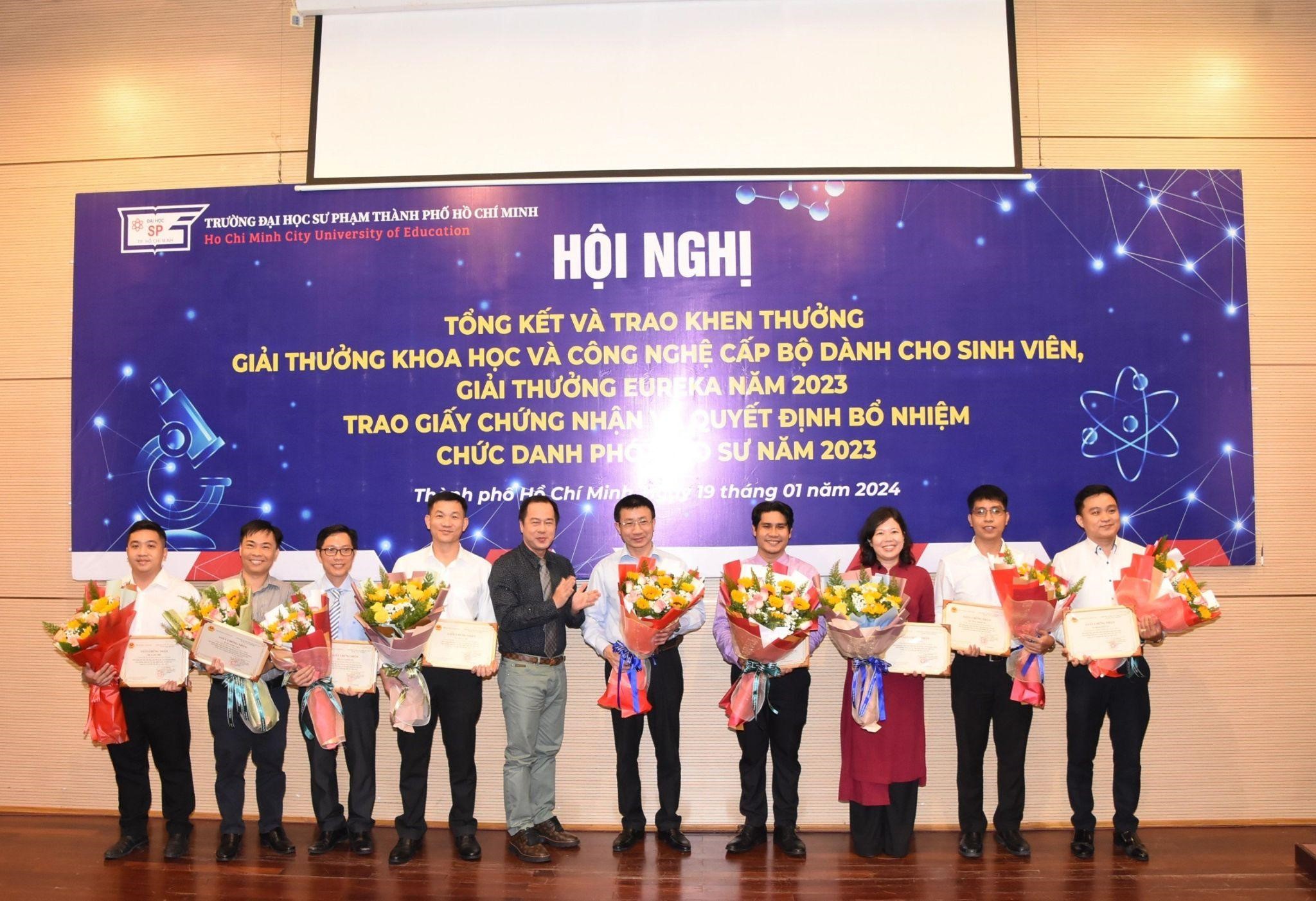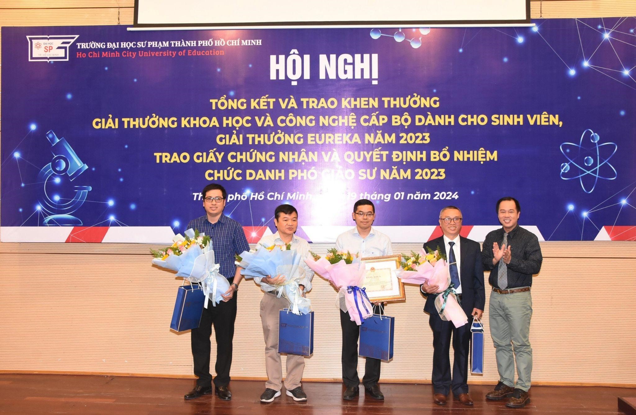 Với mong muốn công nhận học hàm cao quý sau những nỗ lực không ngừng nghỉ của các giảng viên cũng như tổng kết, tuyên dương và khen thưởng cá nhân, tập thể có thành tích xuất sắc trong hoạt động NCKH của viên chức, sinh viên, Trường Đại học Sư phạm Thành phố Hồ Chí Minh đã tổ chức “Hội nghị tổng kết và trao Giải thưởng Khoa học và Công nghệ cấp Bộ dành cho sinh viên, Giải thưởng Euréka năm 2023, Trao Giấy chứng nhận và Quyết định bổ nhiệm chức danh Phó Giáo sư năm 2023” vào chiều ngày 19/01/2024.