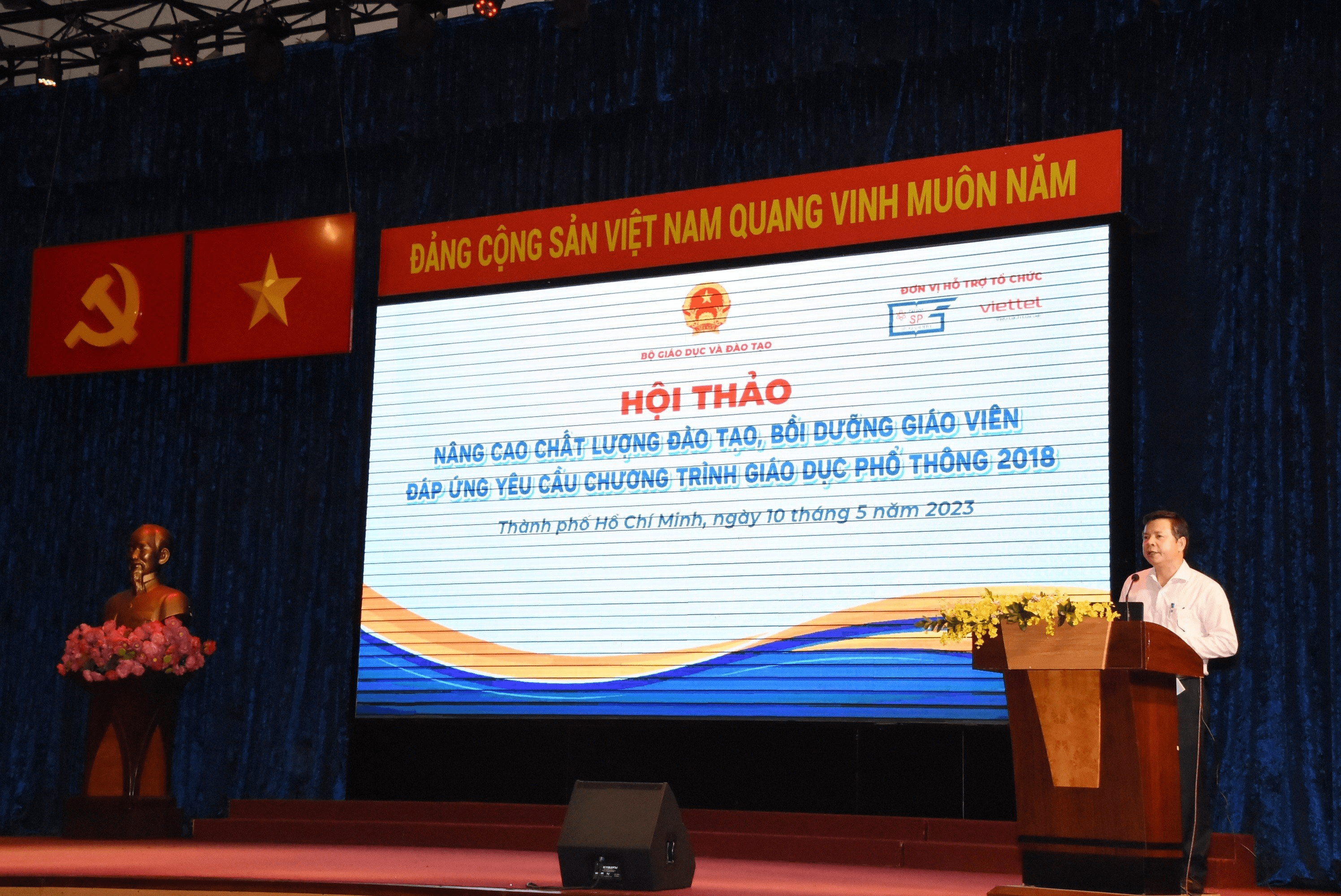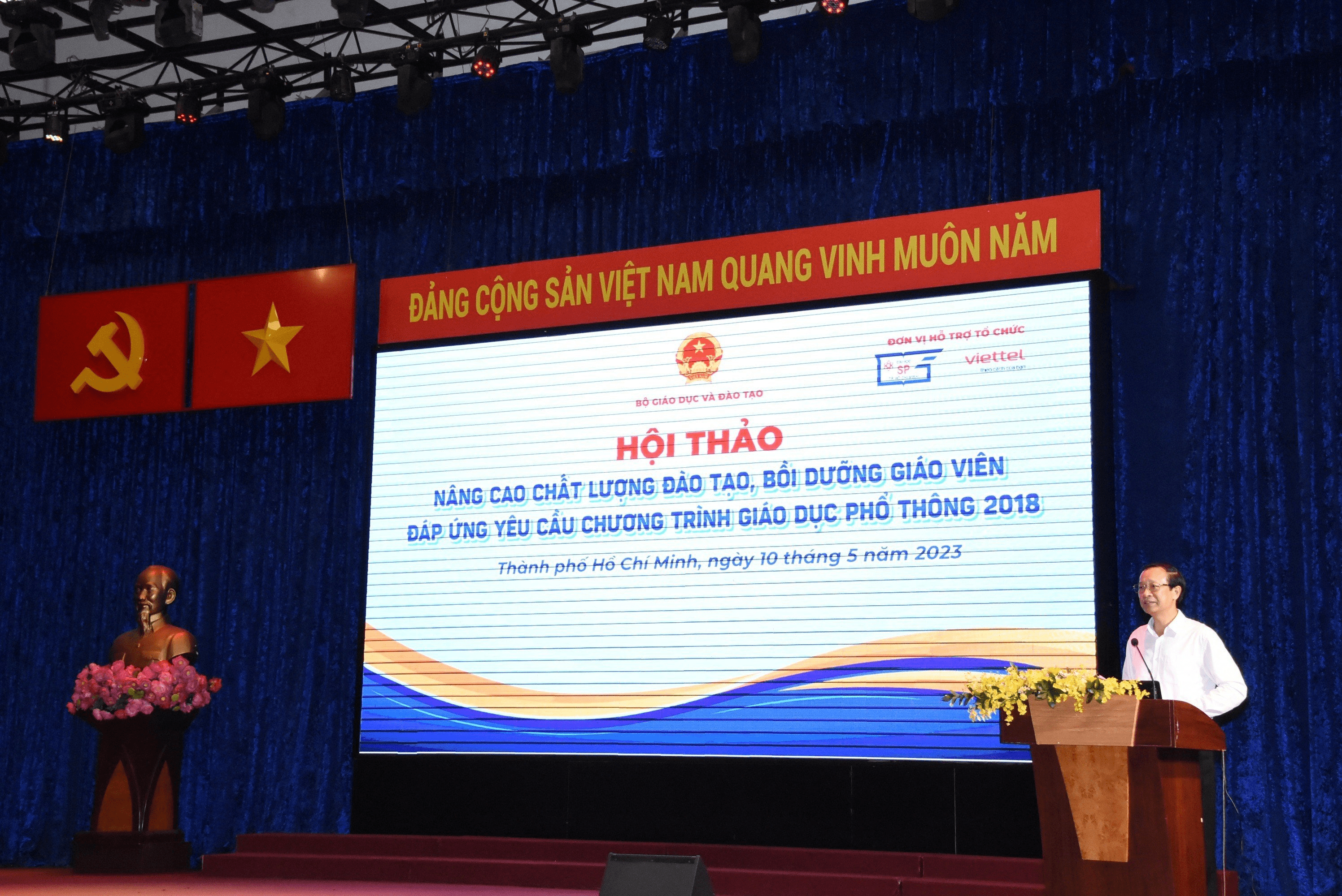 Nhằm đánh giá thực trạng và đưa ra các giải pháp nâng cao chất lượng đào tạo, bồi dưỡng giáo viên đáp ứng yêu cầu Chương trình Giáo dục Phổ thông 2018, ngày 10/5/2023, tại Hội trường B cơ sở 280 An Dương Vương, Trường Đại học Sư phạm Thành phố Hồ Chí Minh đã phối hợp với Bộ Giáo dục và Đào tạo tổ chức hội thảo “Nâng cao chất lượng đào tạo, bồi dưỡng giáo viên đáp ứng yêu cầu Chương trình giáo dục phổ thông 2018”.