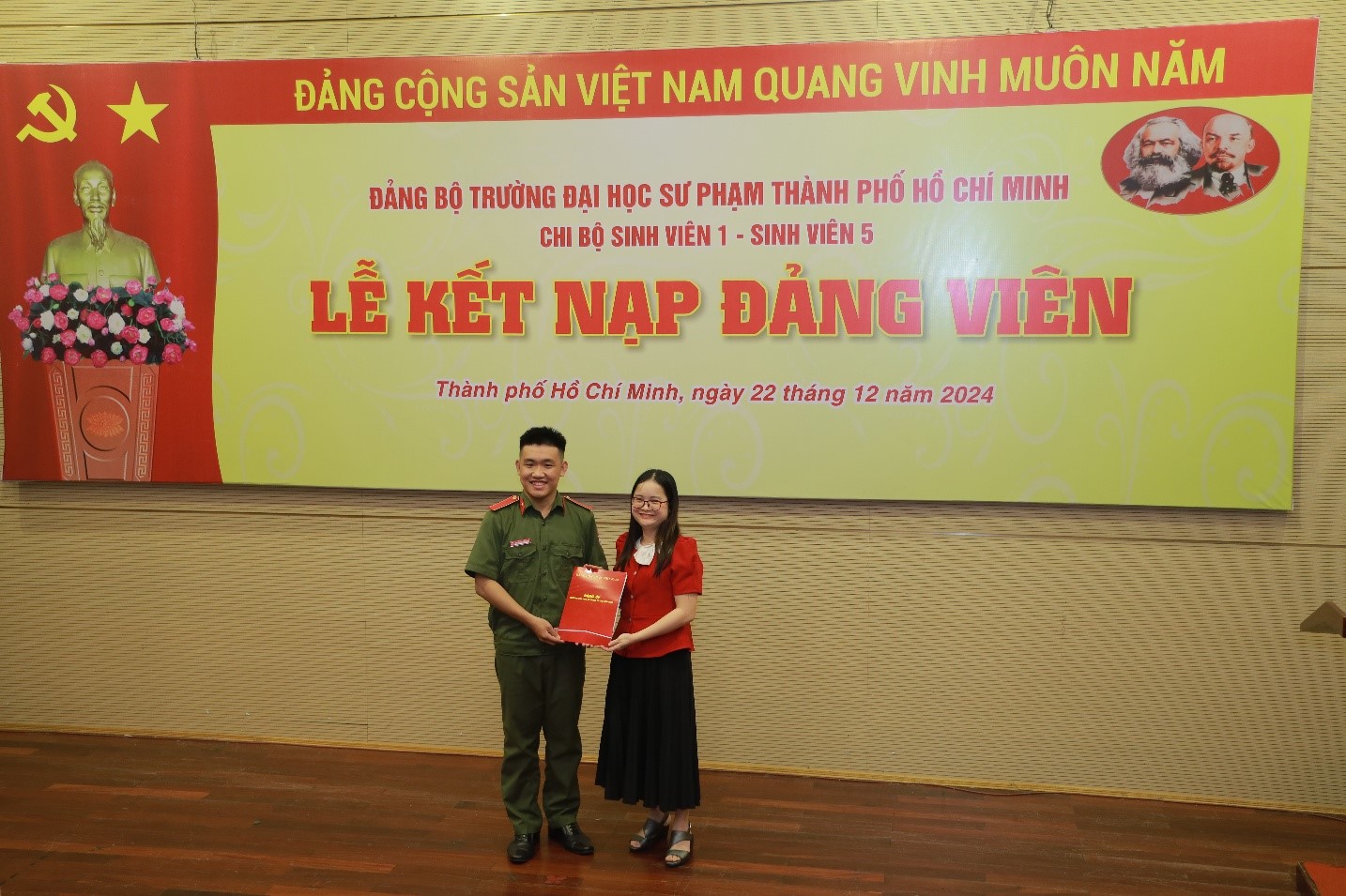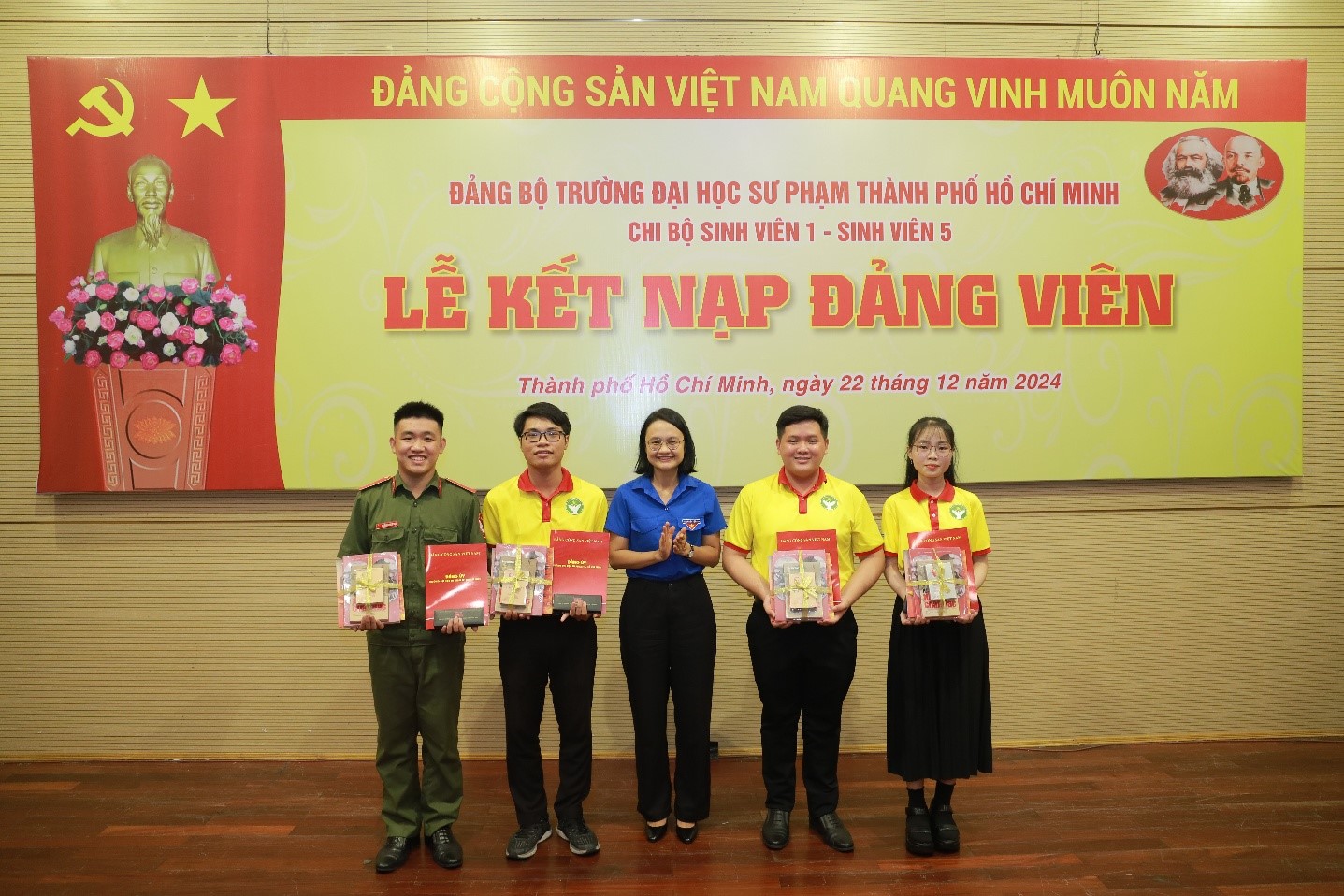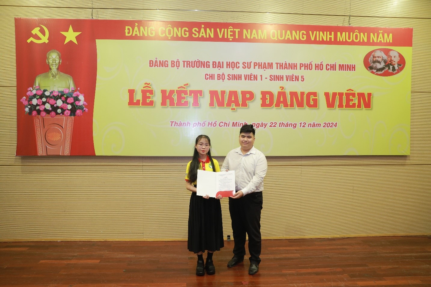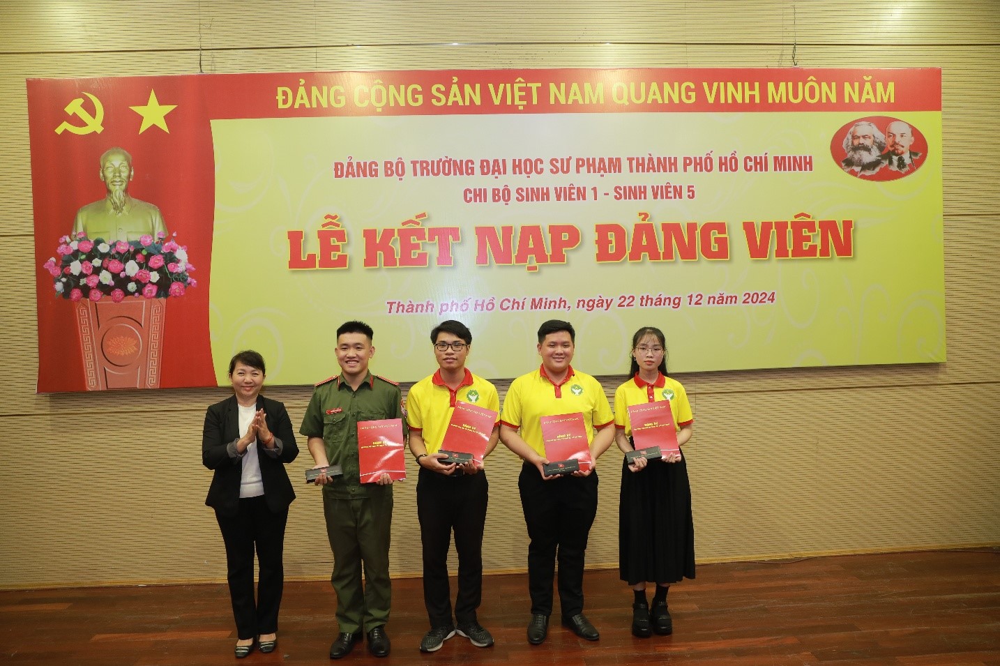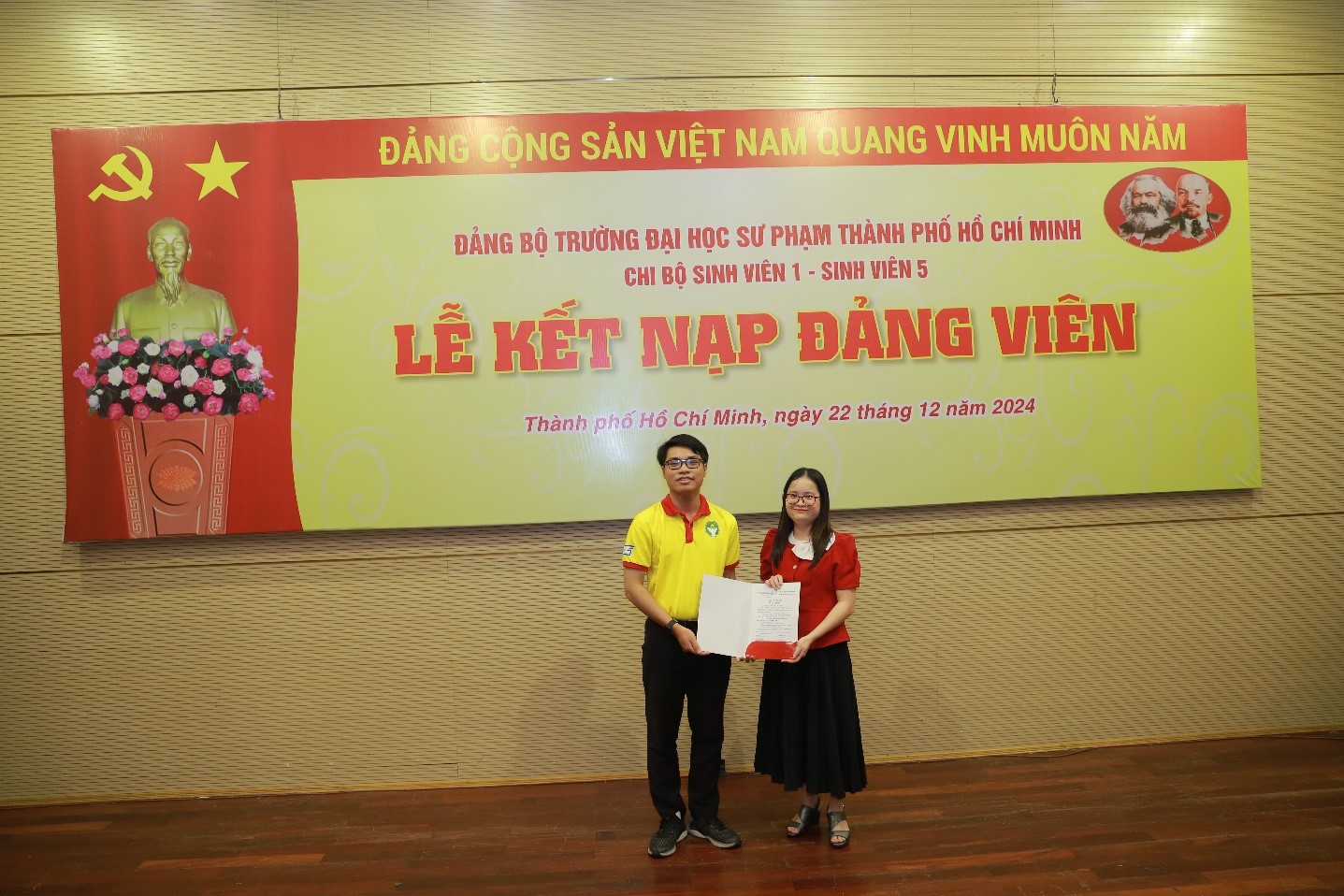 Được sự uỷ quyền của Đảng uỷ Trường Đại học Sư phạm Thành phố Hồ Chí Minh, đồng chí Phạm Thị Đào - Bí thư Chi bộ sinh viên 1 và đồng chí Võ Tuấn Hào - Phó Bí thư Chi bộ sinh viên 5 đã công bố và trao quyết định kết nạp Đảng cho 04 quần chúng: Nguyễn Đặng Hoàng Trọng, Phó Chủ tịch Hội Sinh viên Trường, sinh viên khoa Giáo dục Quốc phòng; Hồ Quốc Huy, Ủy viên Ban Thư ký Hội Sinh viên Trường, sinh viên khoa Tiếng Anh; Mai Xuân Chiến, Ủy viên Ban Thư ký Hội Sinh viên Trường, sinh viên khoa Sinh học và Nguyễn Thị Tố An, Chi hội Trưởng Chi hội 47.TRUNG.CNB, sinh viên khoa Tiếng Trung.