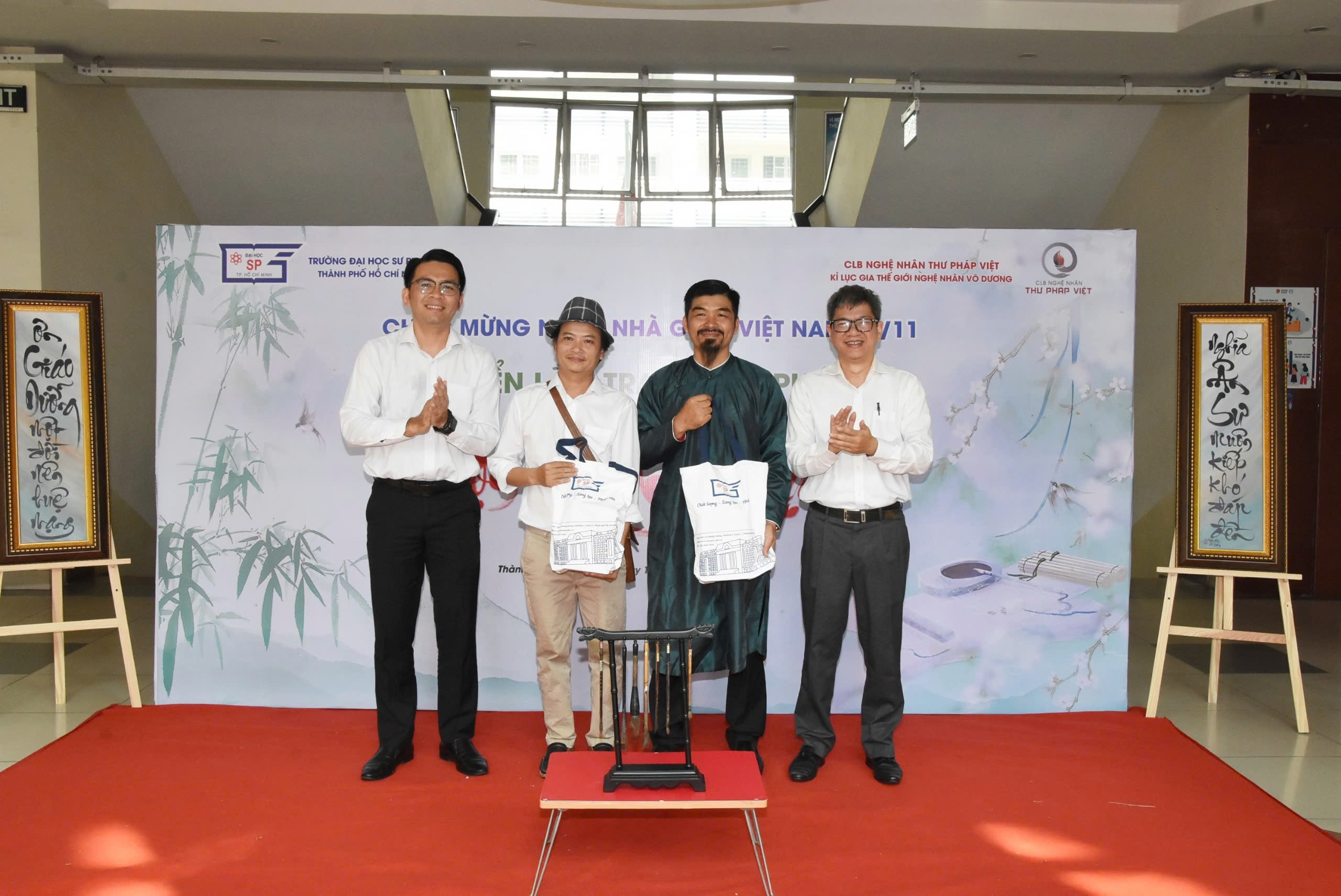 Nhân dịp này, Trường Đại học Sư phạm Thành phố Hồ Chí Minh đã có những món quà gửi tặng cho các nghệ nhân, họa sĩ vì sự đồng hành, lan toả những giá trị truyền thống văn hoá Việt Nam thông qua nghệ thuật thư pháp cho thầy cô và sinh viên Trường.