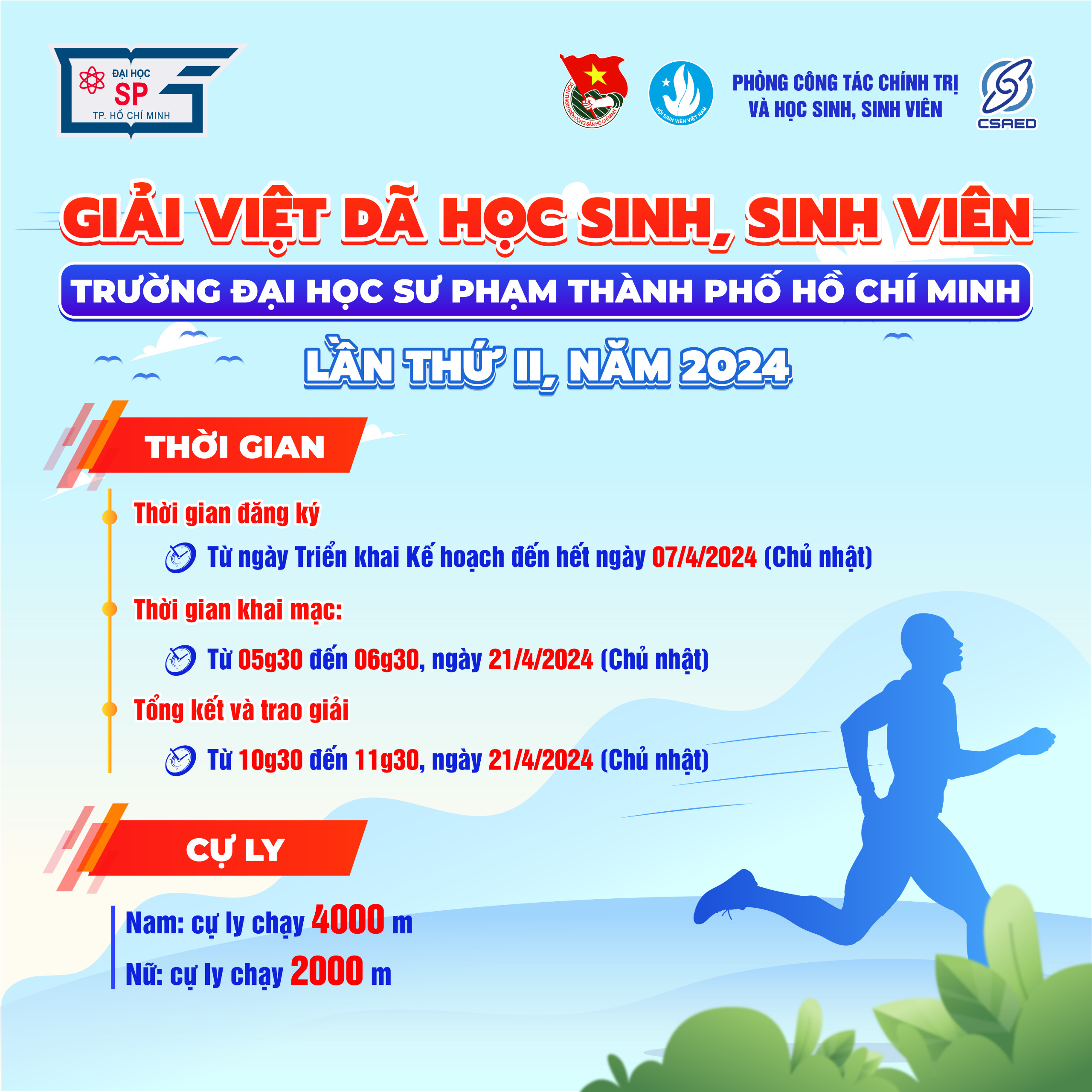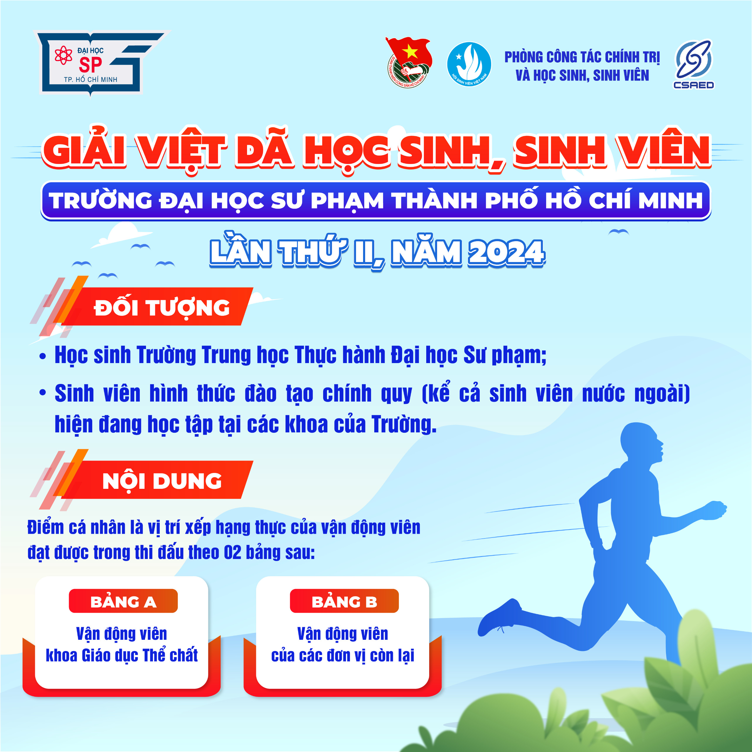 Nhằm đẩy mạnh phong trào “Toàn dân rèn luyện thân thể theo gương Bác Hồ vĩ đại”, thường xuyên tập luyện và thi đấu các môn thể thao để nâng cao sức khỏe, phát triển thể chất, góp phần giáo dục toàn diện cho sinh viên; Hưởng ứng chương trình “Mỗi thanh niên 10.000 bước chân mỗi ngày”, Trường tổ chức Giải Việt dã học sinh, sinh viên Trường Đại học Sư phạm Thành phố Hồ Chí Minh lần thứ II - Năm 2024. Cụ thể như sau: