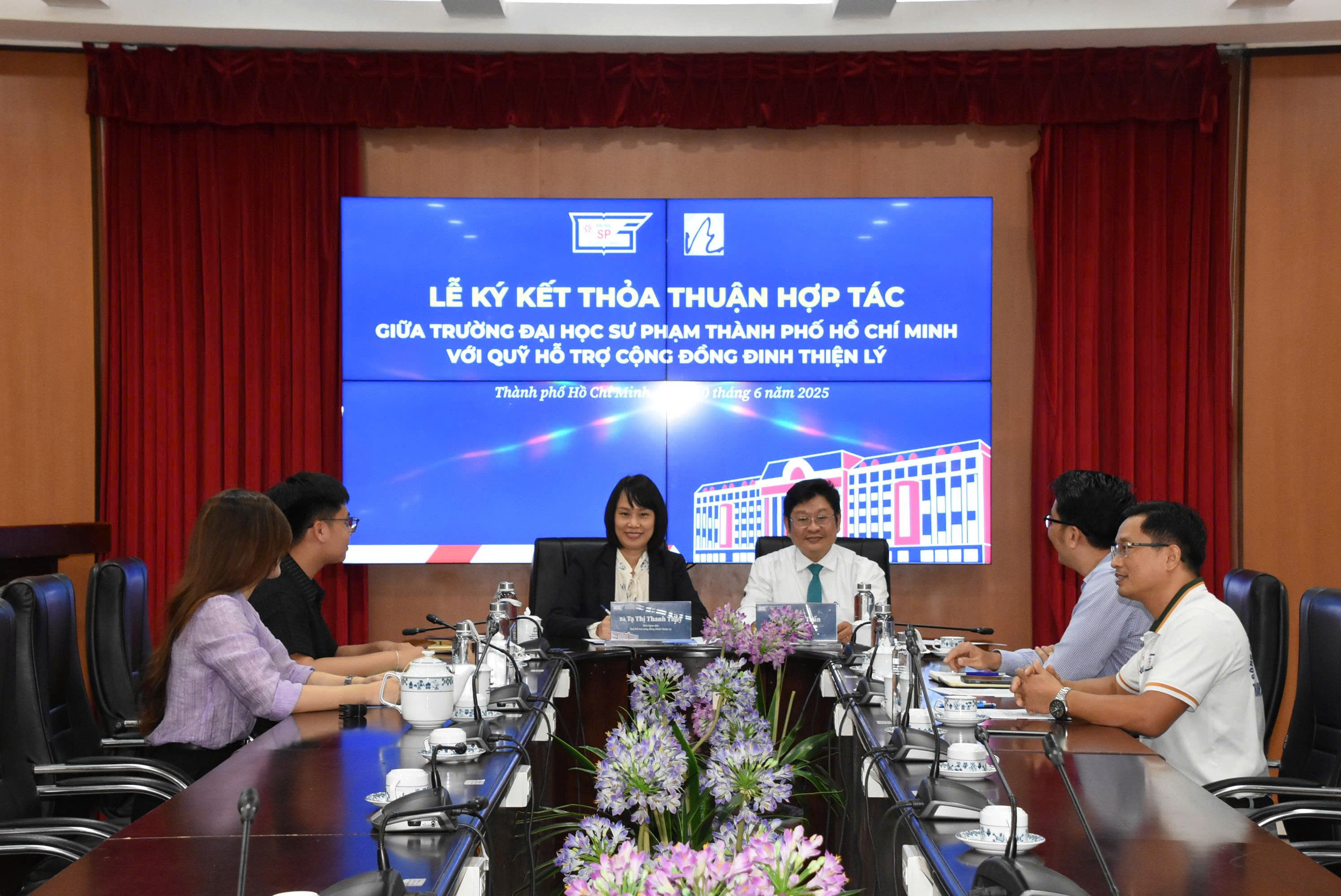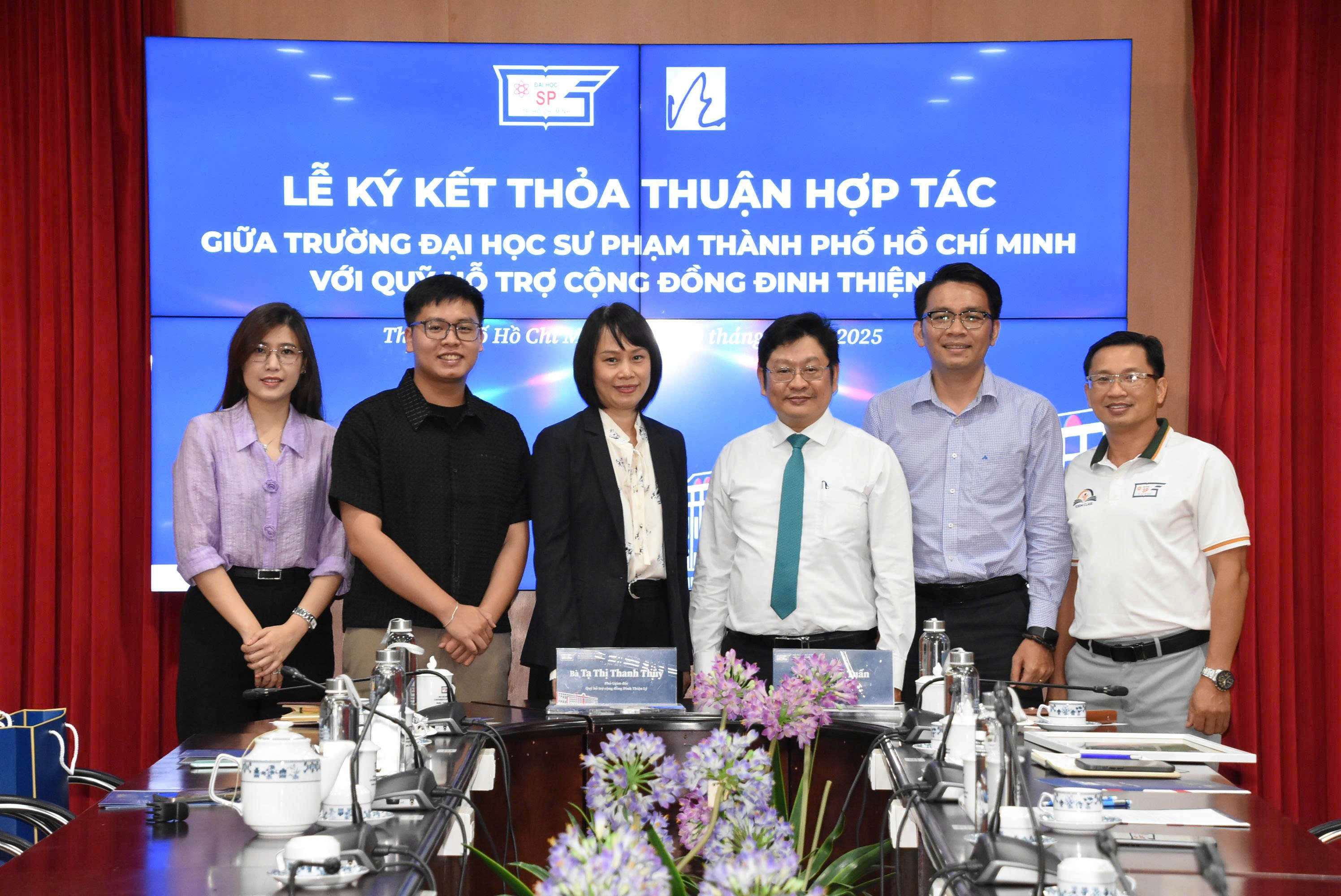 Đại diện Trường Đại học Sư phạm Thành phố Hồ Chí Minh và Quỹ Hỗ trợ Cộng đồng Đinh Thiện Lý ký kết Thỏa thuận hợp tác