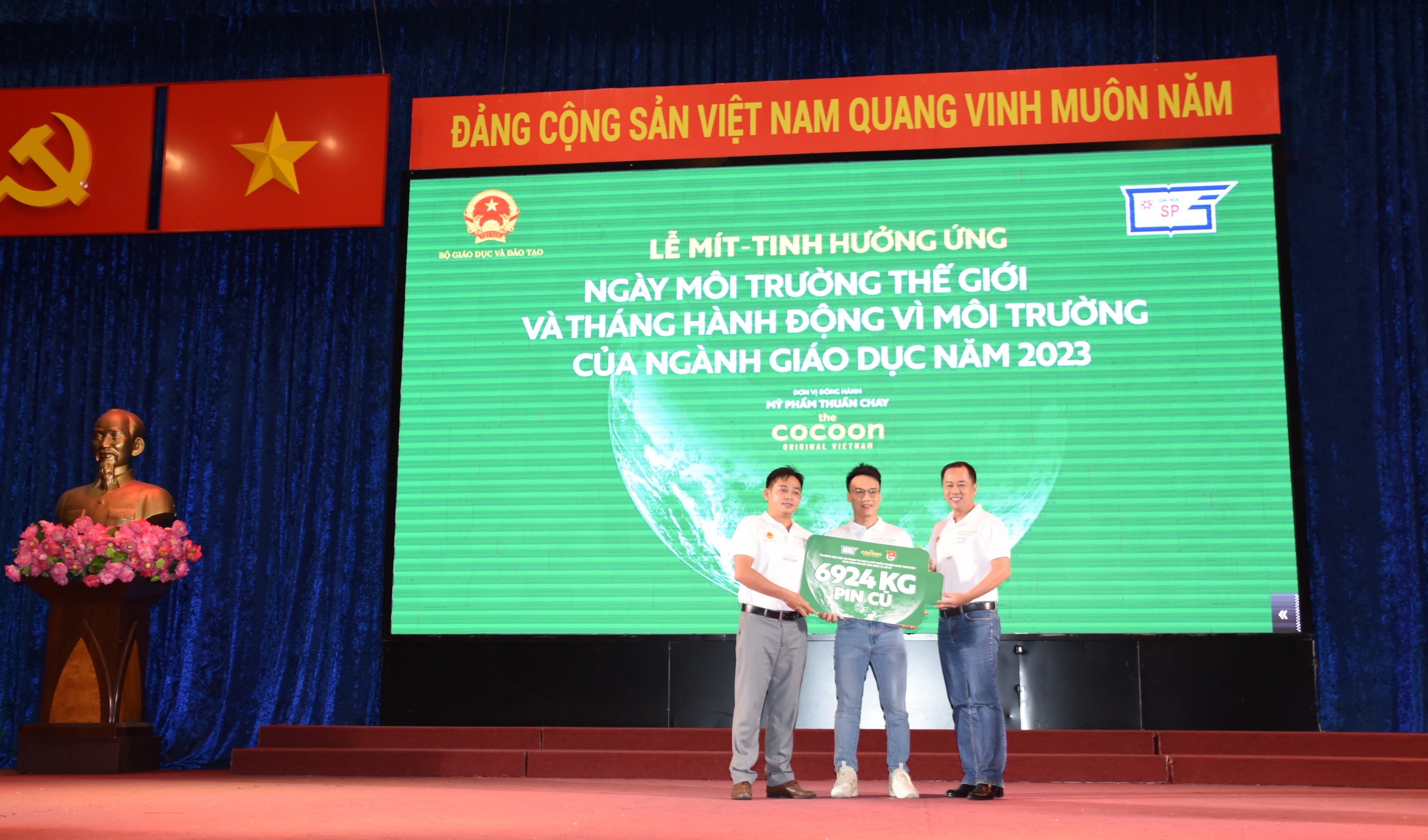 GS.TS. Huỳnh Văn Sơn - Hiệu trưởng Trường Đại học Sư phạm Thành phố Hồ Chí Minh trao bảng tổng kết thu gom pin.