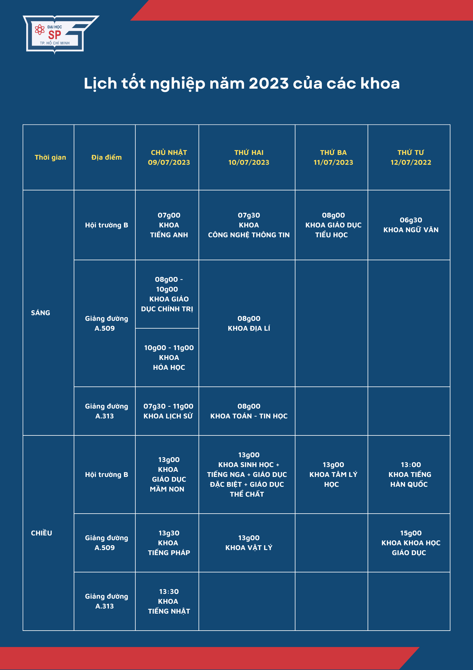Sáng ngày 08/7/2023 vừa qua, Trường Đại học Sư phạm Thành phố Hồ Chí Minh long trọng tổ chức Lễ tốt nghiệp và trao bằng cho 17 tân Tiến sĩ, 188 tân Thạc sĩ, 219 tân Cử nhân tốt nghiệp xuất sắc và Thủ khoa các ngành đào tạo năm 2023. Đây là sự kiện mở màn cho chuỗi chương trình lễ tốt nghiệp kéo dài từ ngày 08-12/7 của gần 2500 tân khoa của Trường.