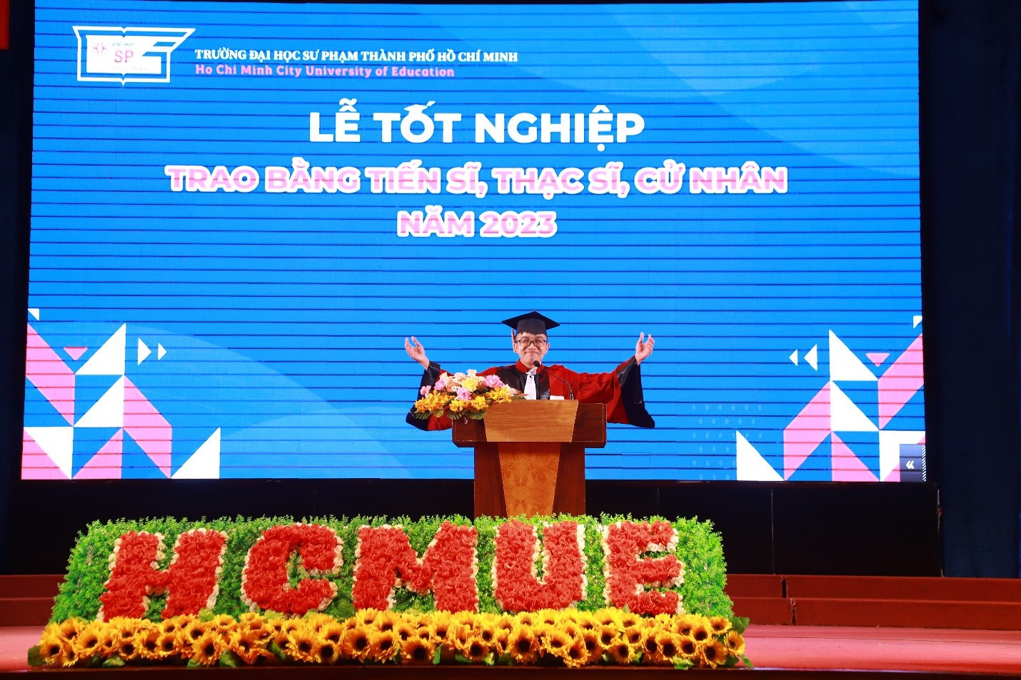 “Trường Đại học Sư phạm TP.HCM là nơi nhóm lửa, thắp lên niềm đam mê, niềm tin yêu vào sức mạnh nội tại. Quý Thầy Cô là người truyền lửa, truyền trao tri thức và sự nhiệt tâm với nghề. Đến thế hệ chúng ta - các tân Tiến sĩ, tân Thạc sĩ cần trở thành những người giữ lửa, giữ vững ngọn lửa học tập, nghiên cứu và thực hành nghề nghiệp một cách chân chính.” - Tân Tiến sĩ Giang Thiên Vũ, người nhận học vị tiến sĩ khi vừa tròn 30 tuổi và là NCS học thẳng chương trình Đào tạo Tiến sĩ không qua Thạc sĩ gửi đến các thế hệ người học của trường.