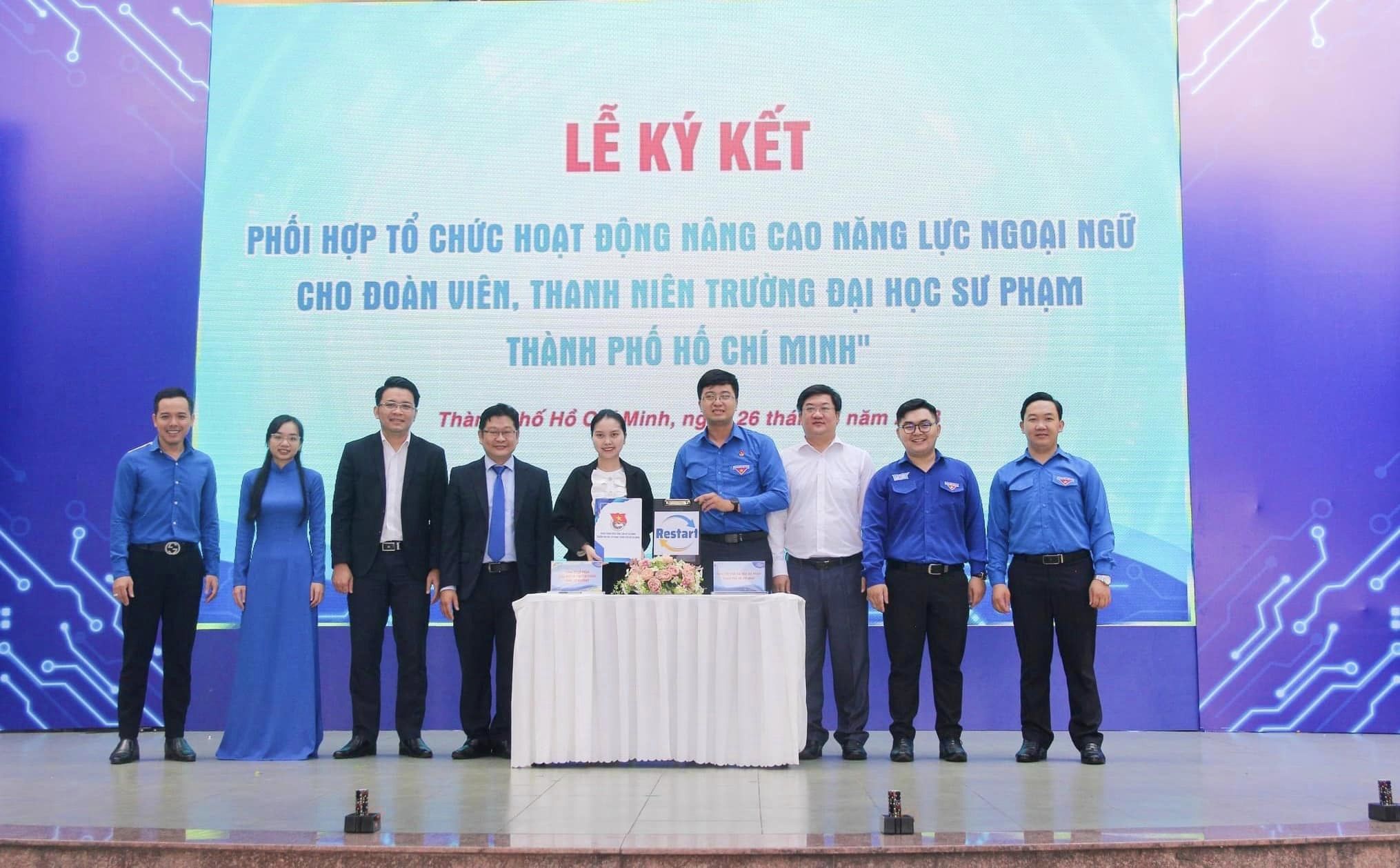 Với mong muốn nâng cao năng lực ngoại ngữ cho cán bộ Đoàn các cấp và đoàn viên, thanh niên Trường, trong Lễ khai mạc, Đoàn Trường Đại học Sư phạm Thành phố Hồ Chí Minh đã tiến hành ký kết biên bản ghi nhớ hợp tác với Công ty Cổ phần Giáo dục và Truyền thông quốc tế Restart về việc triển khai các hoạt động nâng cao năng lực ngoại ngữ cho cán bộ Đoàn, đoàn viên, thanh niên Trường.