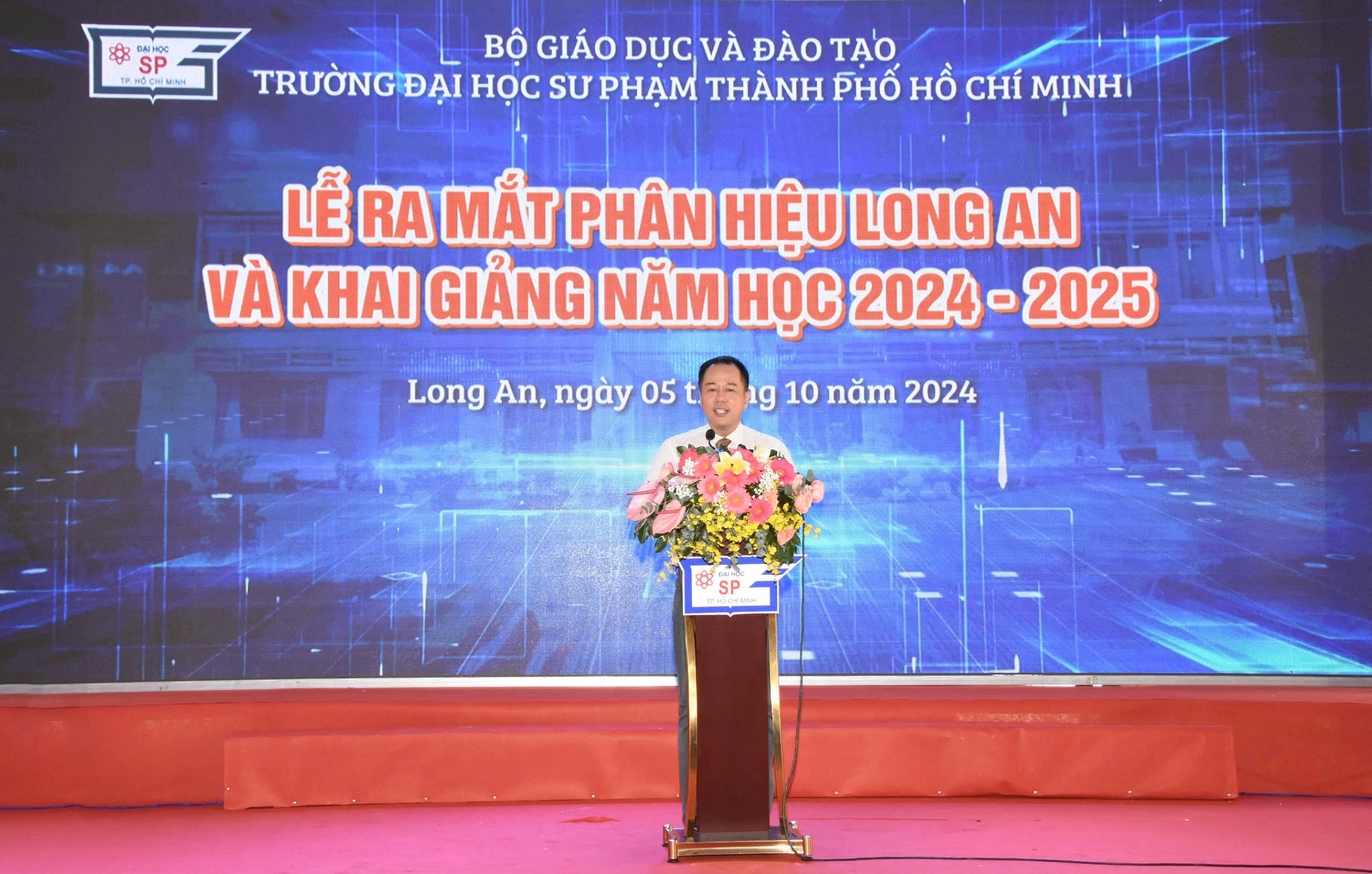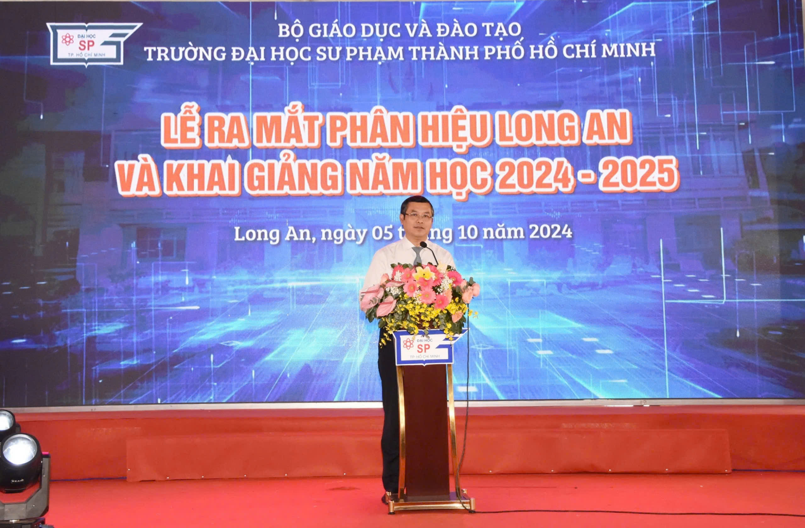 Thay mặt Ban Giám hiệu, cùng tập thể cán bộ giảng viên và người học, GS.TS. Huỳnh Văn Sơn, Hiệu trưởng Trường Đại học Sư phạm Thành phố Hồ Chí Minh bày tỏ niềm vui mừng khi được Đảng, Nhà nước, Bộ GD&ĐT, tỉnh Long An quan tâm đến Nhà trường và Phân hiệu tại Long An. Với niềm vui thành lập Phân hiệu mới, GS.TS. Huỳnh Văn Sơn cho biết, việc hoàn thành đề án sáp nhập Trường Cao đẳng Sư phạm Long An thành phân hiệu tại Long An đã được Nhà trường dành tâm sức trong hơn 3 năm, nhấn mạnh Phân hiệu Long An của Trường được hình thành nhằm phục vụ nhu cầu phát triển kinh tế - xã hội vùng ĐBSCL thông qua đào tạo nguồn nhân lực chất lượng cao, có kiến thức tốt, năng lực và sự linh hoạt thích ứng với nền kinh tế hội nhập và biến đổi liên tục. Hiệu trưởng cũng gửi lời chúc mừng tới các tân sinh viên, nhắn nhủ về “sự tự hào”: “Cảm ơn các bạn đã chọn Nhà trường gắn bó, để tận hưởng hành trình tuyệt vời trong cuộc đời. Tôi mong các bạn hãy sống cuộc đời sinh viên thật đáng tự hào.” Thầy hy vọng, sau khi tốt nghiệp, các sinh viên tại Phân hiệu sẽ góp sức nhiều hơn cho ngành Giáo dục tỉnh Long An và khu vực.