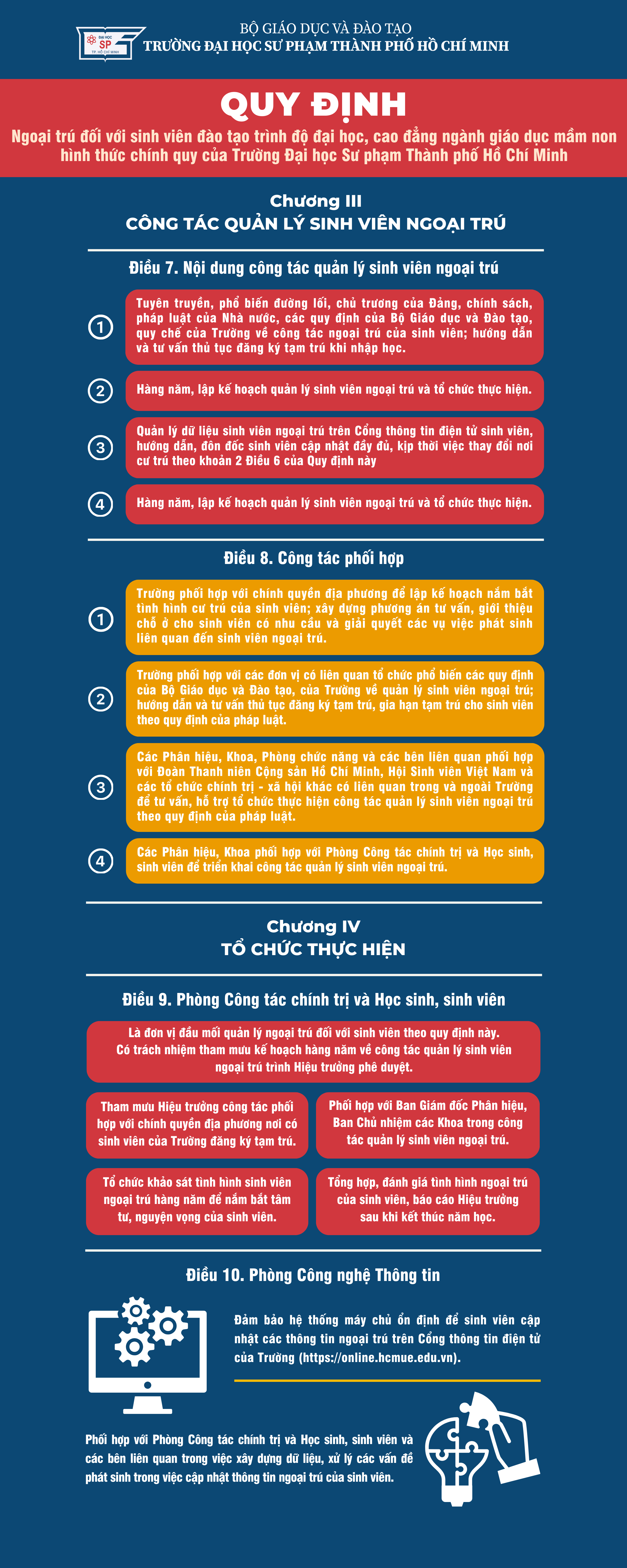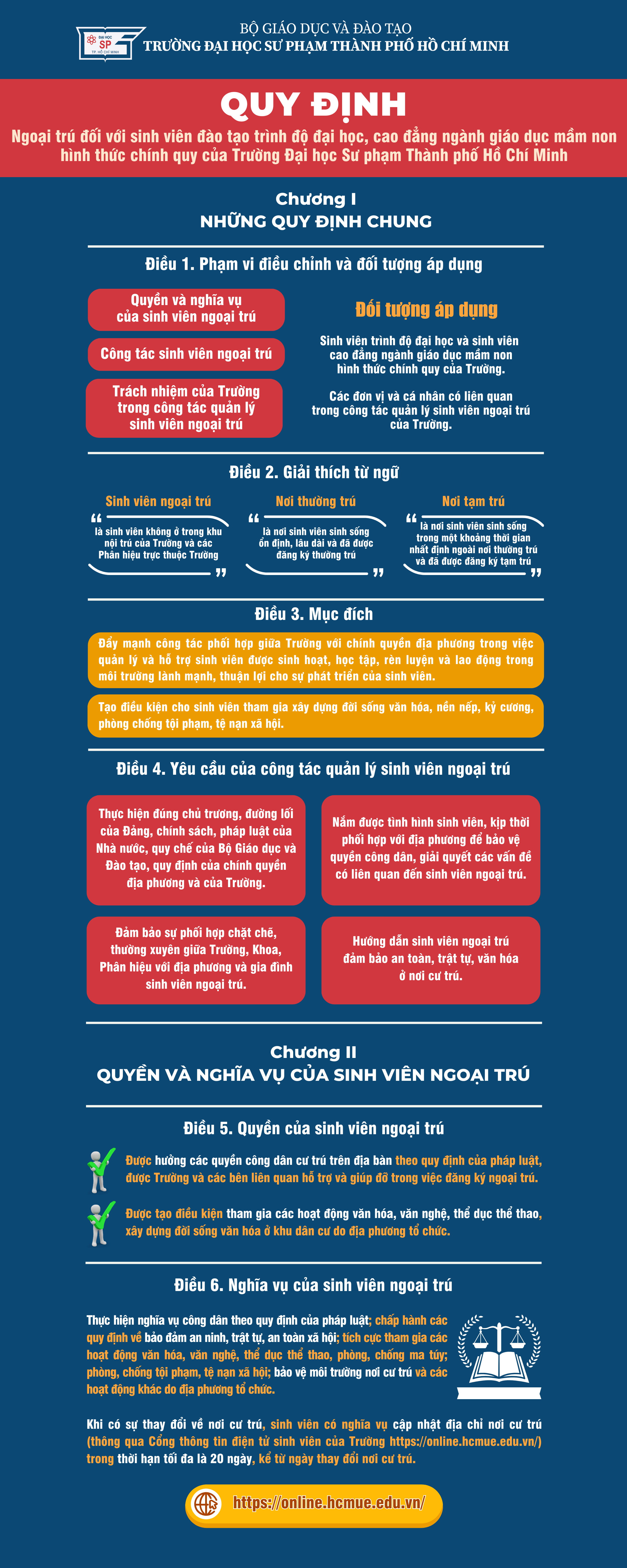Phòng Công tác chính trị và Học sinh, sinh viên xin trân trọng giới thiệu Quy định ngoại trú đối với sinh viên đào tạo trình độ đại học, cao đẳng ngành giáo dục mầm non hình thức chính quy của Trường Đại học Sư phạm Thành phố Hồ Chí Minh.