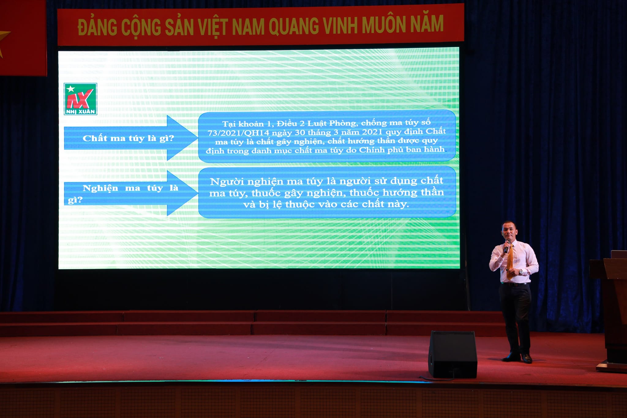 Tại buổi sinh hoạt chuyên đề, Đ/c Ngô Quốc Việt - Phó Giám đốc Cơ sở xã hội Nhị Xuân đã chia sẻ với toàn thể hội trường về luật phòng, chống ma túy, tác hại của ma túy và cách thức nhận biết các loại ma úy. Ma túy đang là hiểm họa, vấn nạn của toàn nhân loại, làm gia tăng tội phạm, bạo lực, làm suy thoái nhân cách, phẩm giá, tàn phá cuộc sống bình yên của gia đình, cộng đồng, làm xói mòn đạo lý, gây ra những hậu quả tiêu cực về kinh tế - xã hội. Cuộc đấu tranh, phòng, chống tội phạm, tệ nạn ma túy ngày càng cam go và quyết liệt. Và là một đoàn viên, thanh niên trước những nguy cơ tiềm tàng của ma túy, chúng ta đẩy đùi ma túy, ngăn chặn tận gốc sự len lõi của ma túy vào cuộc sống, đặc biệt là môi trường học đường.
