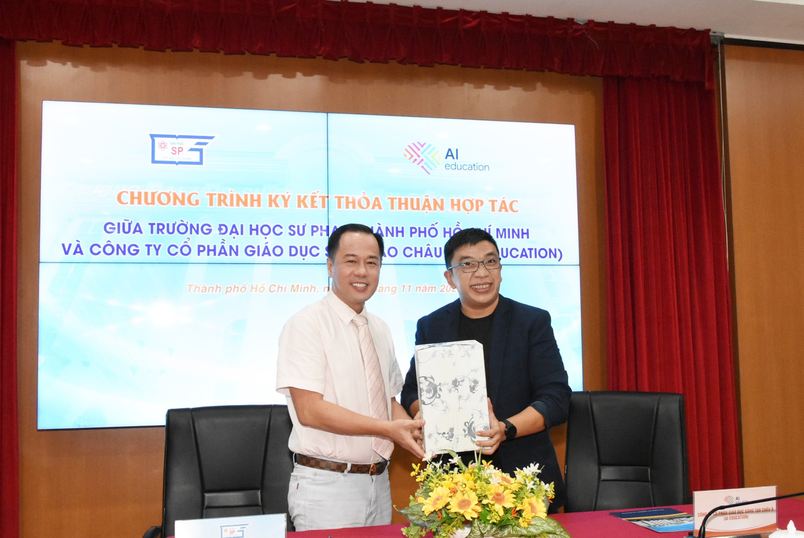 Cuối buổi lễ, GS.TS Huỳnh Văn Sơn đã đại diện cho trường Đại học Sư phạm Thành phố Hồ Chí Minh nhận món quà đầy ý nghĩa từ Ông Bung Trần - Chủ tịch AI Education và Nhà báo Vĩnh Thắng - chủ tịch Hội đồng cố vấn AI Education nhân dịp kỷ niệm 40 năm ngày Nhà giáo Việt Nam 20-11.