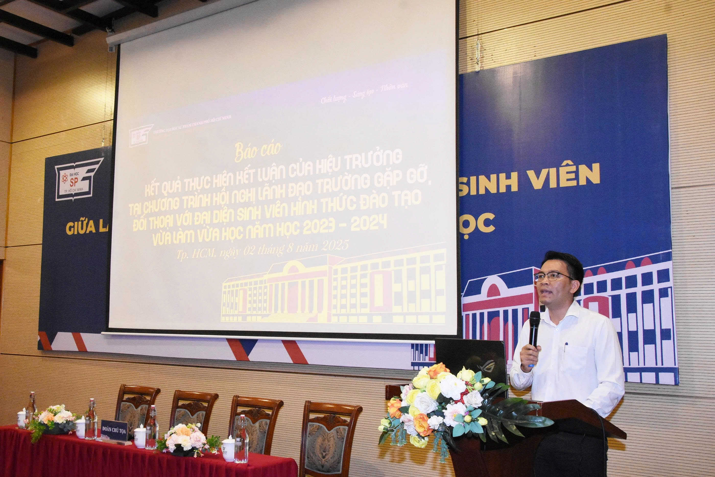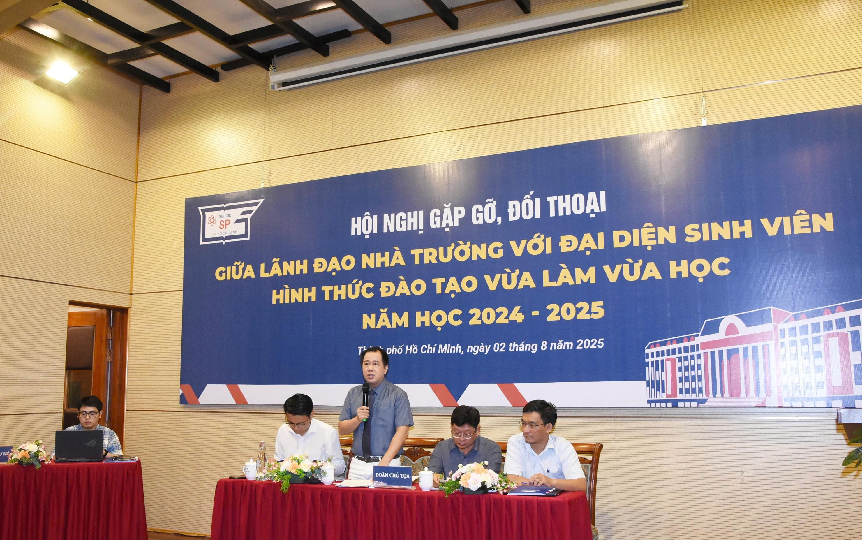 Vào chiều ngày 02/8/2025, tại phòng A.509, Trường Đại học Sư phạm Thành phố Hồ Chí Minh đã tổ chức Hội nghị gặp gỡ, đối thoại giữa lãnh đạo Trường với đại diện sinh viên vừa làm vừa học năm học 2024 - 2025. Tham dự và chỉ trì Hội nghị có GS.TS Huỳnh Văn Sơn - Hiệu trưởng Nhà trường, TS. Cao Anh Tuấn - Phó Hiệu trưởng Nhà trường; đại diện lãnh đạo các cơ sở liên kết đào tạo, lãnh đạo các Phòng, Khoa, đơn vị trực thuộc cùng hơn 70 sinh viên đại diện cho các lớp hệ vừa làm vừa học của Trường.