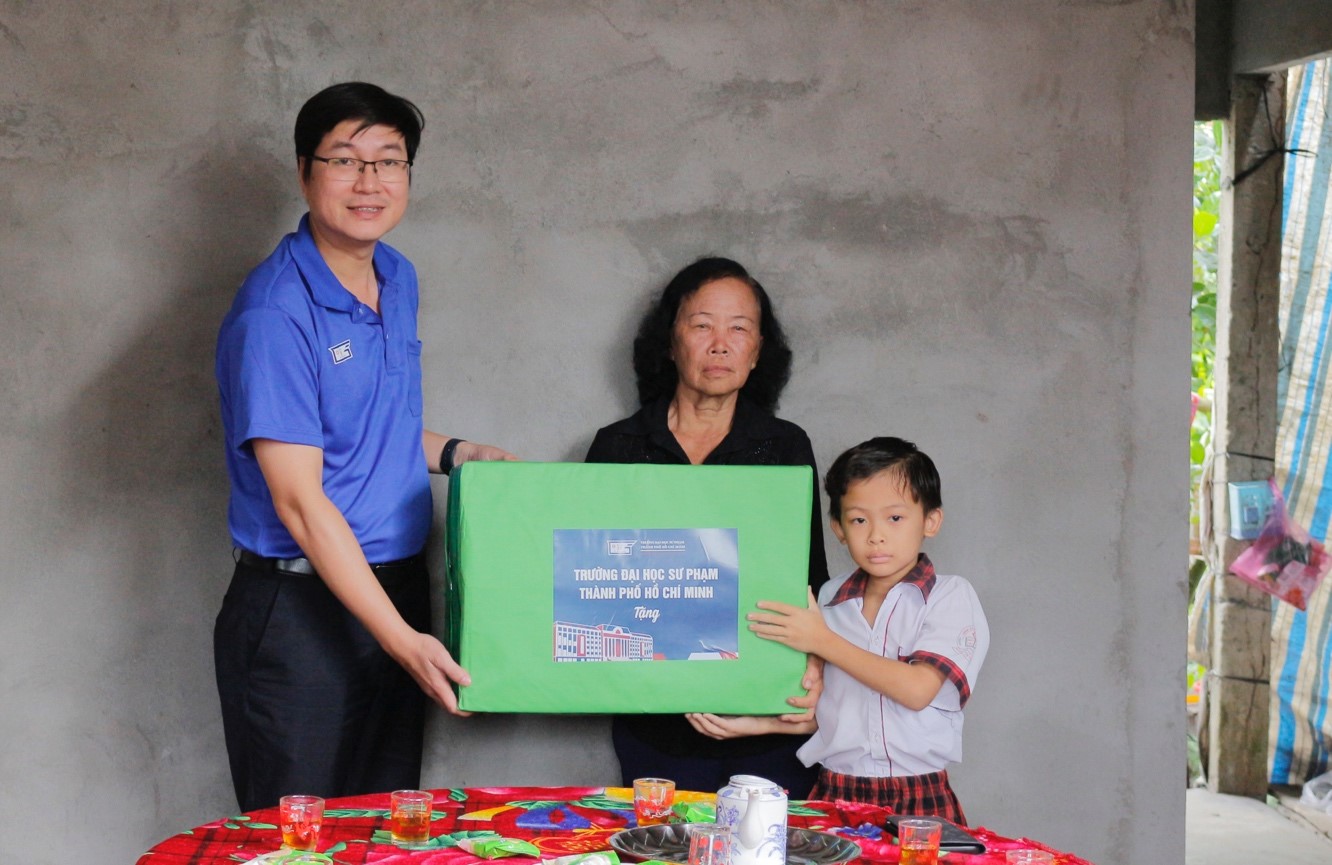 Trong không khí ấm áp và thân tình, Hiệu trưởng Trường Đại học Sư phạm Thành phố Hồ Chí Minh GS.TS. Huỳnh Văn Sơn ân cần hỏi thăm, động viên và mong muốn đây sẽ là một món quà của nhà trường và đơn vị tài trợ dành tặng để khích lệ tinh thần học tập cho em Nguyễn Đại Phong, góp phần cải thiện đời sống vật chất, tinh thần cho gia đình học sinh hiếu học.