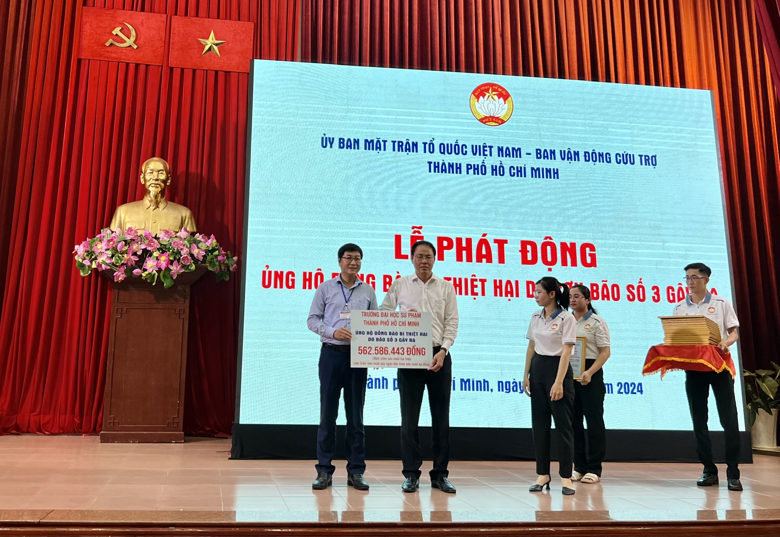 Ngày 10/9, hưởng ứng lời kêu gọi của Đoàn chủ tịch Ủy ban Trung ương Mặt trận Tổ quốc Việt Nam, Trường Đại học Sư phạm Thành phố Hồ Chí Minh đã vận động viên chức, người lao động, người học và cựu người học phát huy truyền thống “tương thân, tương ái”, “nhường cơm sẻ áo”, chung tay chia sẻ ủng hộ người dân vùng bị thiệt hại do cơn bão số 3 gây ra, khẳng định giá trị cốt lõi “Chất lượng - Sáng tạo - Nhân văn” của Nhà trường.