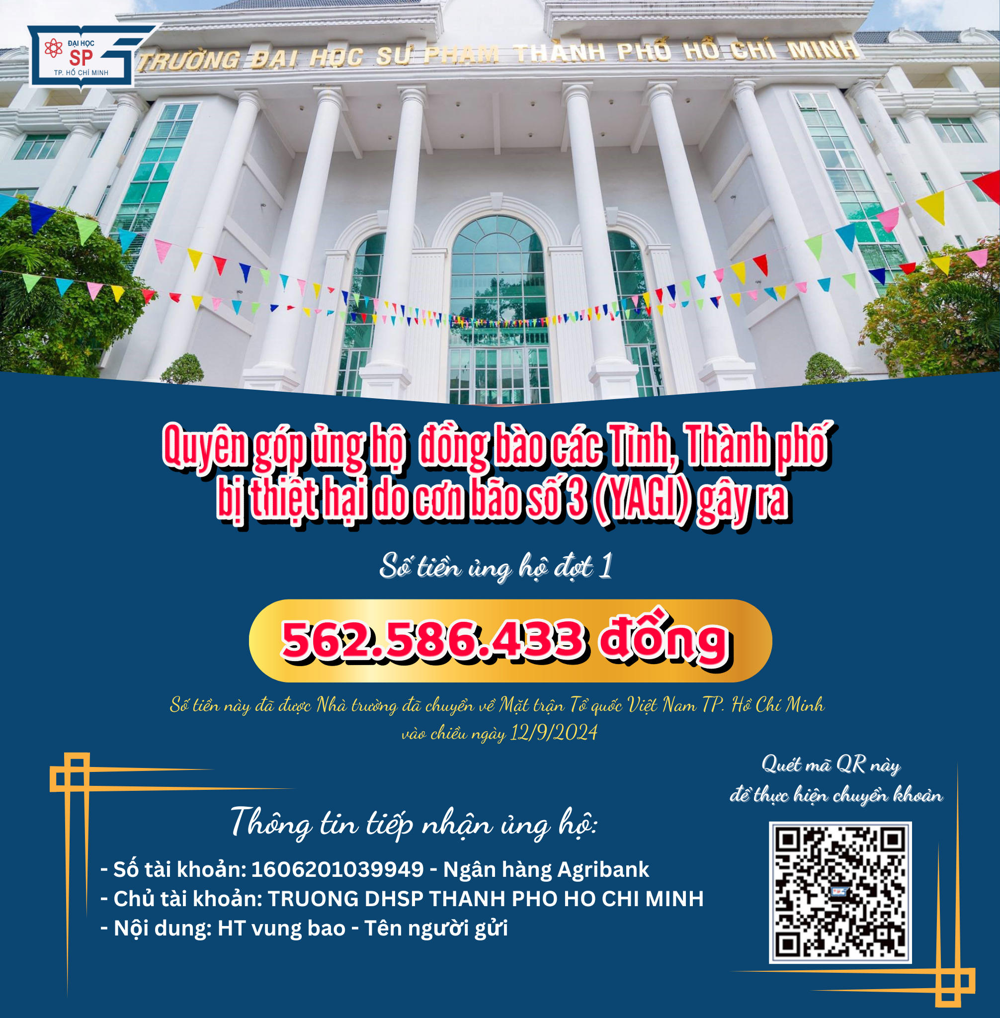 Sau 24g phát động, chiều ngày 12/9/2024, Nhà trường đã đóng góp về Mặt trận Tổ quốc Việt Nam Thành phố Hồ Chí Minh với tổng số tiền là 562.586.433 đồng (đợt 1) để kịp thời hỗ trợ cho người dân vùng bị thiệt hại do cơn bão số 3 gây ra. Trong đợt này, Trường đã tiếp nhận được 362.586.433 đồng chia sẻ ủng hộ người dân vùng bị thiệt hại do cơn bão số 3 gây ra từ 246 viên chức, người lao động và 1.118 người học, cựu người học. Song song đó, Nhà trường đã trích 200.000.000 đồng từ nguồn kinh phí hoạt động sự nghiệp của Nhà trường để ủng hộ đợt 1 này.