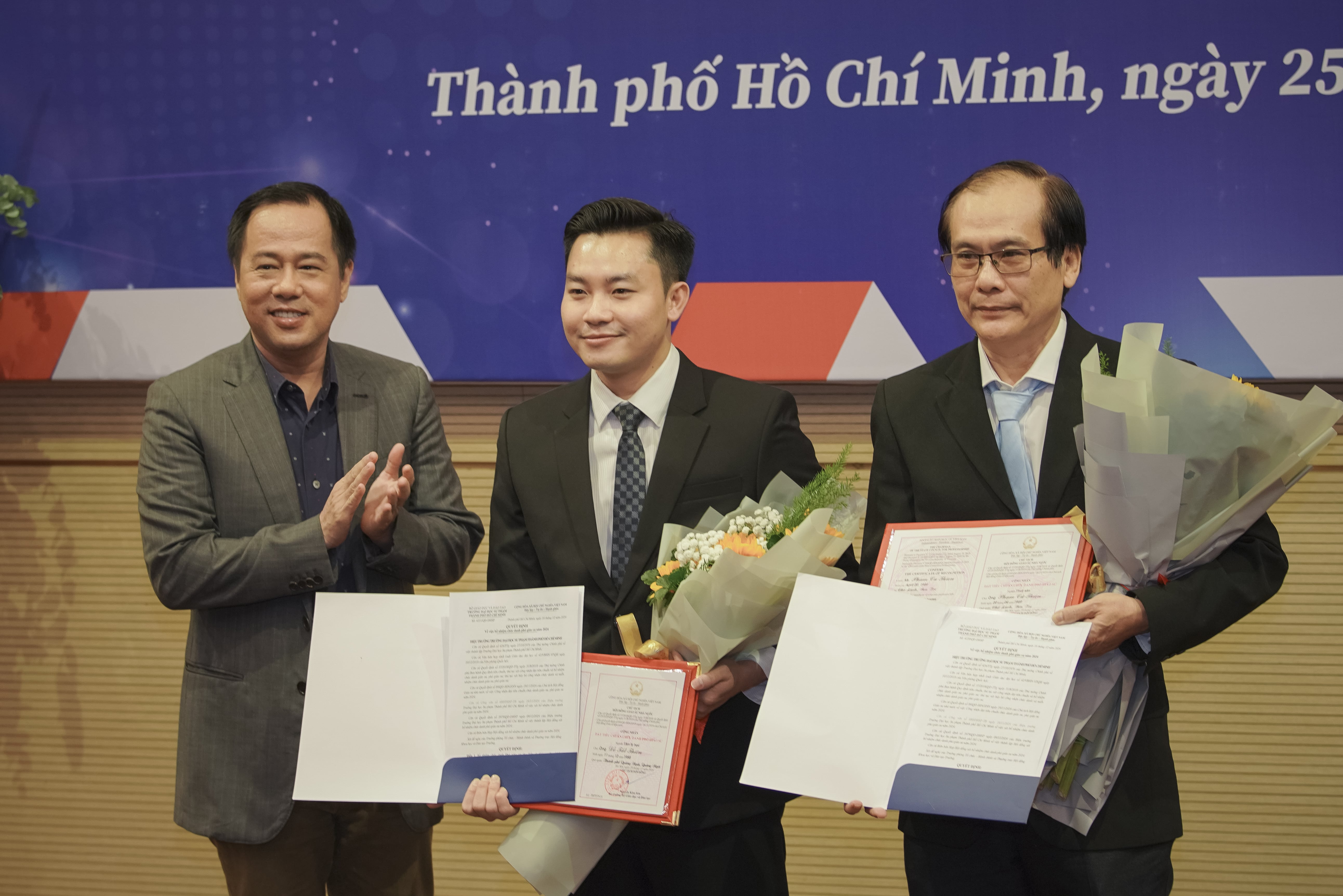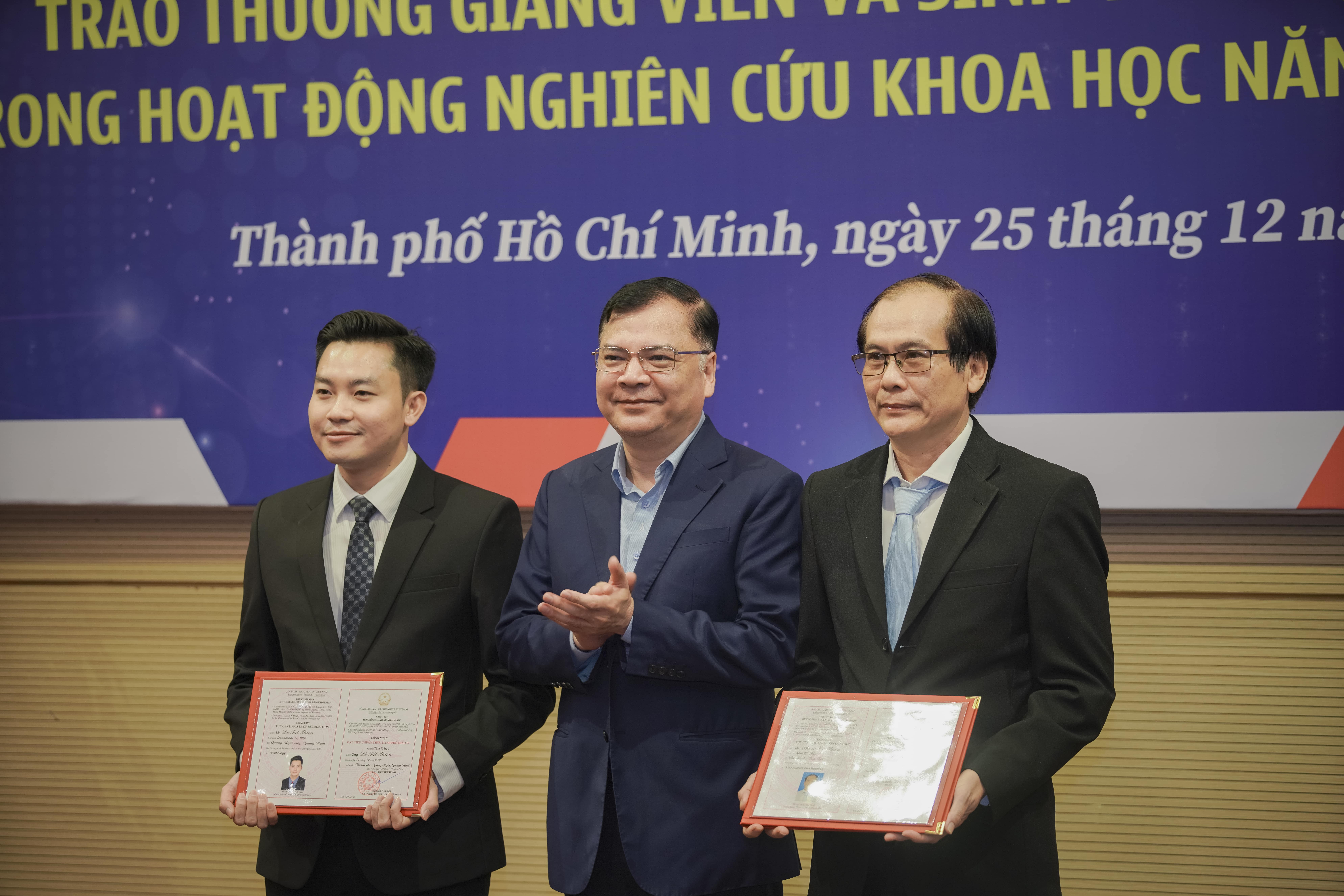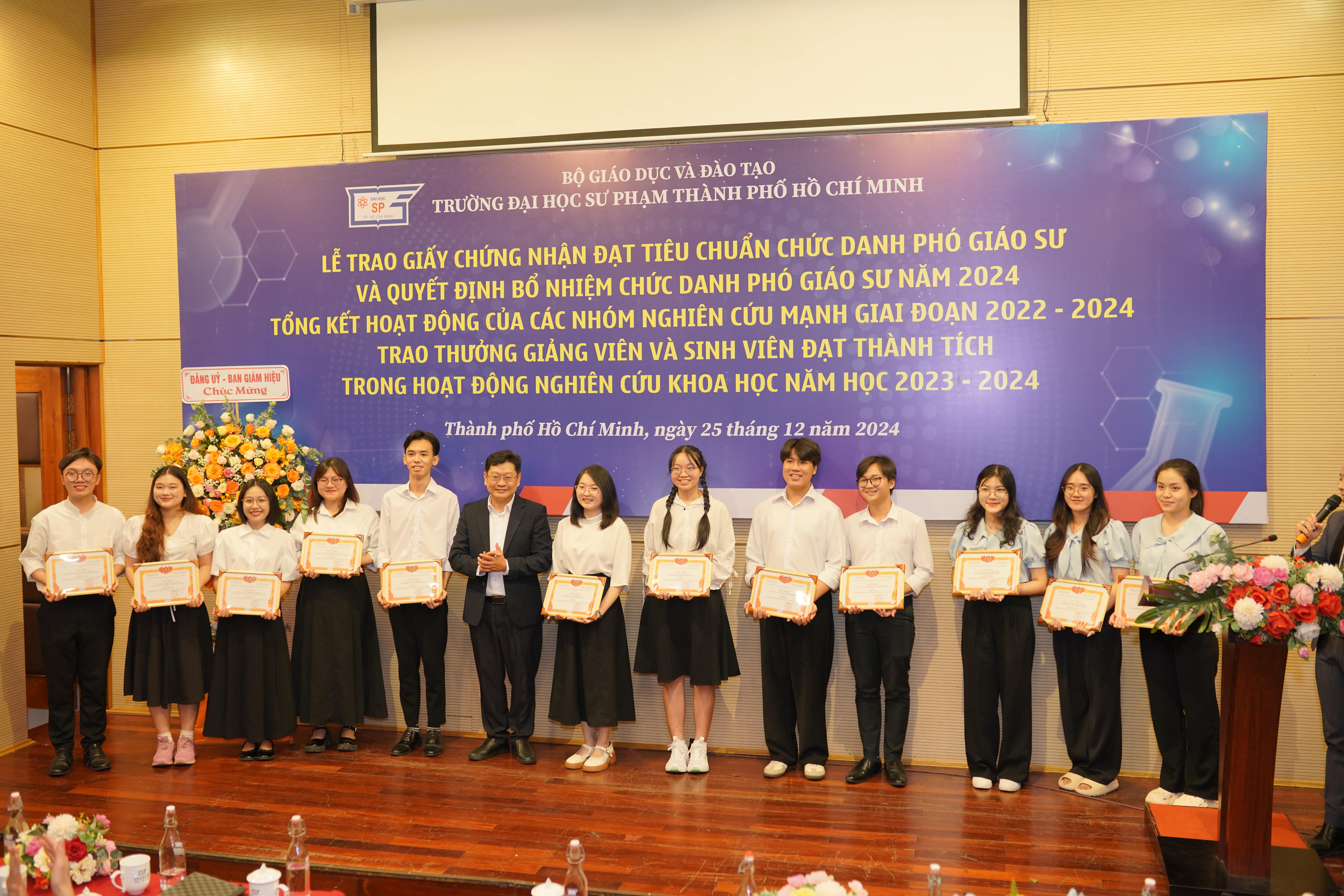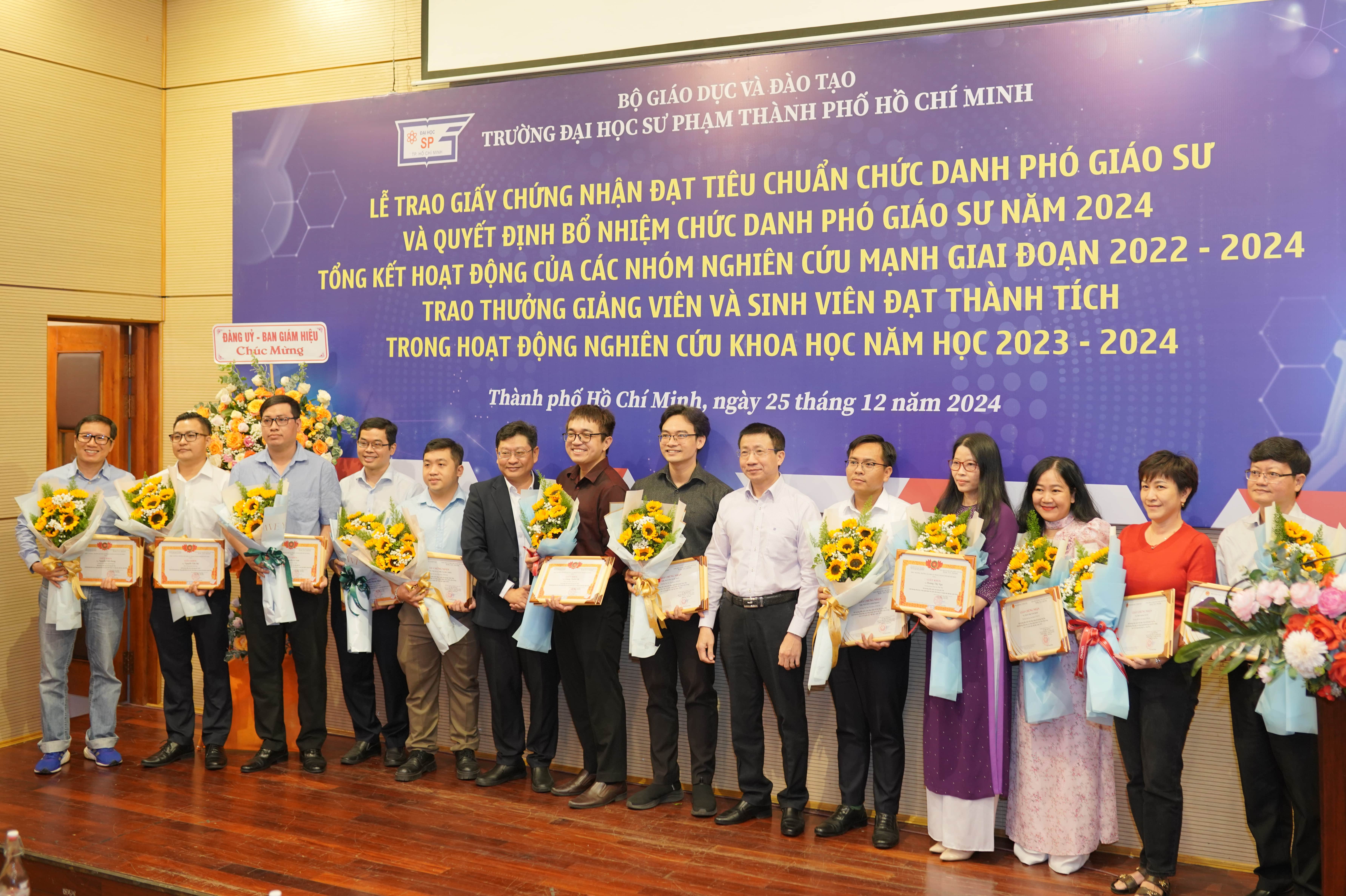 Chiều ngày 25/12/2024, Trường Đại học Sư phạm Thành phố Hồ Chí Minh (HCMUE) đã long trọng tổ chức một buổi lễ đặc biệt với 03 hoạt động nổi bật: trao Giấy chứng nhận đạt tiêu chuẩn chức danh Phó Giáo sư và Quyết định bổ nhiệm chức danh Phó Giáo sư năm 2024, tổng kết hoạt động của các Nhóm nghiên cứu mạnh giai đoạn 2022 - 2024, và trao thưởng cho giảng viên, sinh viên có thành tích xuất sắc trong công tác nghiên cứu khoa học (NCKH). Buổi lễ không chỉ là dịp để ghi nhận những thành tựu nổi bật mà còn khẳng định vị thế và vai trò của HCMUE trong công tác giáo dục và nghiên cứu khoa học.