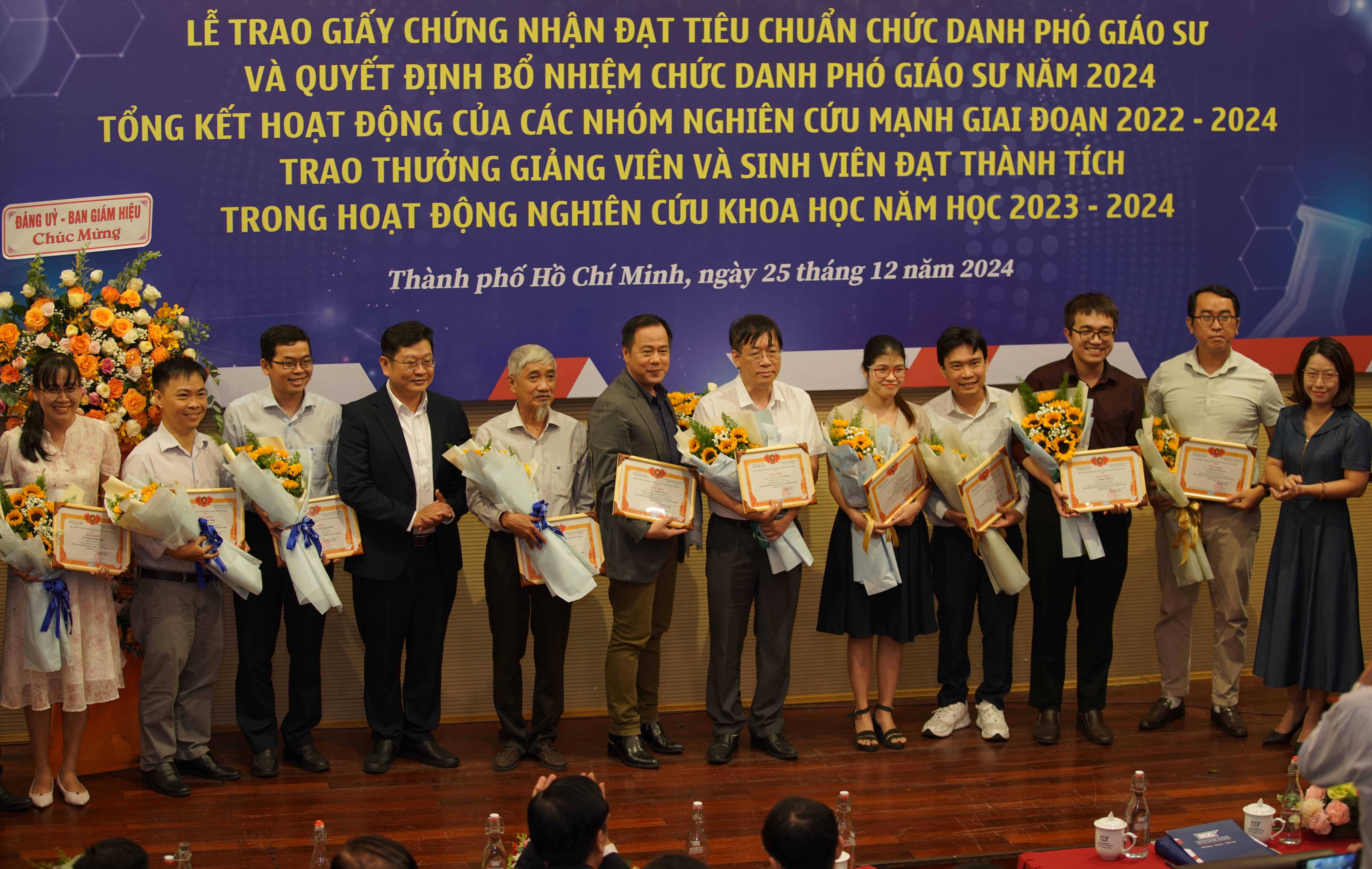 Các Giảng viên và Sinh viên đạt thành tích cao tại Giải thưởng KH&CN dành cho SV năm 2024 nhận khen thưởng tại buổi lễ.