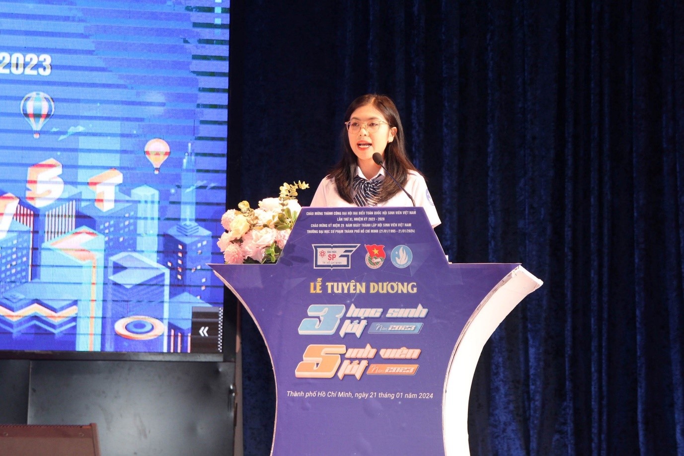 Phát biểu nhận định về việc triển khai phong trào “Sinh viên 5 tốt” và “Học sinh 3 tốt” năm 2023 tại Trường Đại học Sư phạm Thành phố Hồ Chí Minh, đồng chí Nguyễn Minh Uyên - Uỷ viên Ban Thường vụ Đoàn Trường, Chủ tịch Hội Sinh viên Việt Nam Trường đã chỉ ra những mặt thành công và những vấn đề cần tiếp tục quan tâm, chú ý đẩy mạnh trong năm 2024, đồng thời phát động phong trào trong toàn thể học sinh, sinh viên Trường.