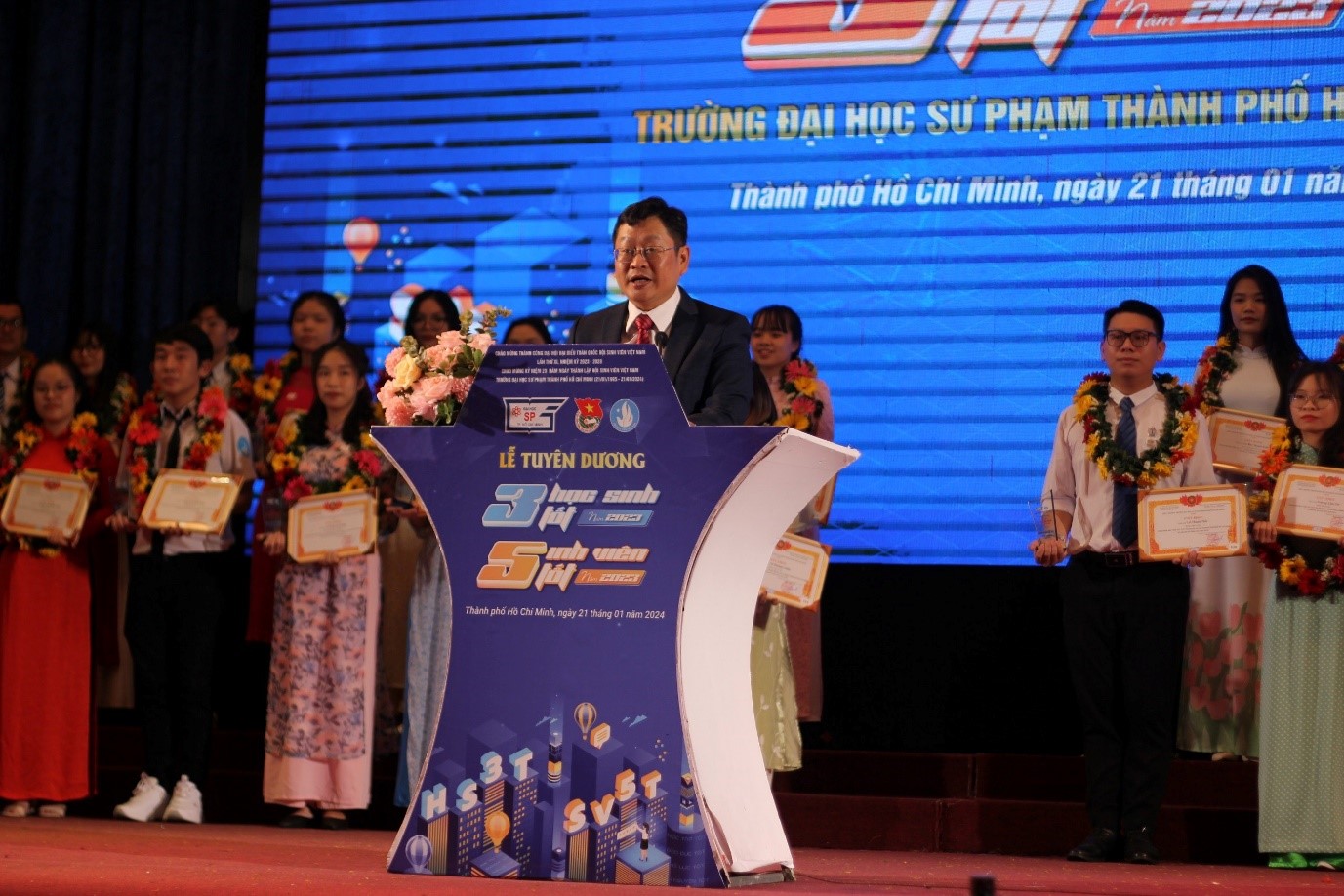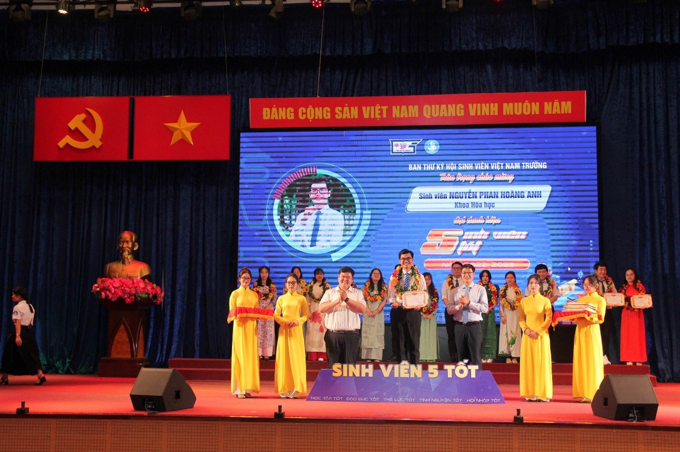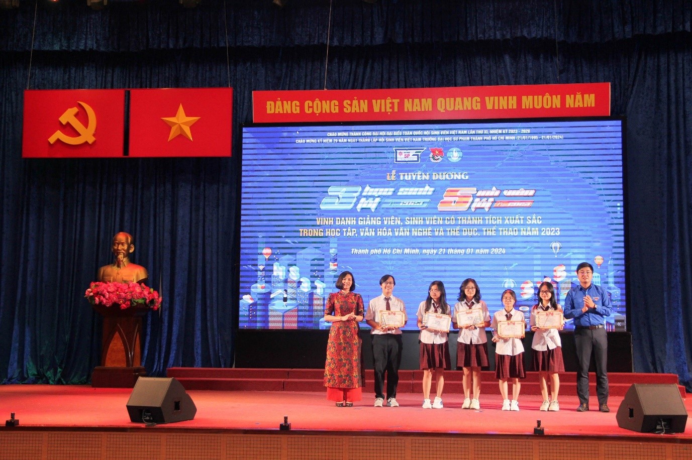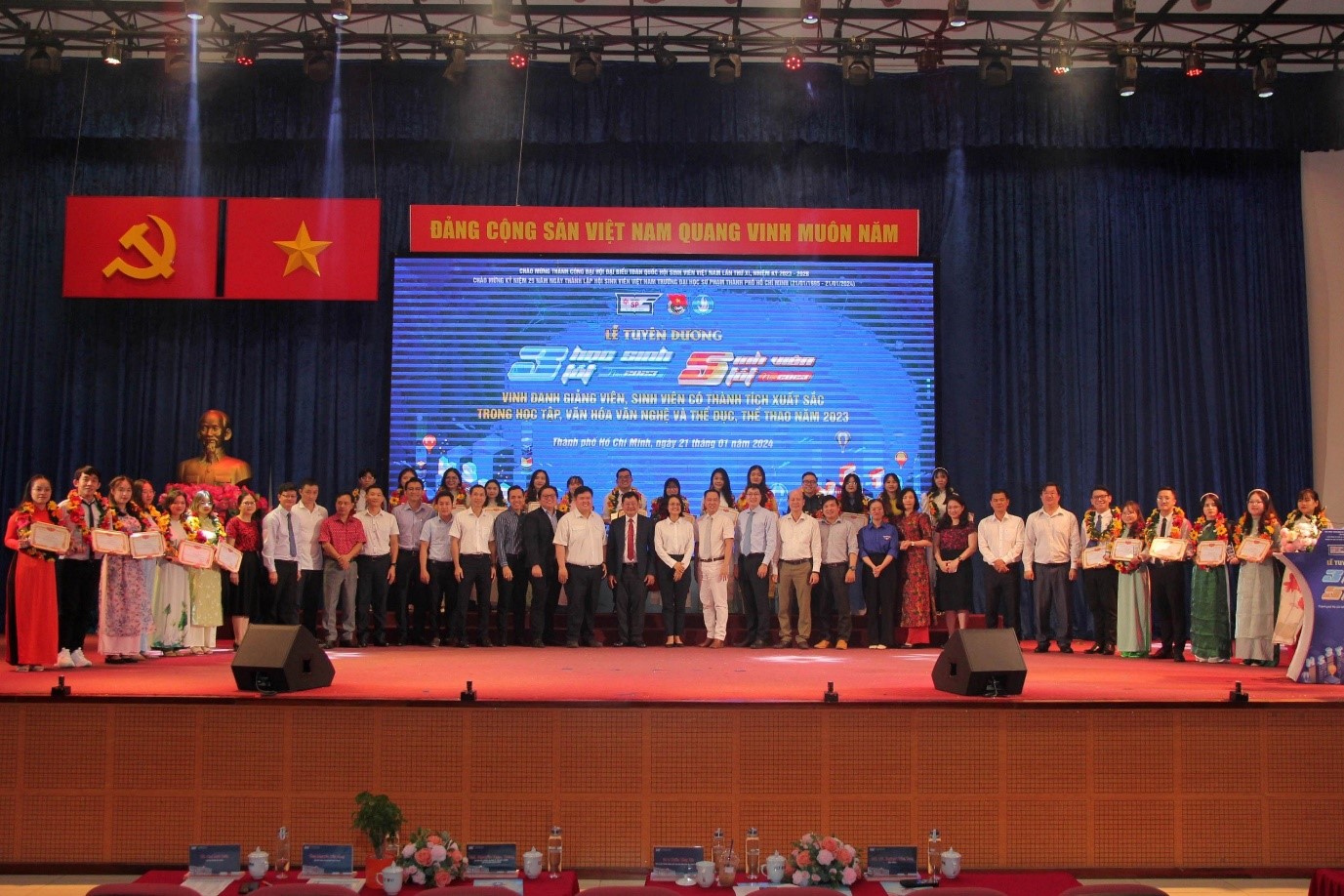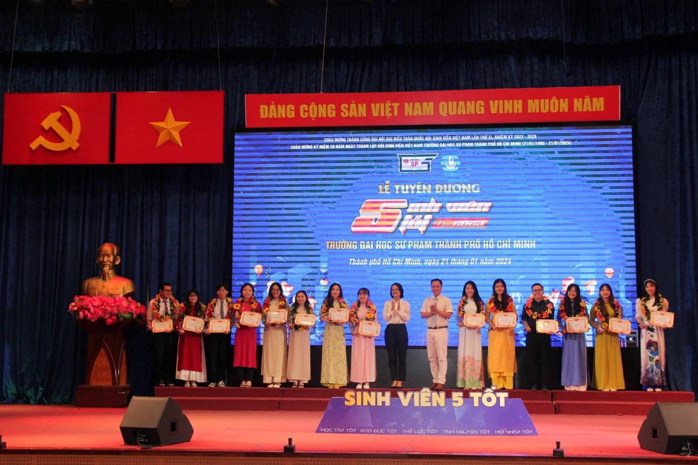 Vào chiều ngày 21/01/2024, nhân kỷ niệm 29 năm ngày thành lập Hội Sinh viên Việt Nam Trường (21/01/1995 - 21/01/2024), Ban Thư ký Hội Sinh viên Việt Nam Trường phối hợp cùng Ban Thường vụ Đoàn Trường tổ chức Lễ tuyên dương các cá nhân đạt danh hiệu “Học sinh 3 tốt”, “Sinh viên 5 tốt” các cấp và vinh danh giảng viên, sinh viên có thành tích xuất sắc trong học tập, văn hóa văn nghệ và thể dục, thể thao năm 2023.