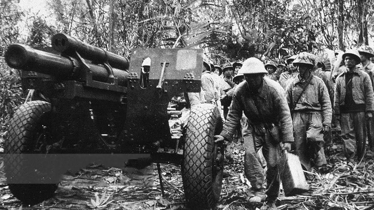 Bộ đội ta kéo những khẩu pháo nặng hàng chục tấn vượt núi, xuyên rừng vào chiến trường Điện Biên Phủ.